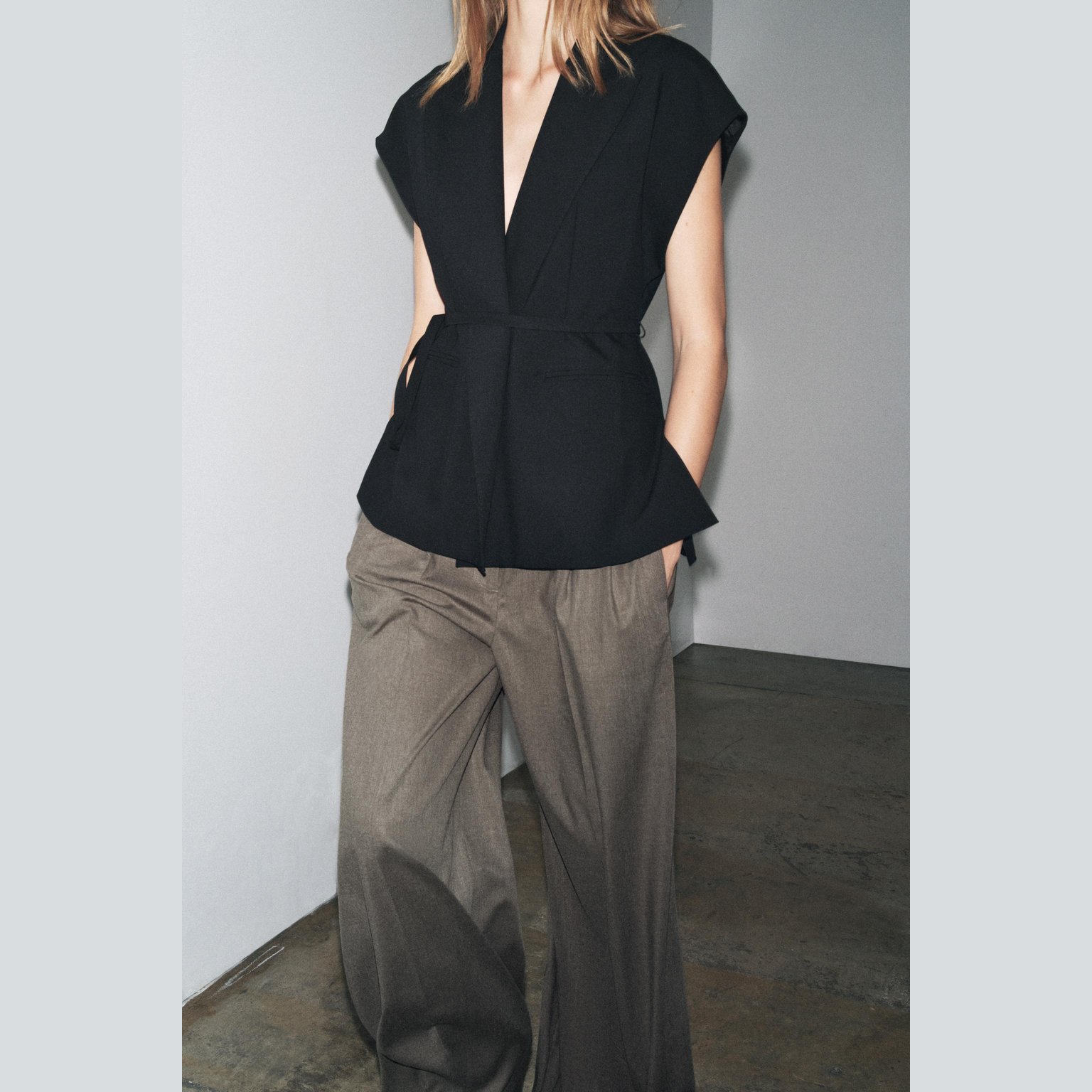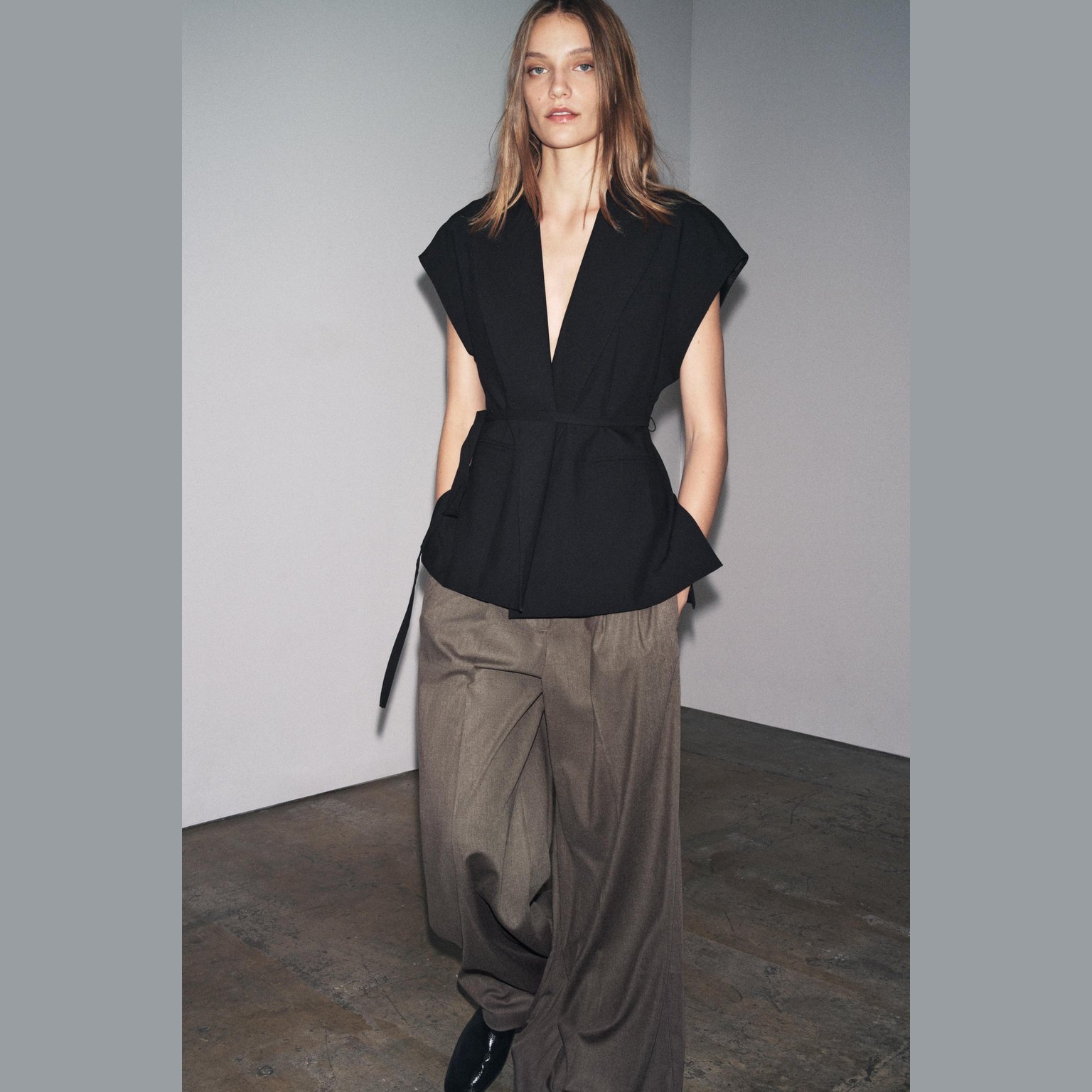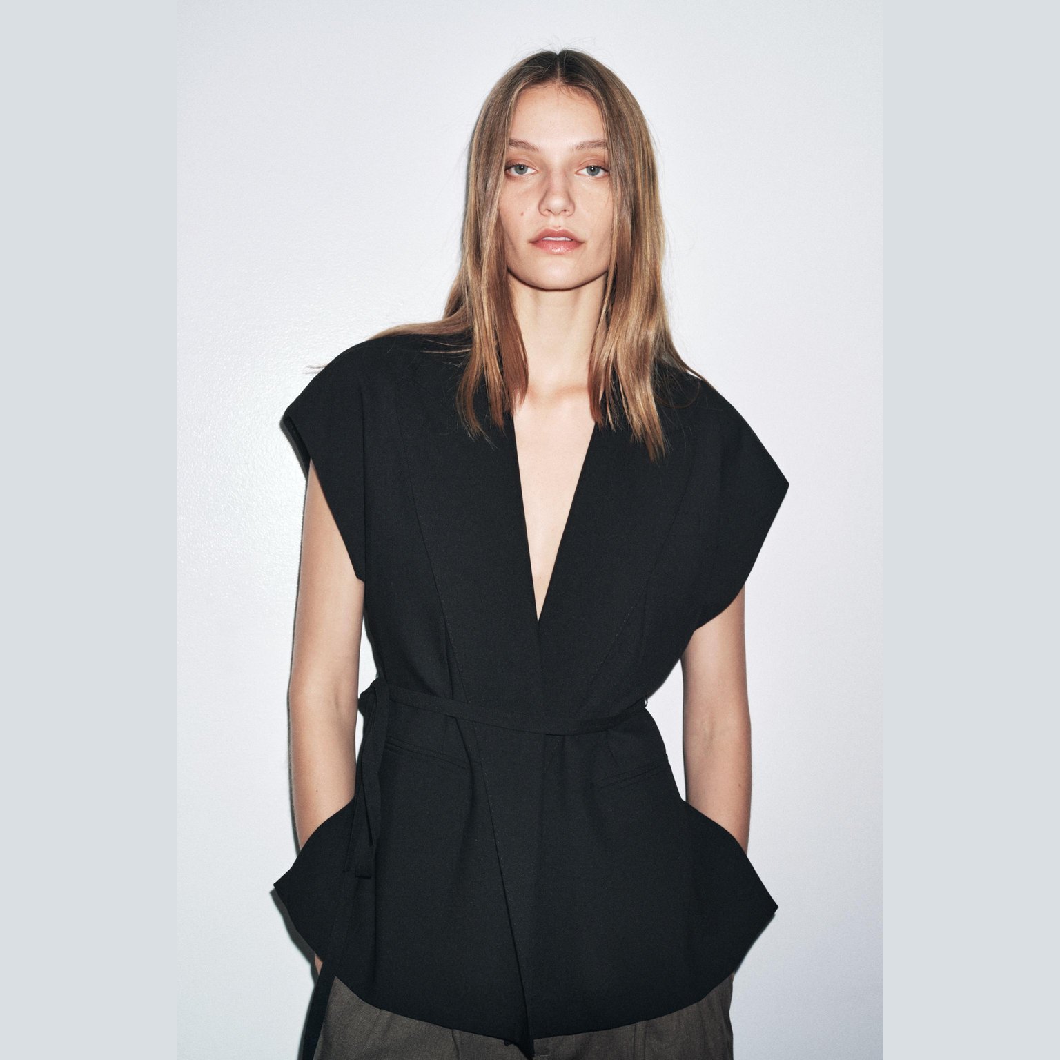 فيست أنيق من مجموعة ZW بلون أسود طبيعي، مصنوع من خامة ممزوجة تمنح مظهرًا عصريًا وملمسًا عمليًا، مع بطانة داخلية من الفيسكوز لراحة إضافية. يتميز بياقة عريضة، أكتاف ساقطة، حزام مطابق من نفس القماش مع أربطة، وبطانة داخلية بلون متناغم. تصميم مثالي للإطلالات الرسمية أو الكاجوال الأنيقة.