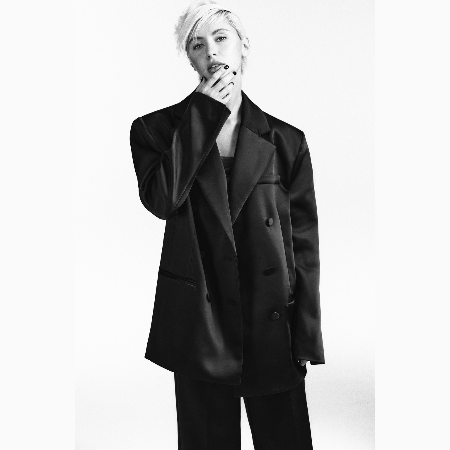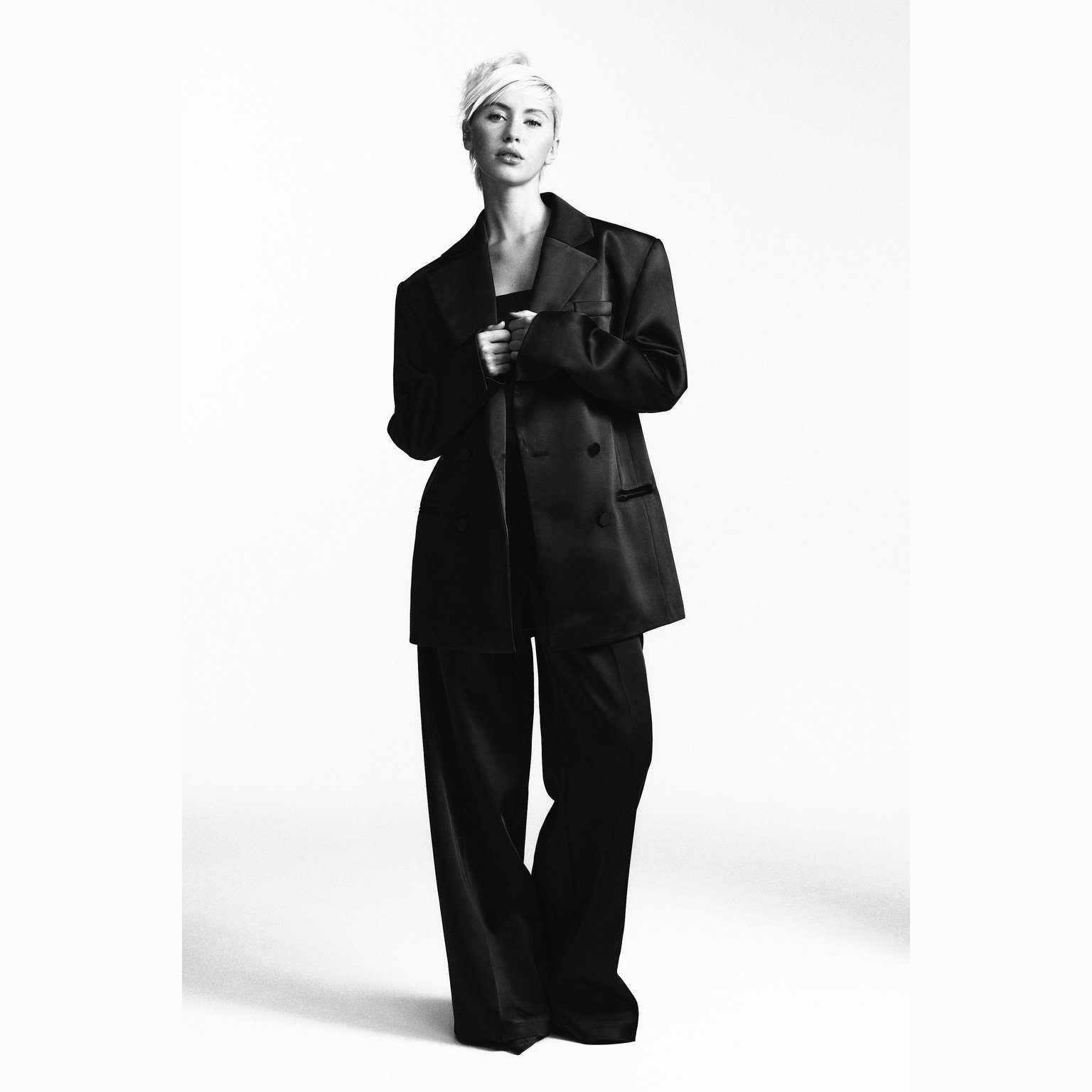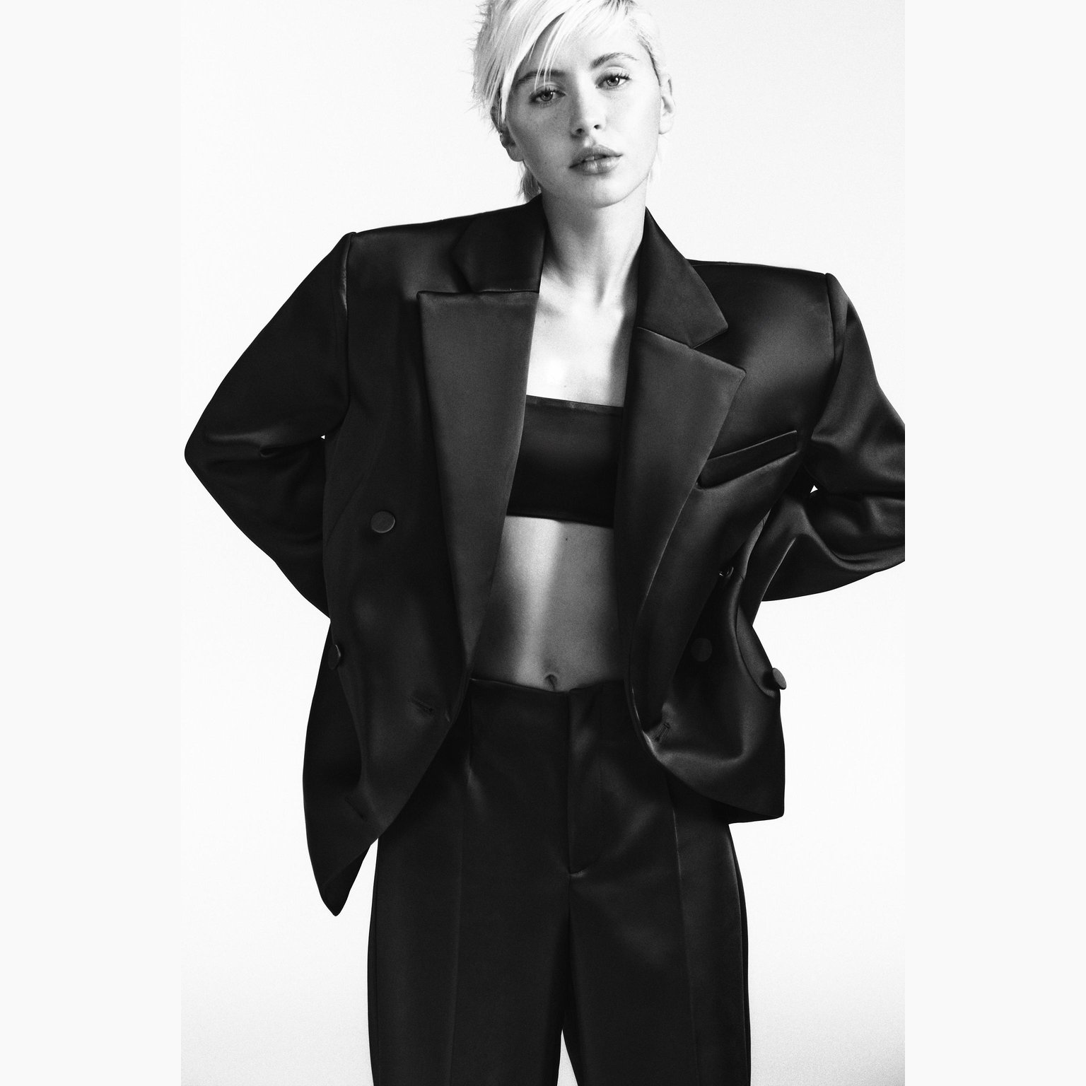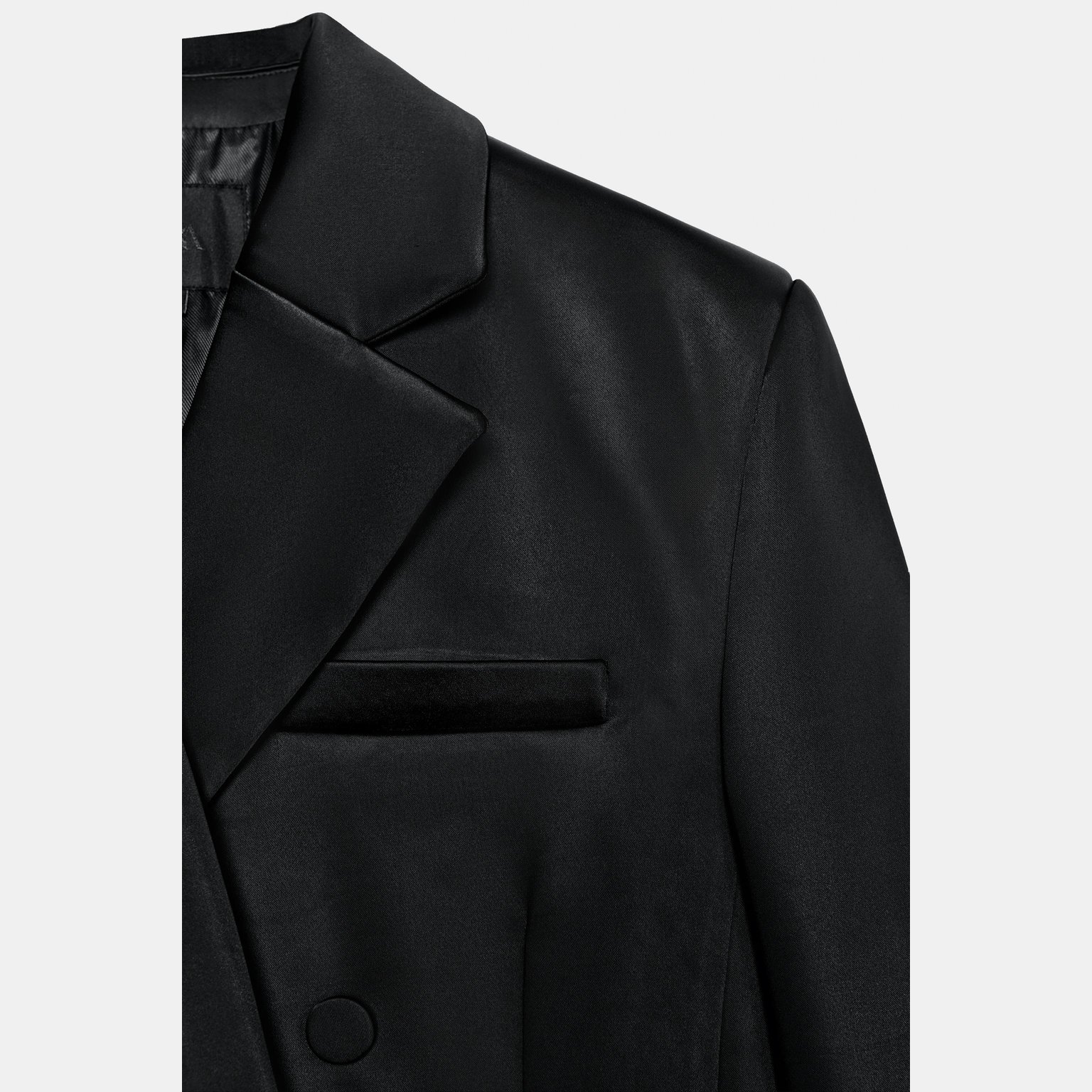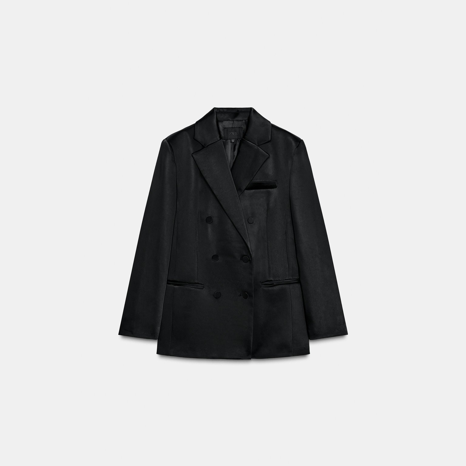 - التصميم: بليزر ساتان مع جيوب (Satin Pocket Blazer)