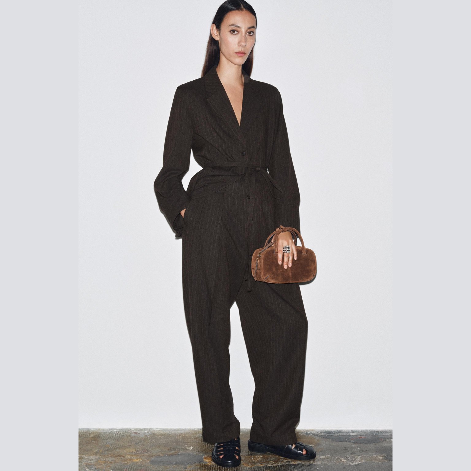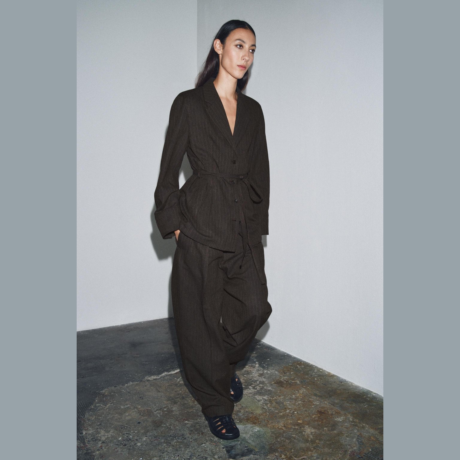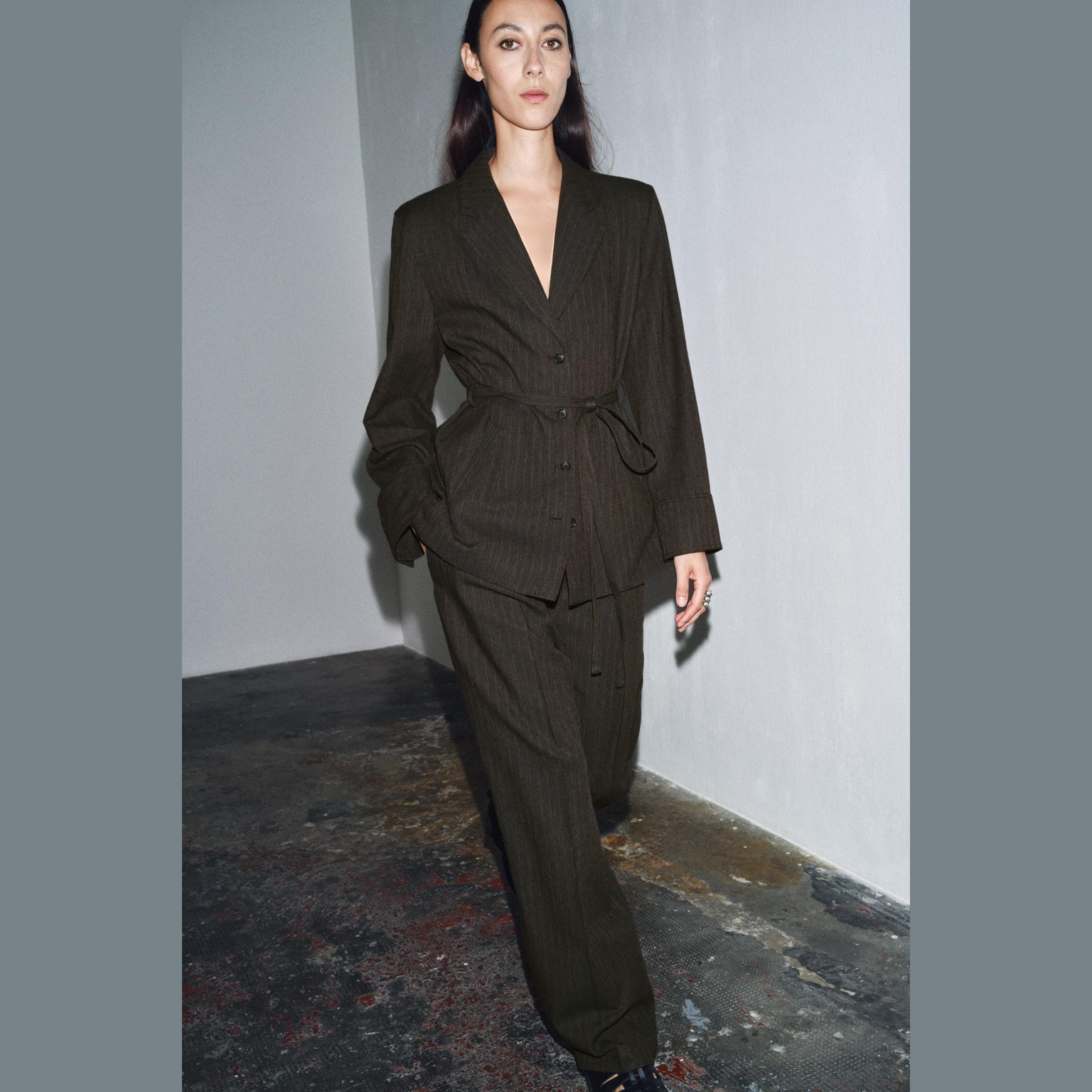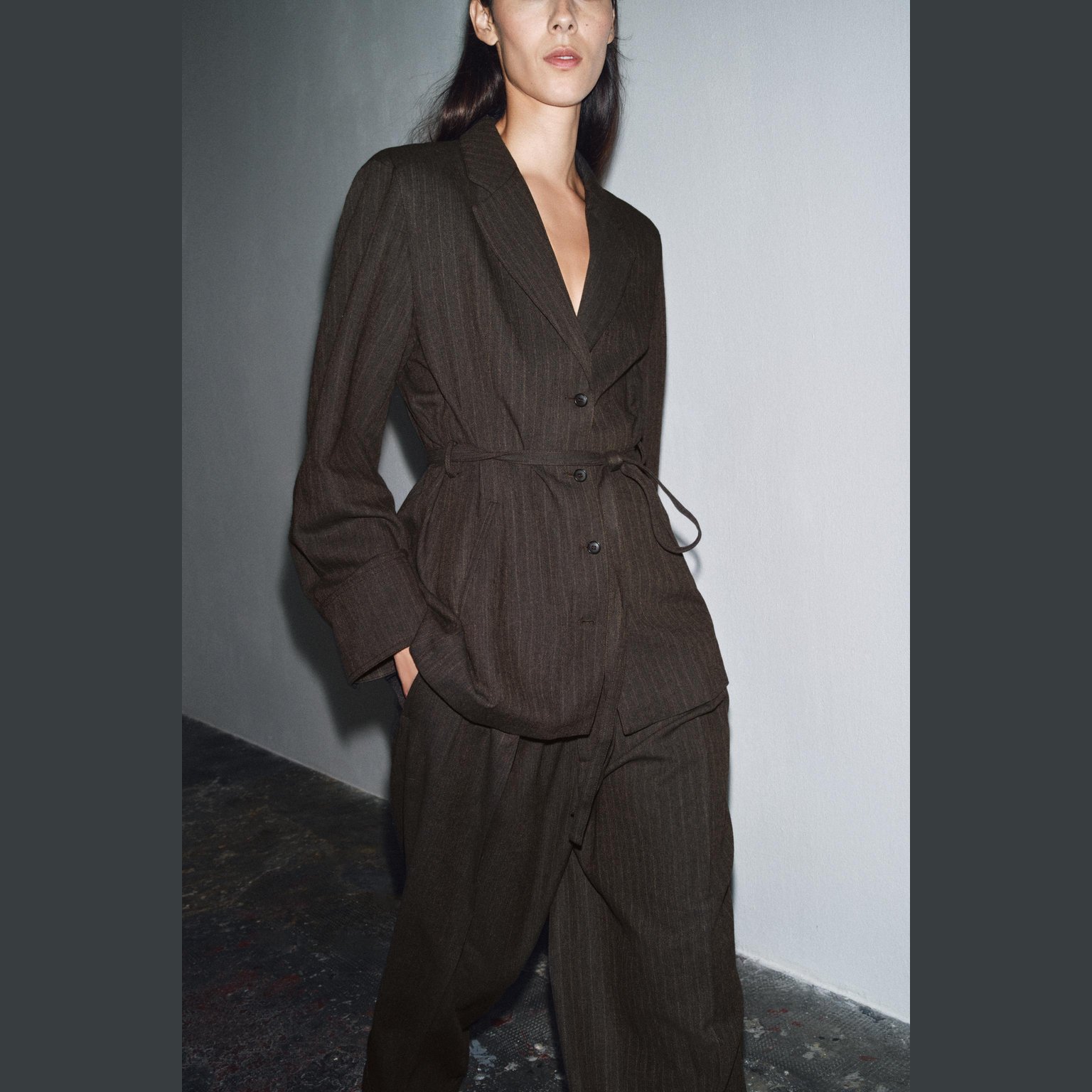- التصميم: بليزر بخامة هيرينغبون مع حزام (Herringbone Blazer with Belt – ZW Collection)