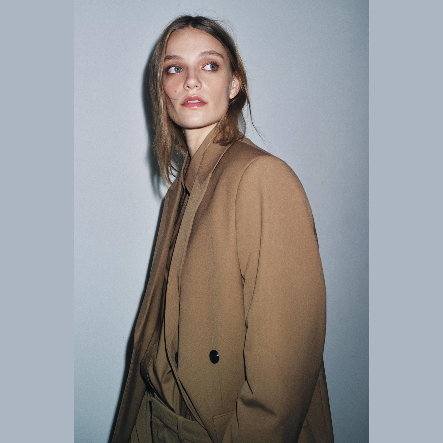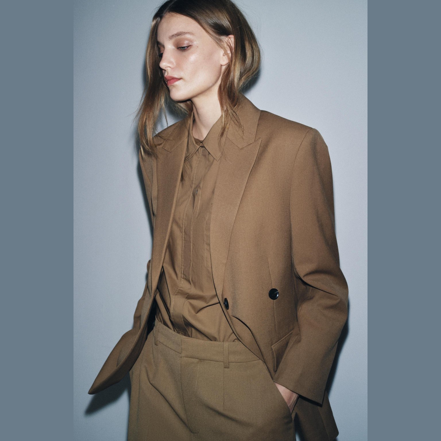 بليزر أوفرسايز أنيق من مجموعة ZW بلون كاراميل طبيعي، مصنوع من خامة ممزوجة تمنح مظهرًا عصريًا وملمسًا عمليًا، مع بطانة داخلية من الفيسكوز لراحة إضافية. يتميز بياقة عريضة، أكمام طويلة، جيوب أمامية بغطاء، بطانة داخلية متناسقة، وإغلاق أمامي مزدوج الأزرار. تصميم مثالي للإطلالات الرسمية أو الكاجوال الأنيقة.