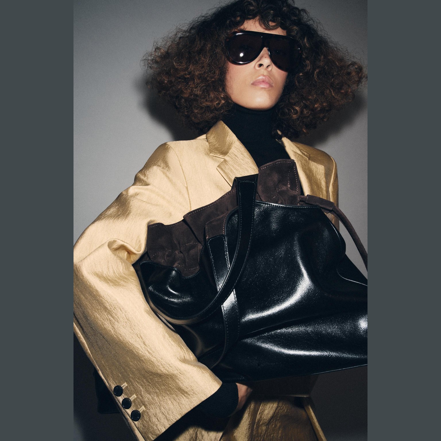 - التصميم: بليزر قصير ميتاليك (Metallic Cropped Blazer – ZW Collection)