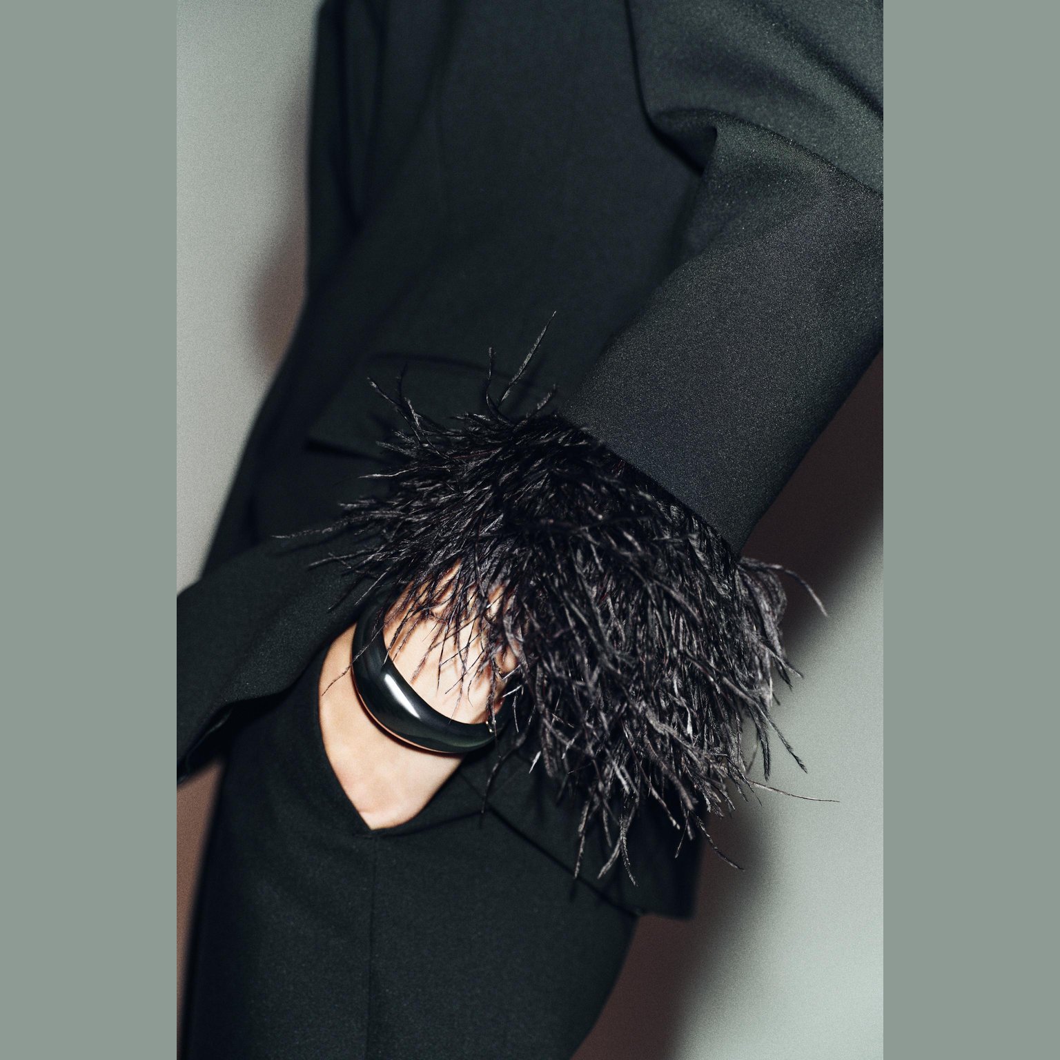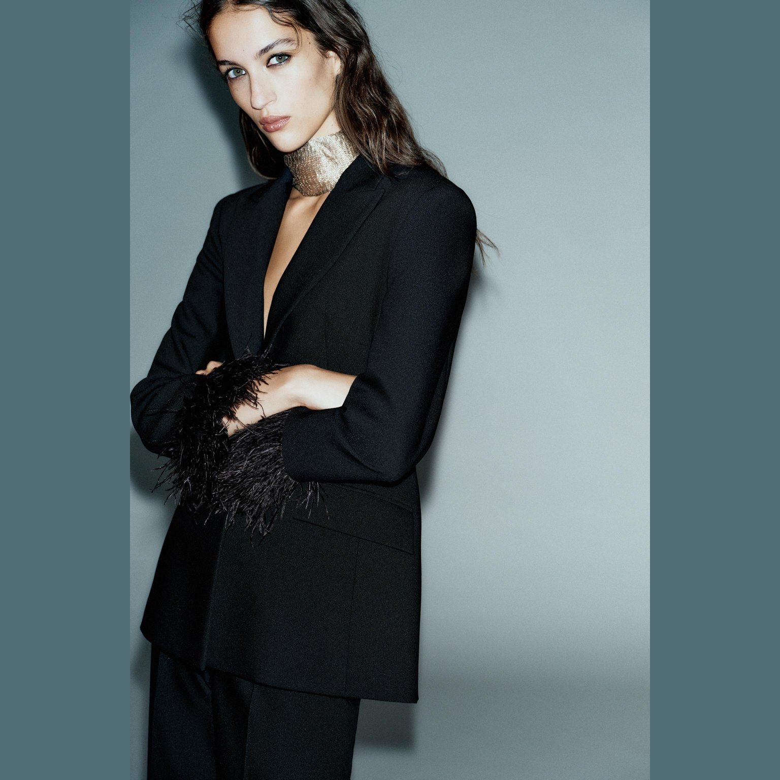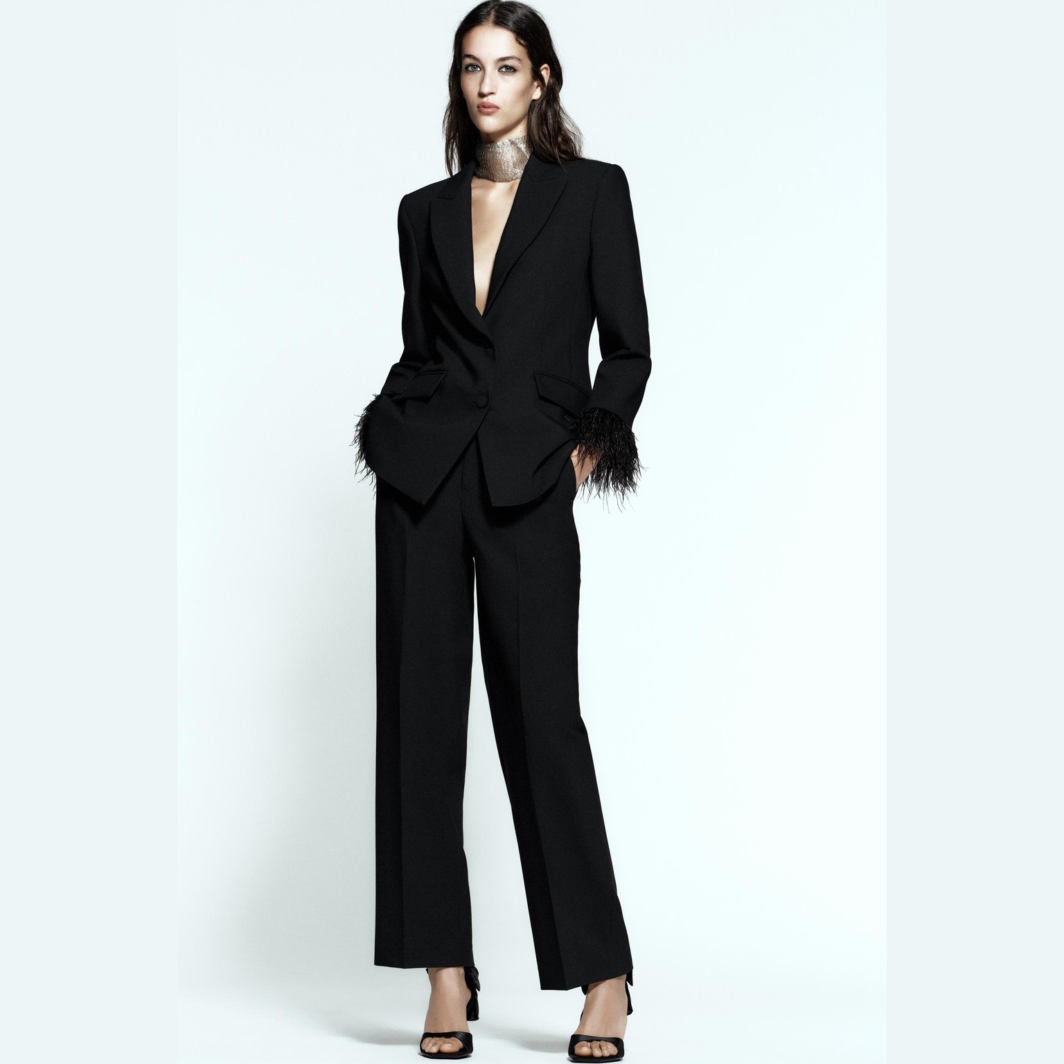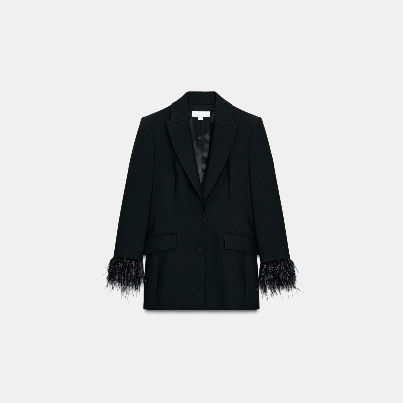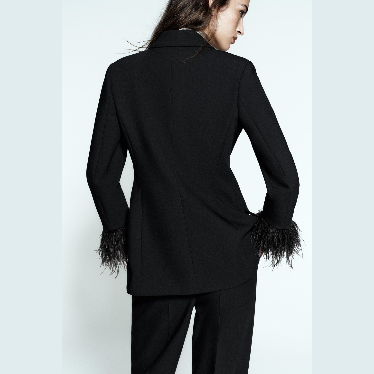 - التصميم: بليزر مزين بالريش (Feather Blazer)