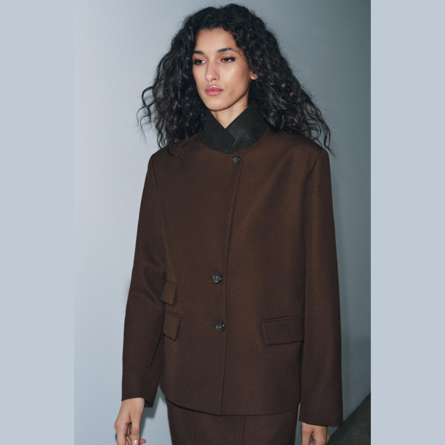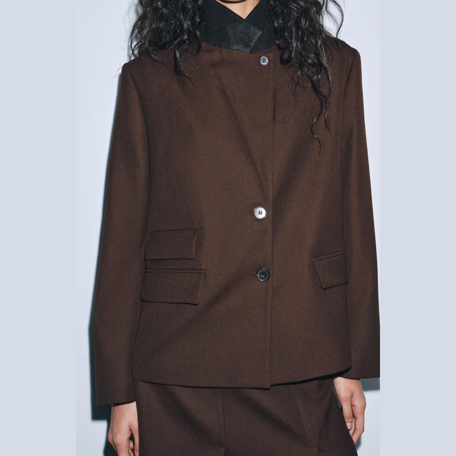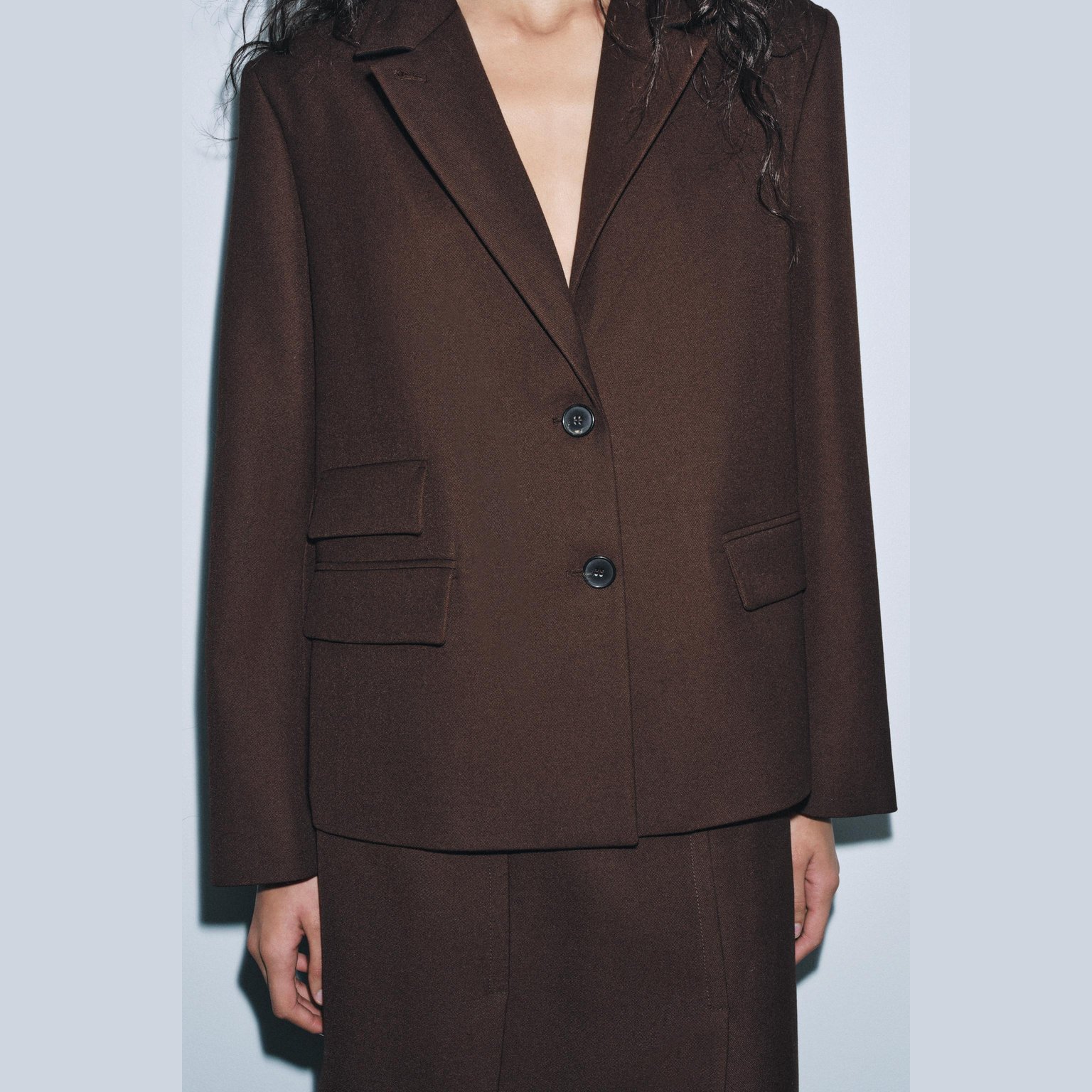بليزر أنيق من مجموعة ZW بلون بني طبيعي، مصنوع من خامة ممزوجة تمنح مظهرًا عصريًا وملمسًا عمليًا، مع بطانة داخلية من الفيسكوز لراحة إضافية. يتميز بياقة عريضة، أكمام طويلة مع فتحات وأزرار عند الأطراف، جيوب أمامية بغطاء، حاشية مستديرة، وإغلاق أمامي بأزرار. تصميم مثالي للإطلالات الرسمية أو الكاجوال الأنيقة.