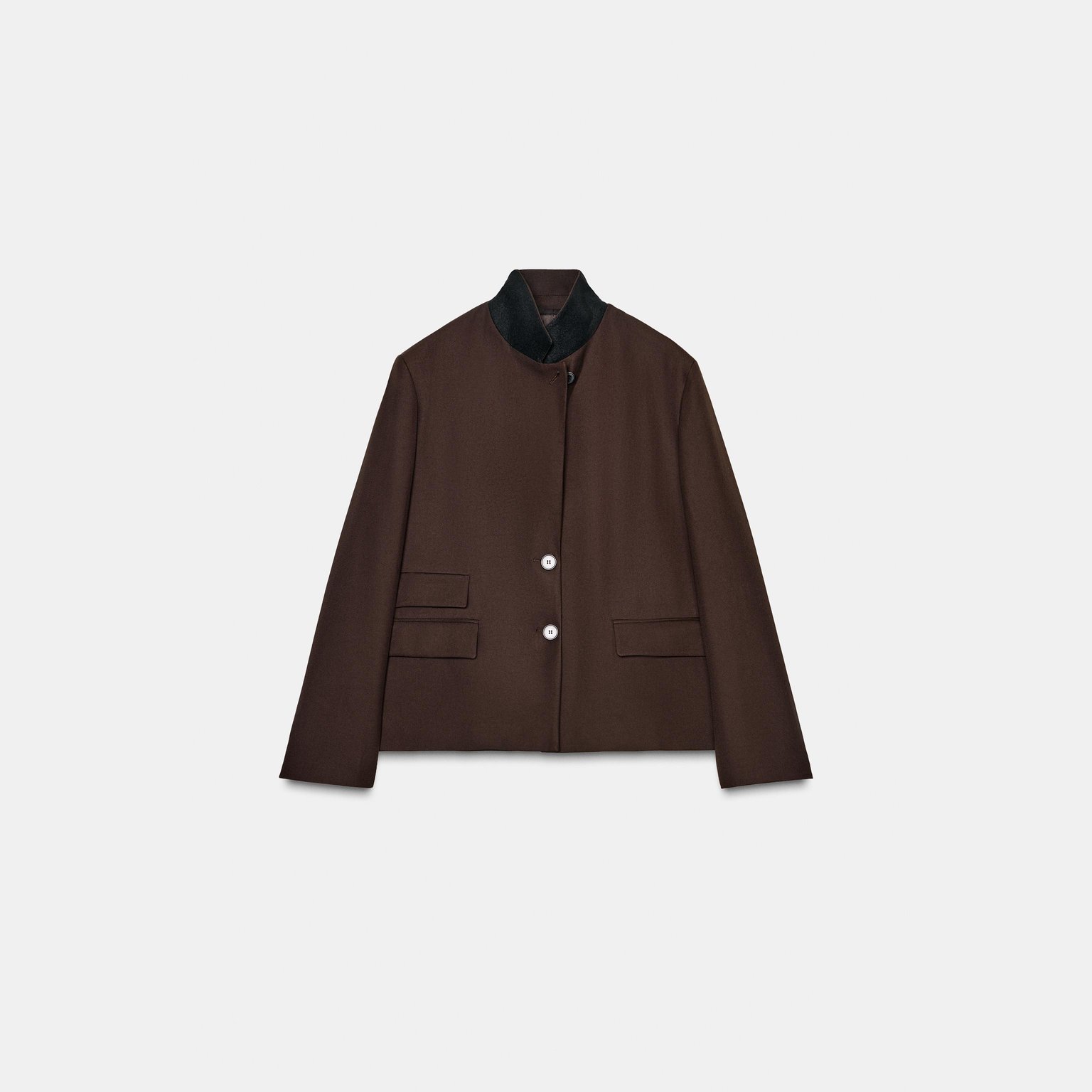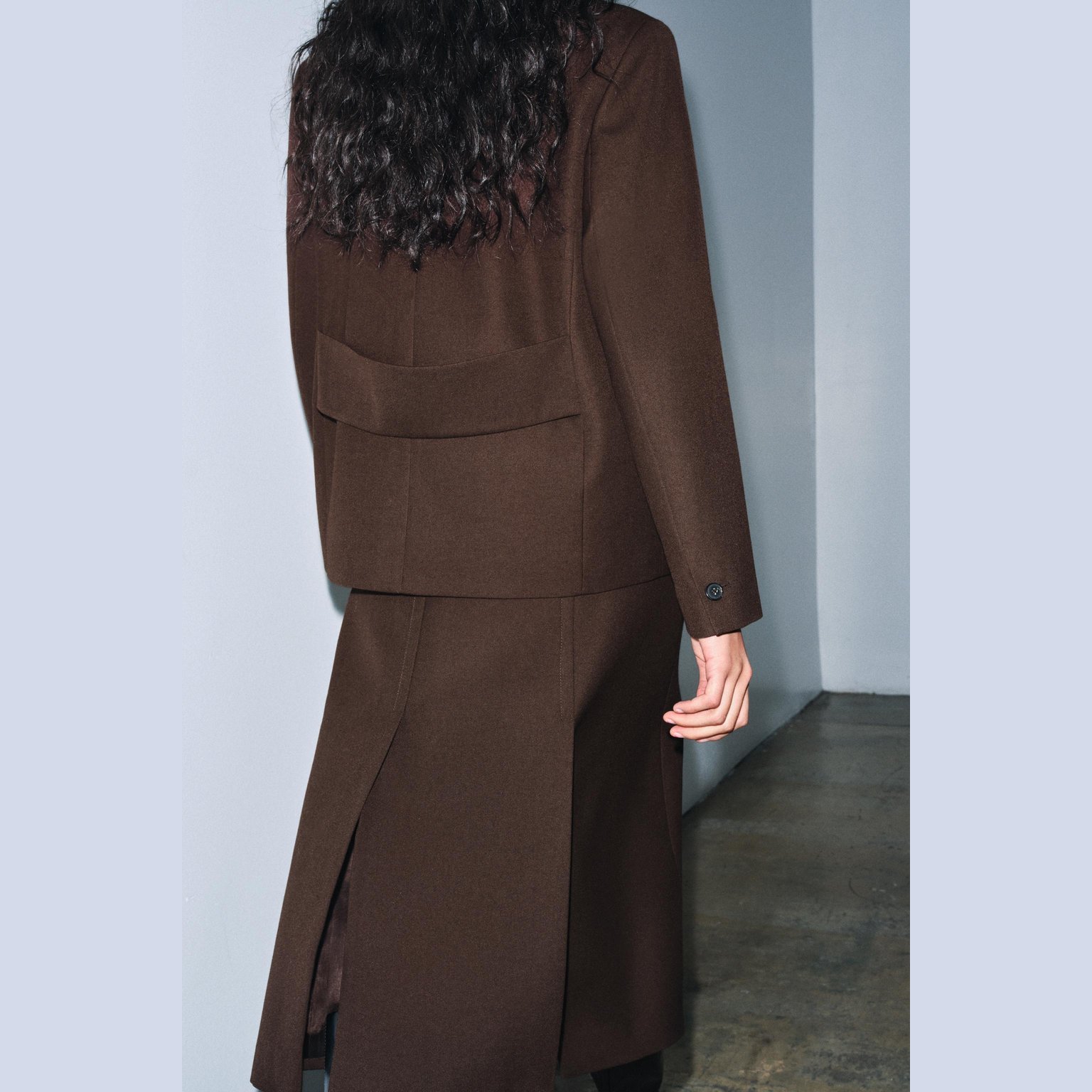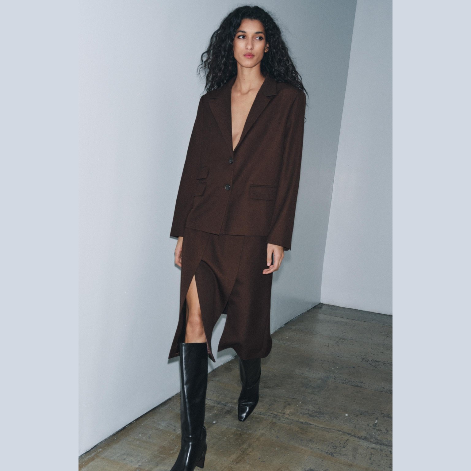 بليزر أنيق من مجموعة ZW بلون بني طبيعي، مصنوع من خامة ممزوجة تمنح مظهرًا عصريًا وملمسًا عمليًا، مع بطانة داخلية من الفيسكوز لراحة إضافية. يتميز بياقة عريضة، أكمام طويلة مع فتحات وأزرار عند الأطراف، جيوب أمامية بغطاء، حاشية مستديرة، وإغلاق أمامي بأزرار. تصميم مثالي للإطلالات الرسمية أو الكاجوال الأنيقة.