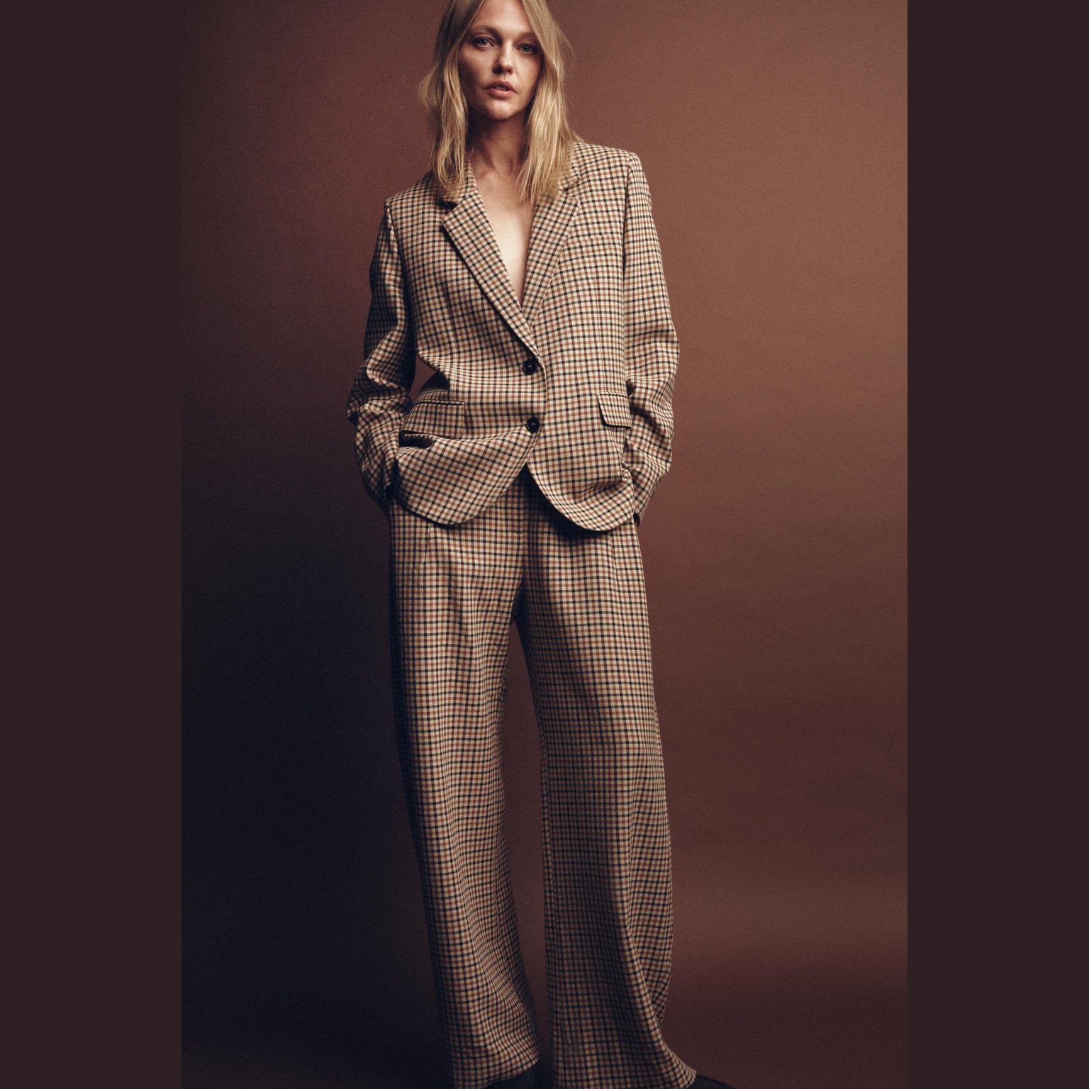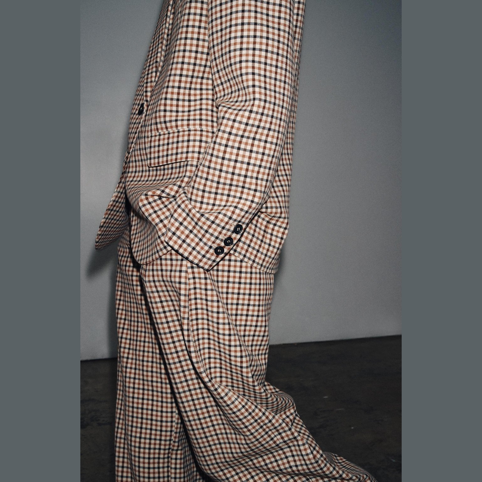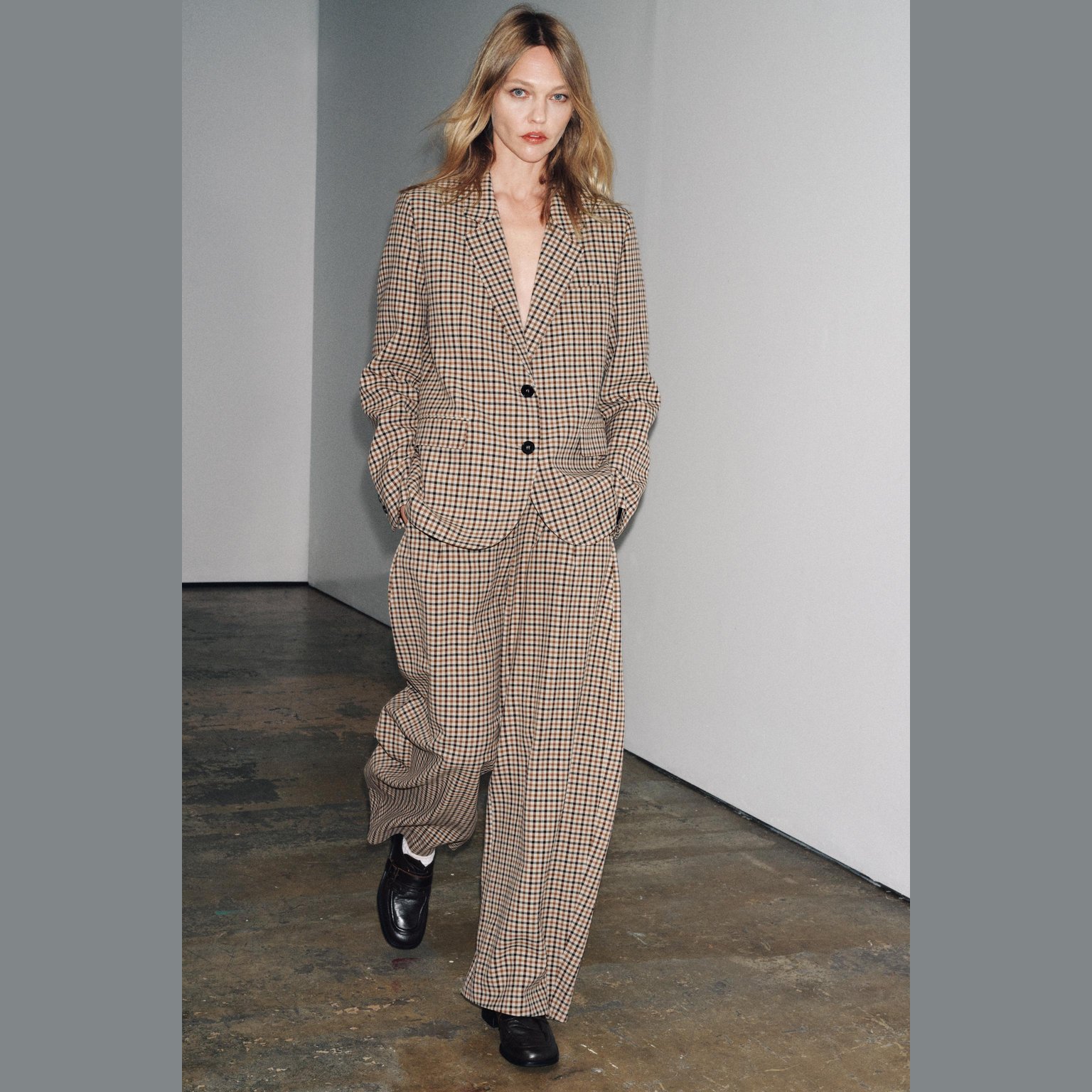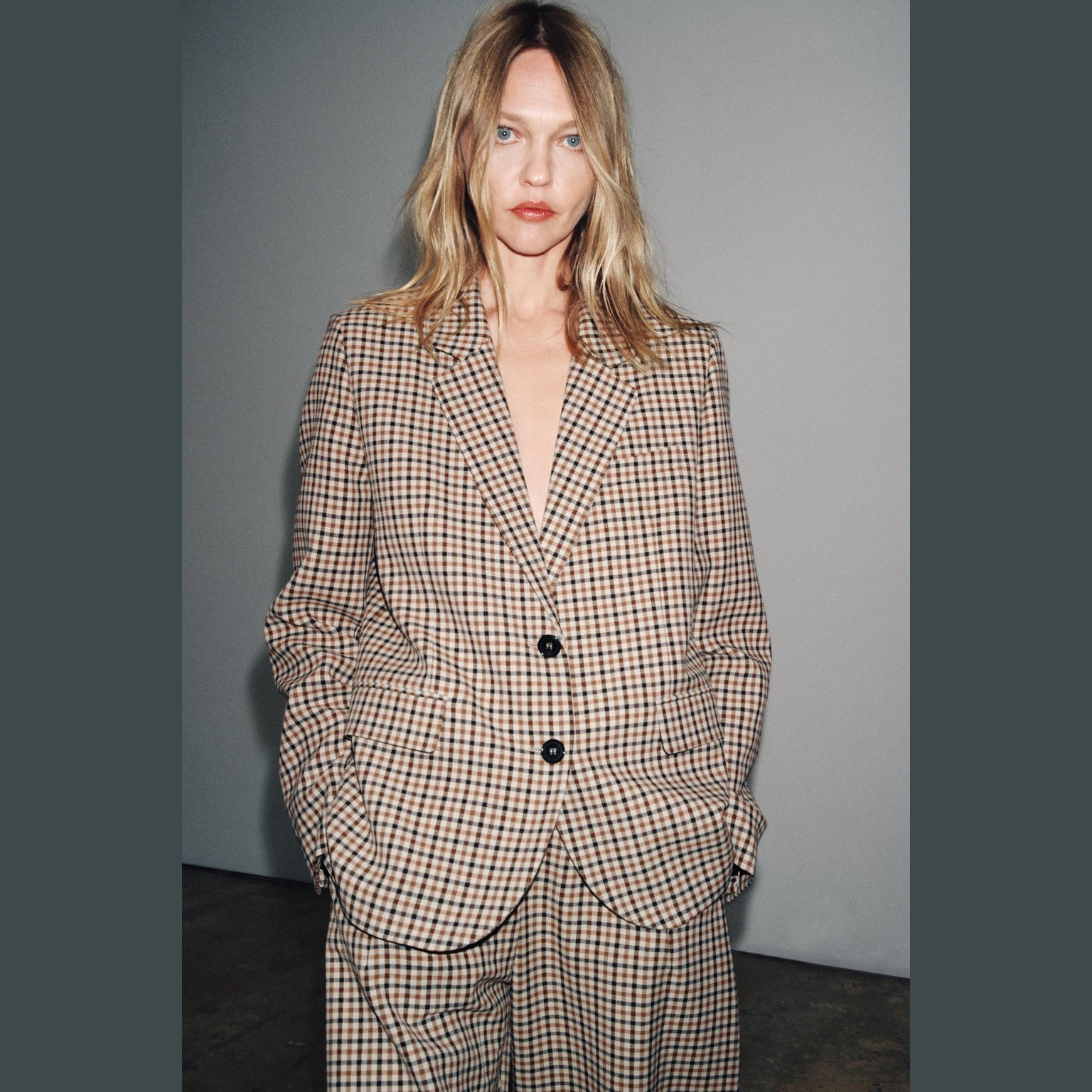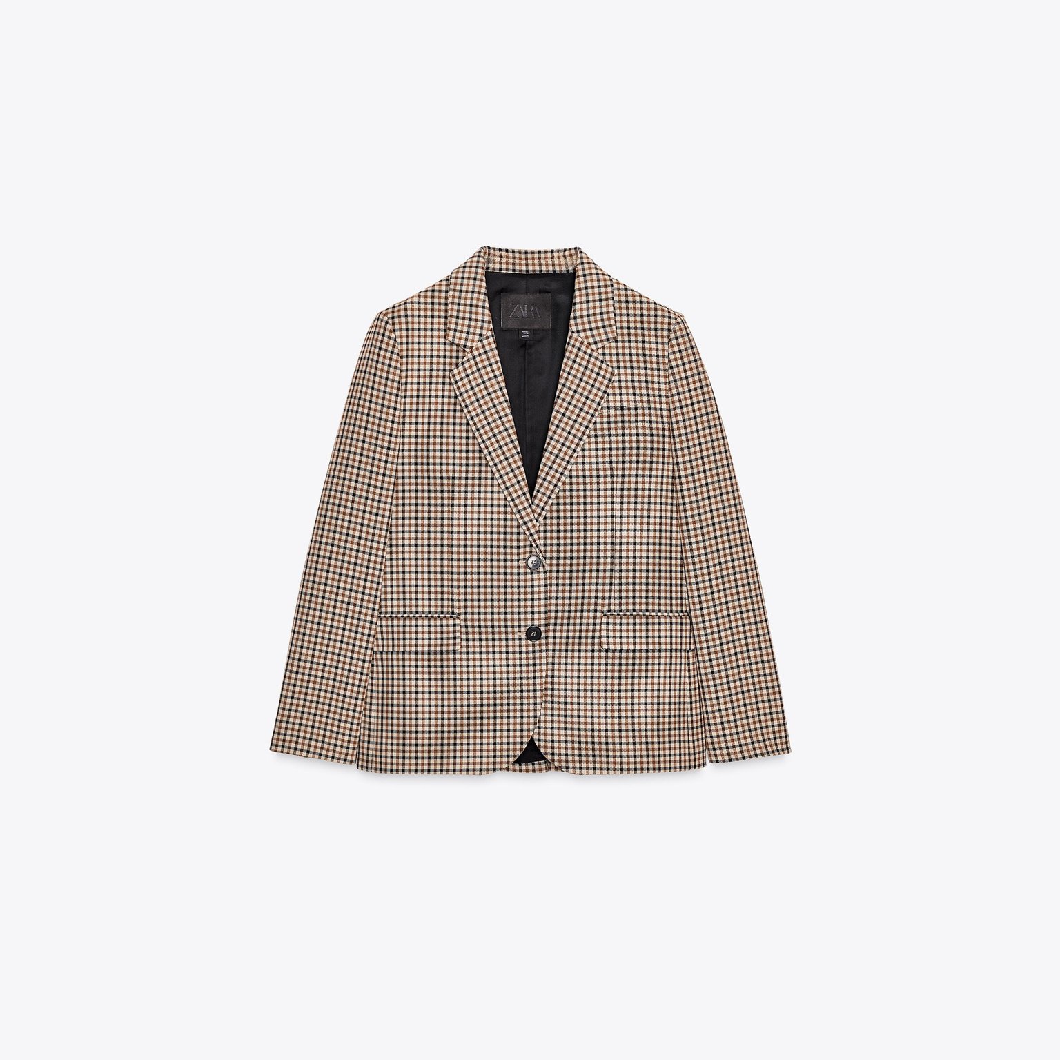 - التصميم: بليزر مستقيم بنقشة مربعات (Check Straight Blazer – ZW Collection)