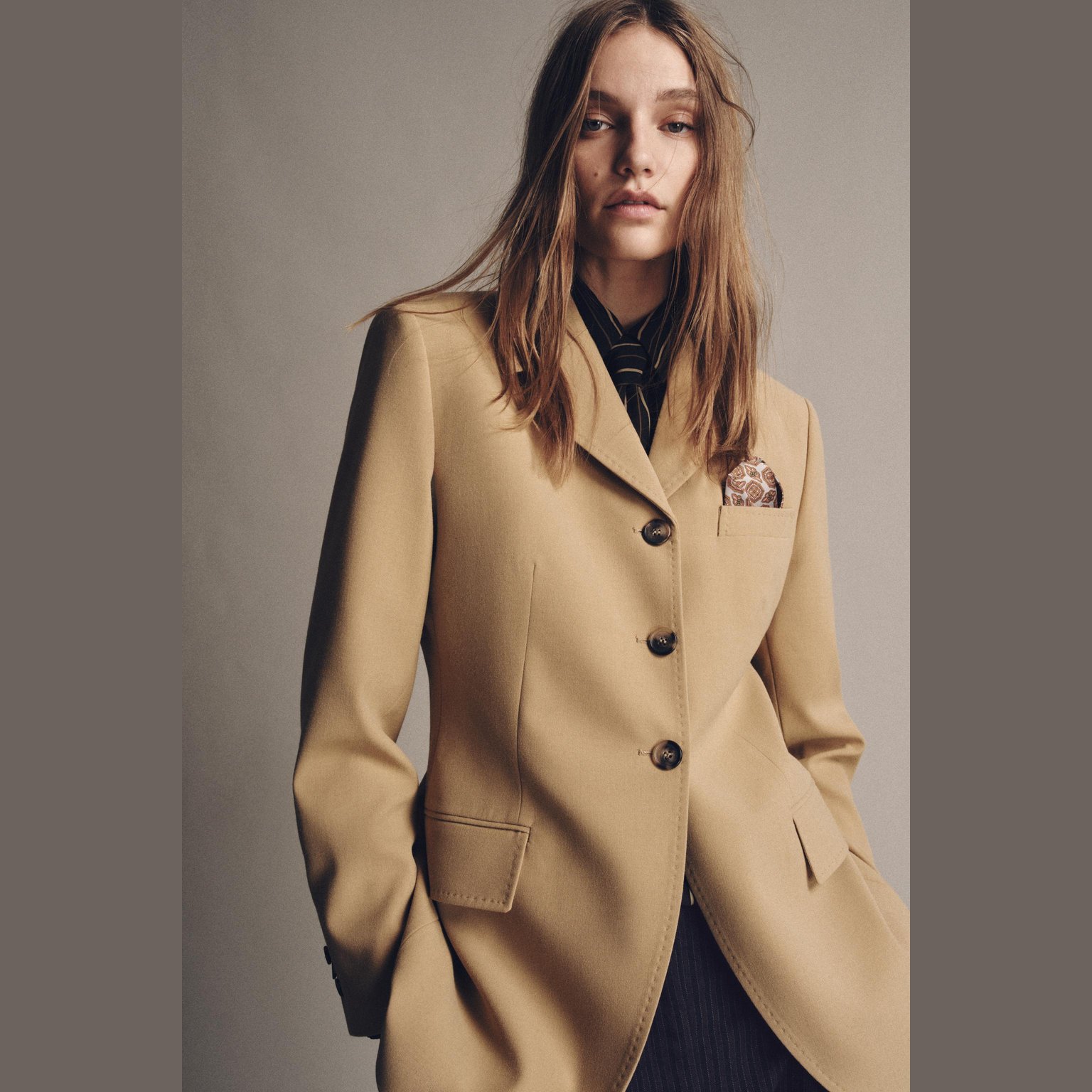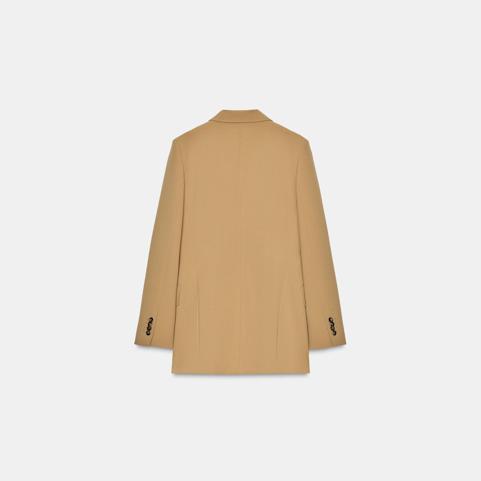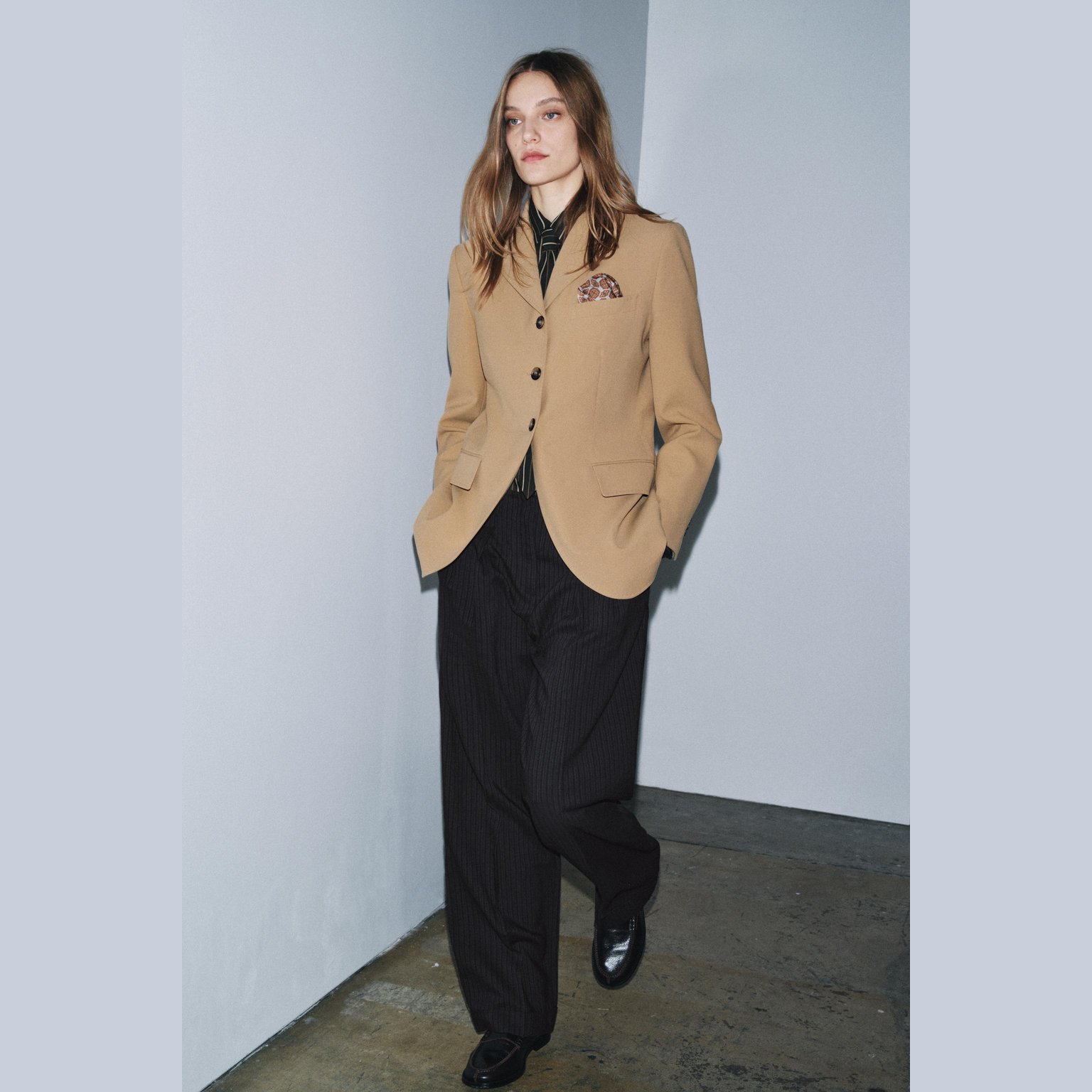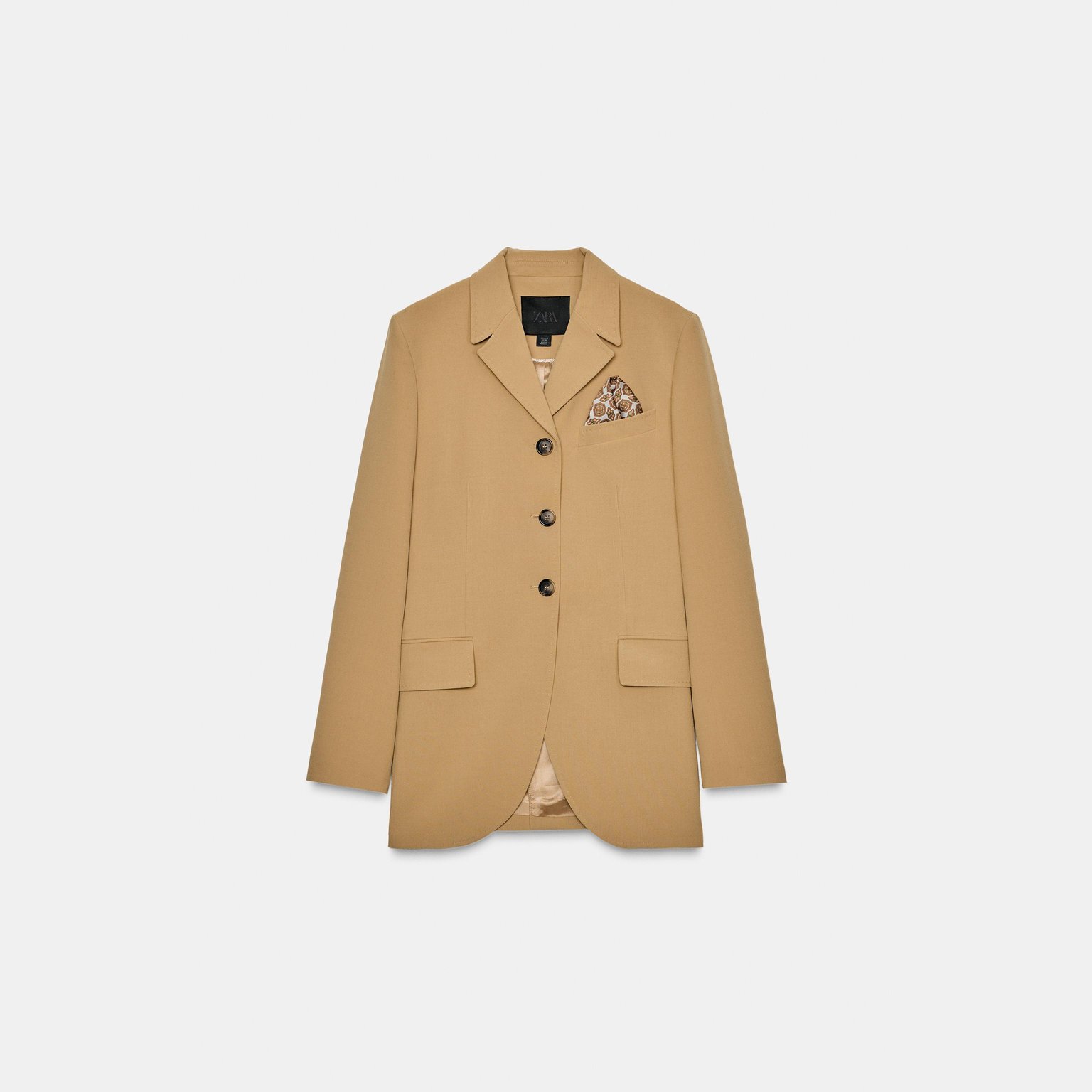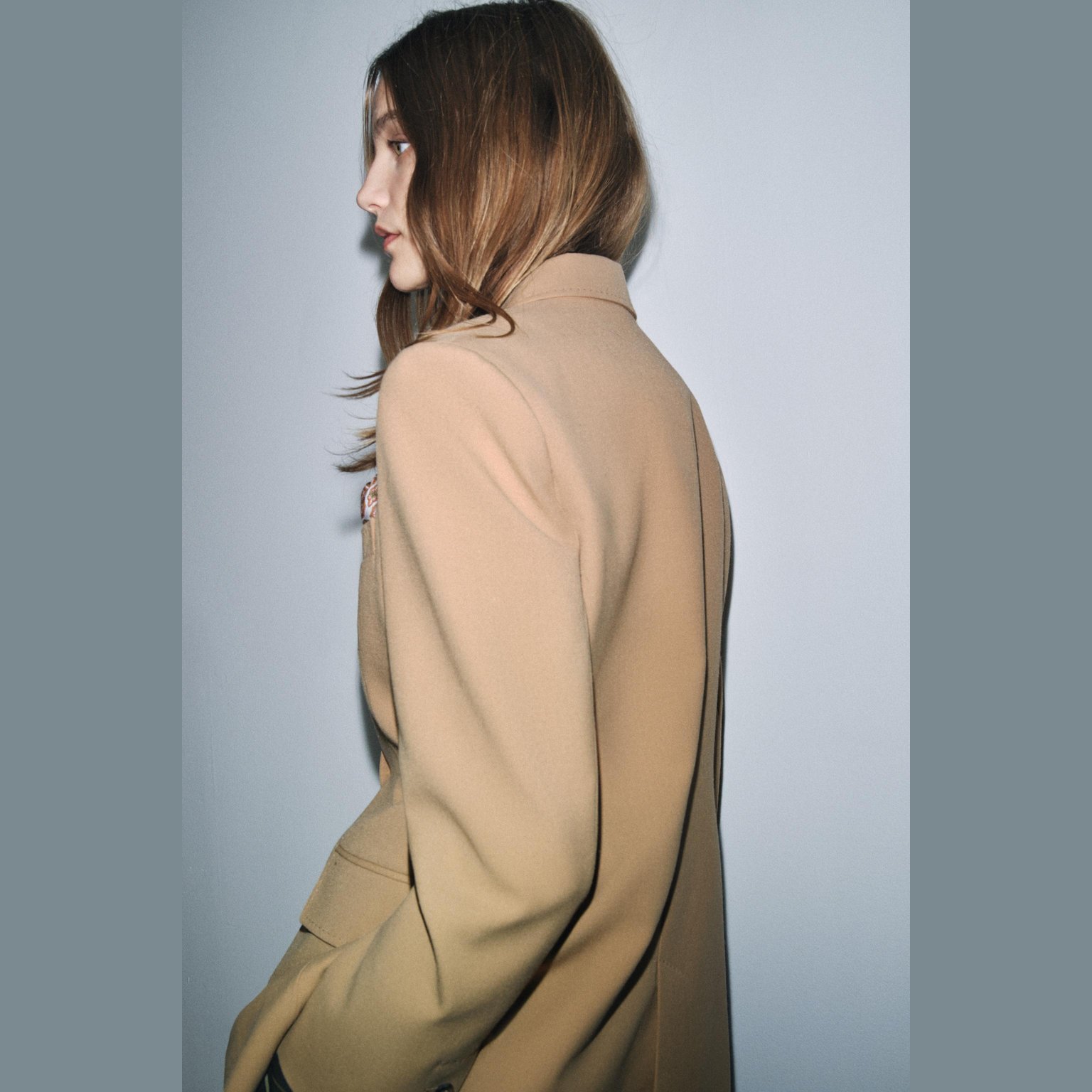 بليزر أنيق من مجموعة ZW بلون جملي فاتح طبيعي، مصنوع من خامة ممزوجة تمنح مظهرًا عصريًا وملمسًا عمليًا، مع بطانة داخلية من الفيسكوز لراحة إضافية. يتميز بياقة عريضة، أكمام طويلة مع فتحات وأزرار عند الأطراف، جيوب أمامية بغطاء، بطانة داخلية متناسقة، وشاح متباين كعنصر تصميم مميز، وإغلاق أمامي بزر واحد. تصميم مثالي للإطلالات الرسمية أو الكاجوال الأنيقة.