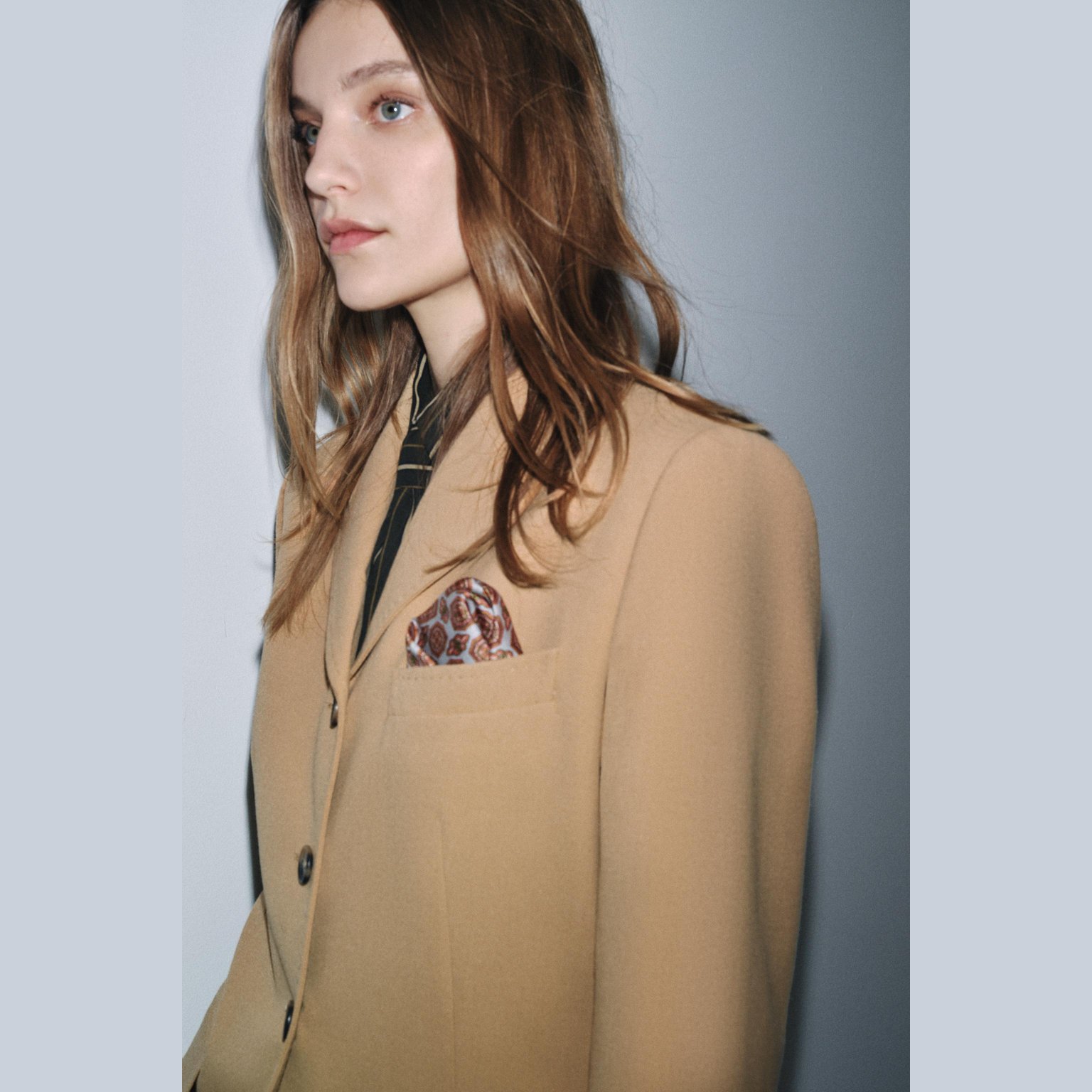 - التصميم: بليزر بقصة ضيقة مع وشاح متباين (Fitted Blazer with Contrast Scarf – ZW Collection)