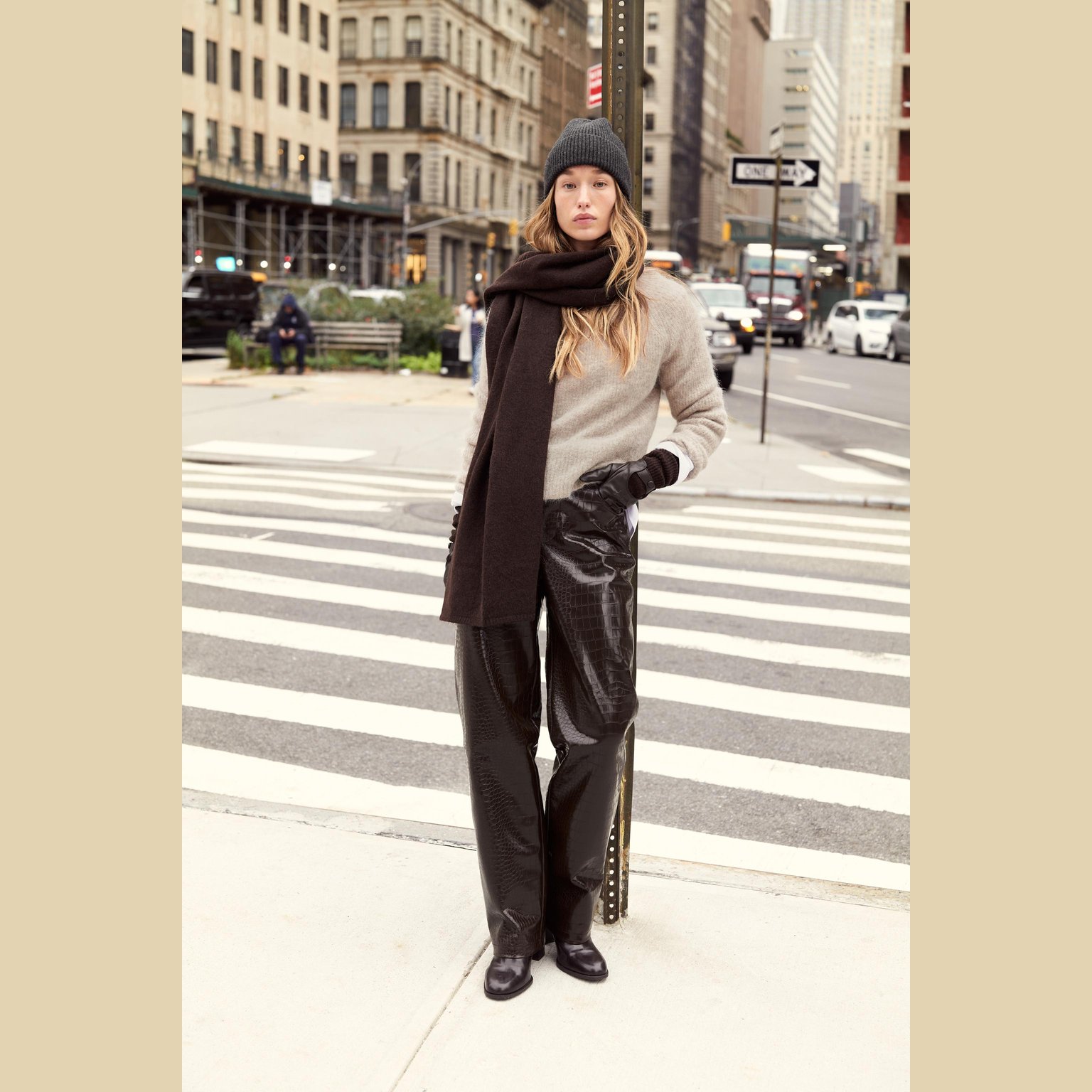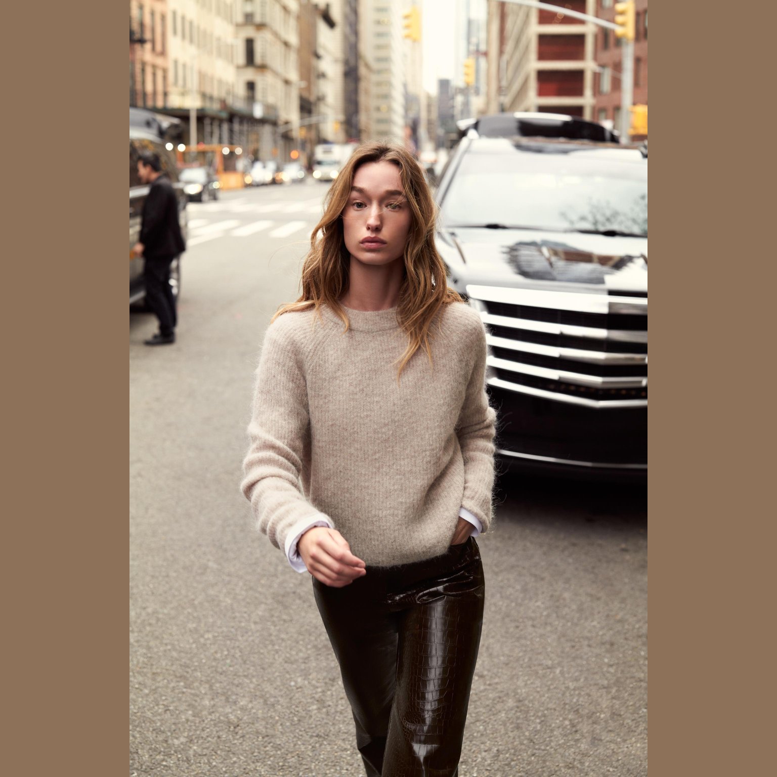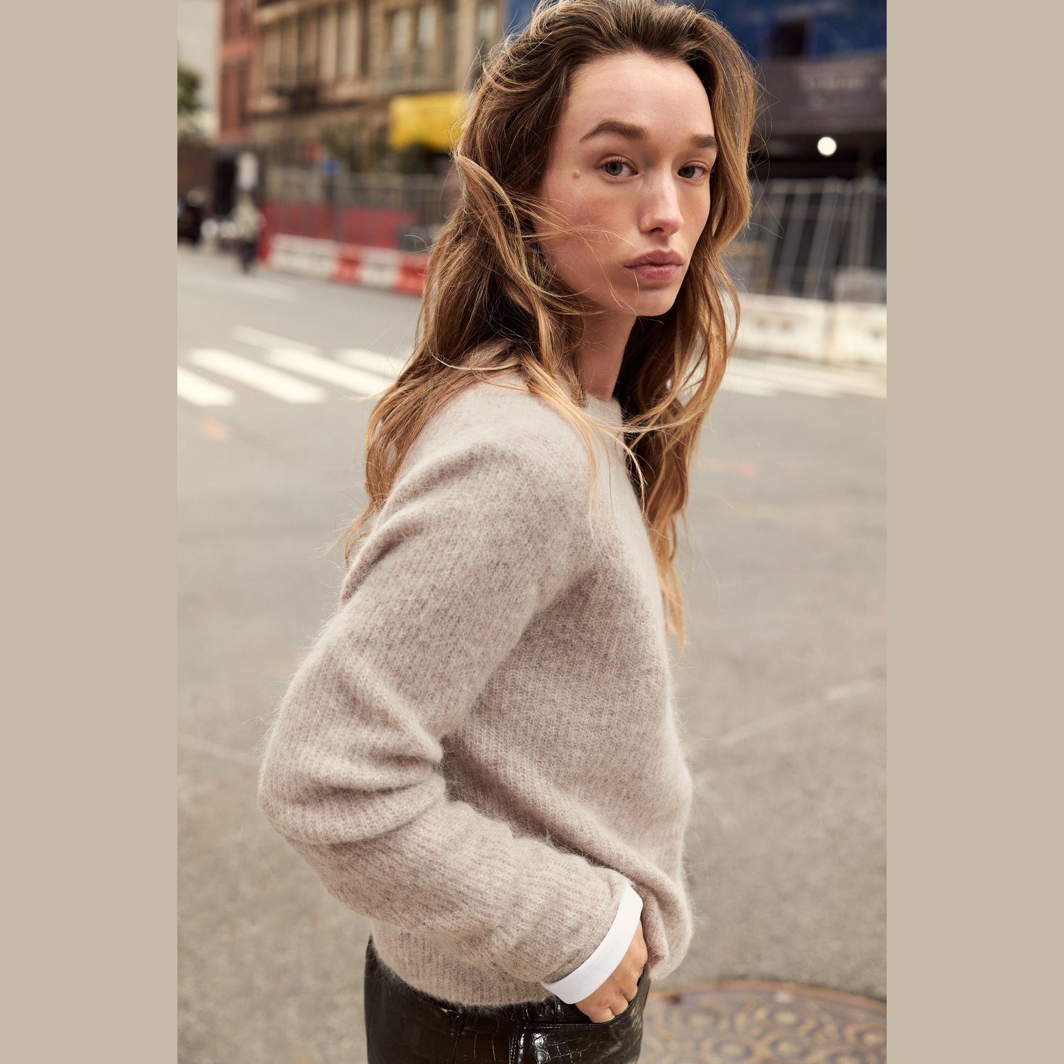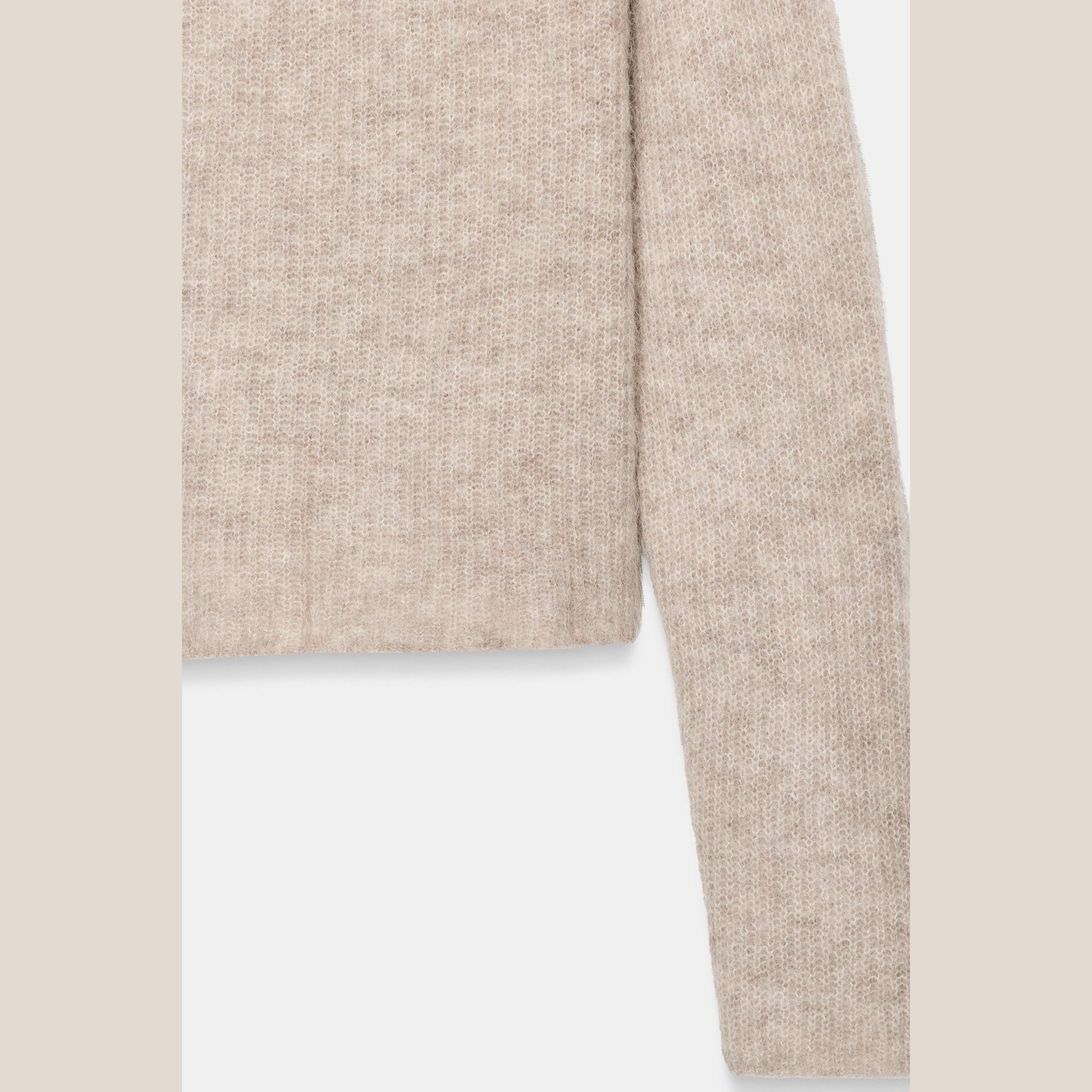 سويتر أنيق بلون رملي/كاكي مموج طبيعي، مصنوع من خامة ممزوجة بالصوف والألباكا تمنح دفئًا وملمسًا فاخرًا، مع مرونة إضافية بفضل الألياف الصناعية. يتميز برقبة مستديرة، أكمام طويلة، وحاشية مستقيمة. تصميم مثالي للإطلالات الكاجوال الأنيقة في المواسم الباردة.