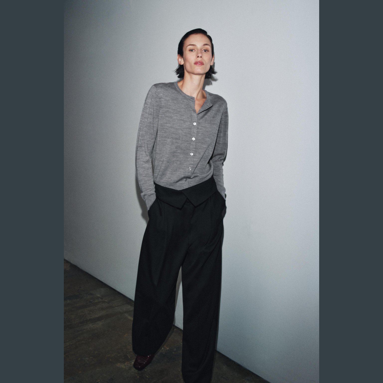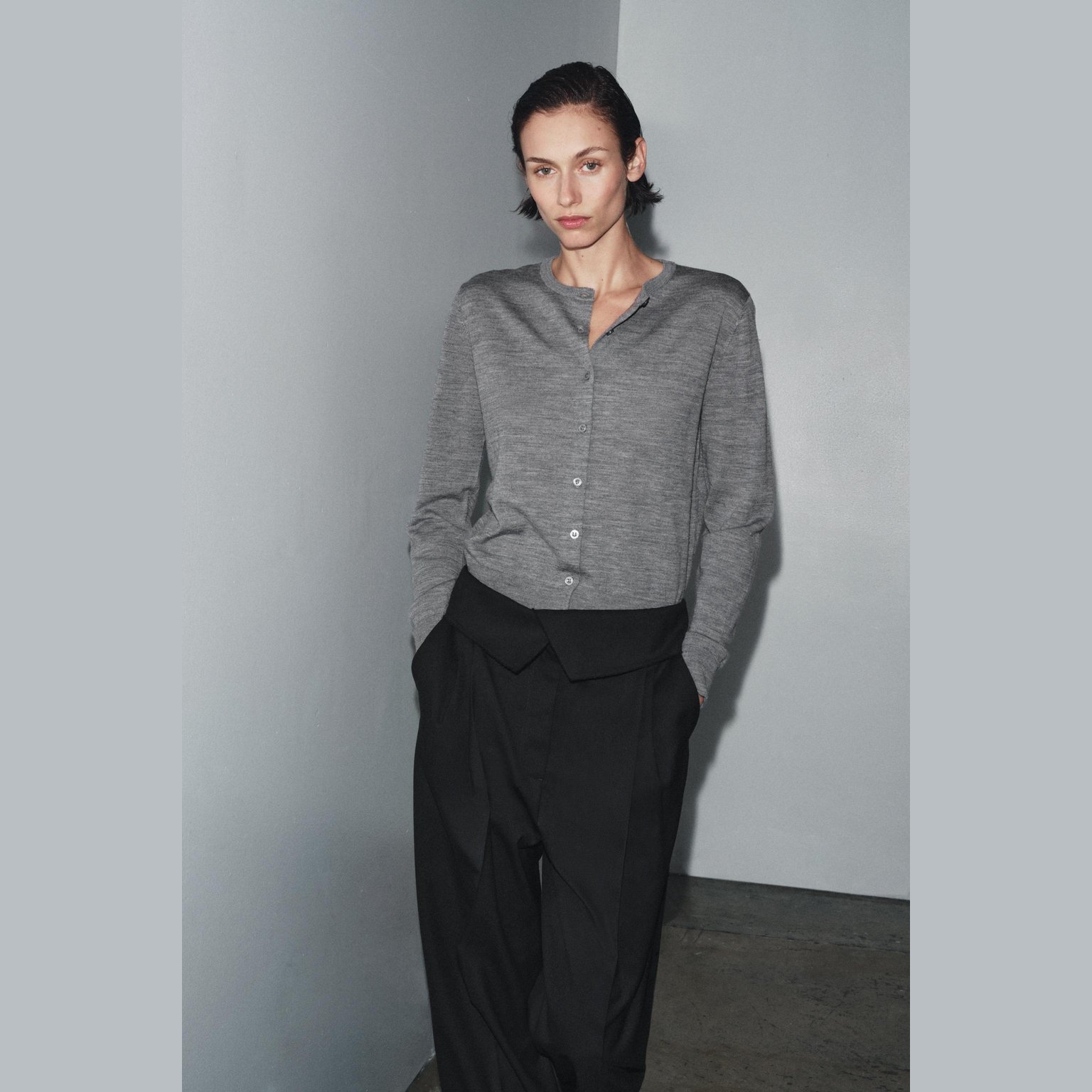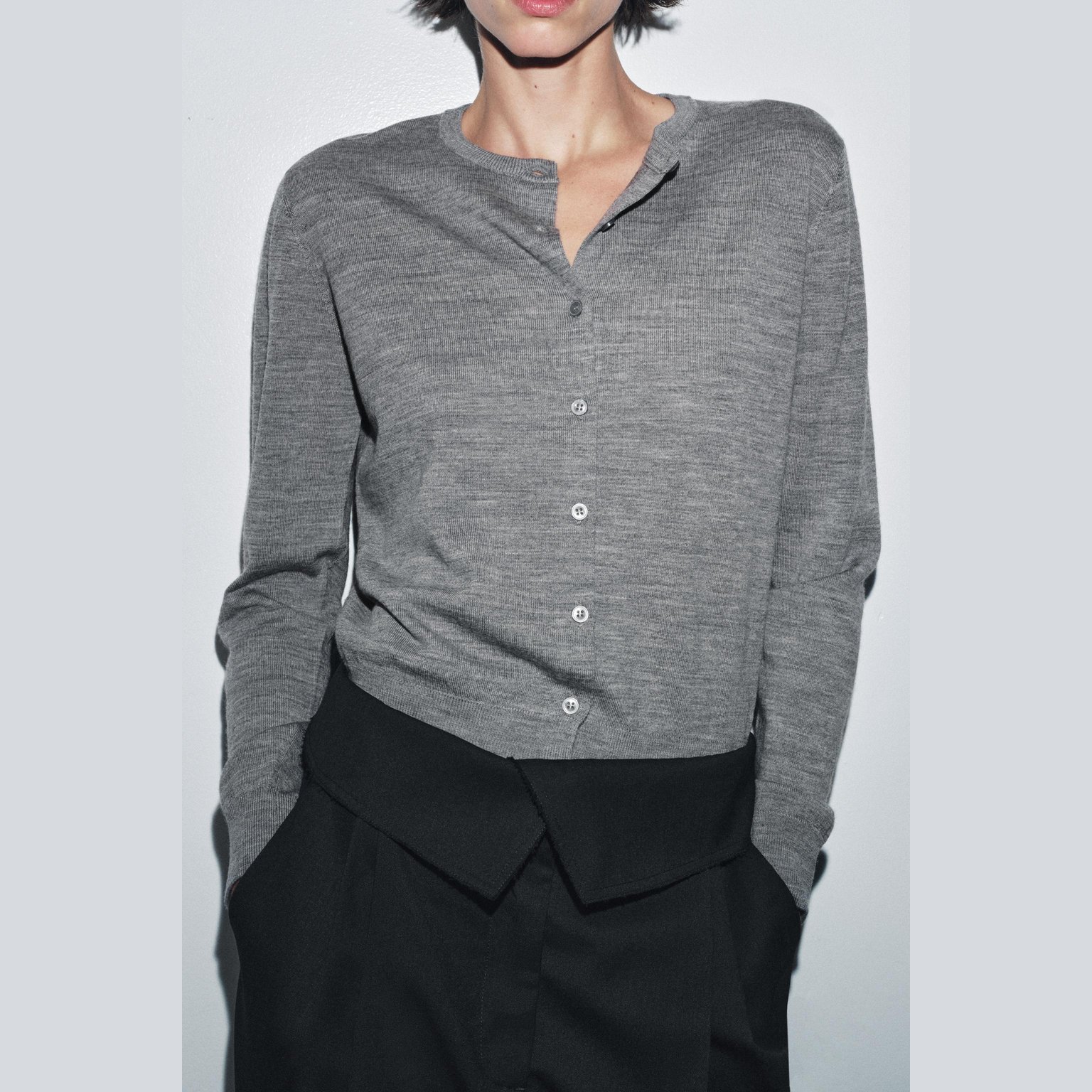 كارديغان أنيق بلون رمادي مموج طبيعي، مصنوع بالكامل من الصوف الفاخر ليمنح دفئًا وملمسًا راقيًا، مع تصميم محبوك بسيط يناسب مختلف الإطلالات. يتميز برقبة مستديرة، أكمام طويلة، إغلاق أمامي بأزرار، وحاشية مستقيمة. قطعة مثالية للإطلالات الكاجوال الأنيقة في المواسم الباردة.