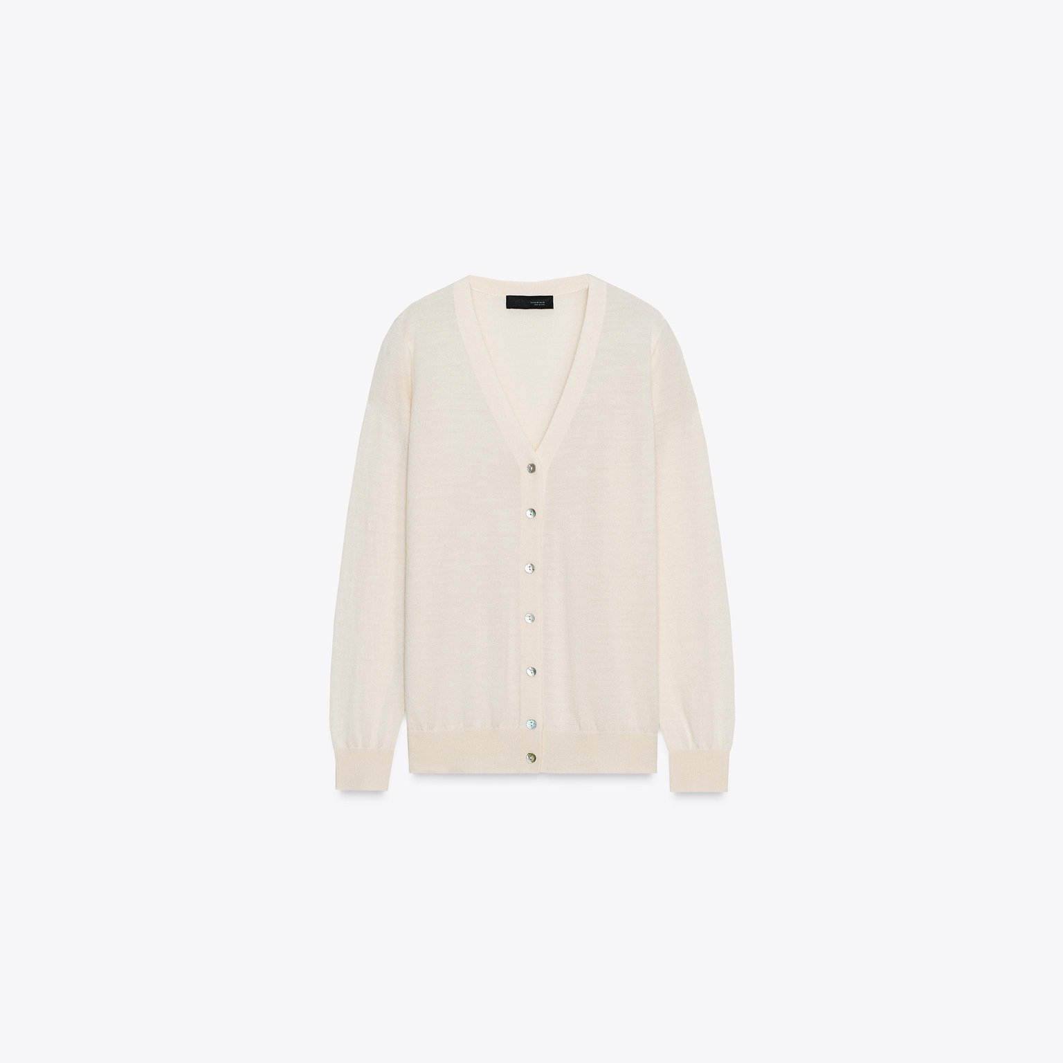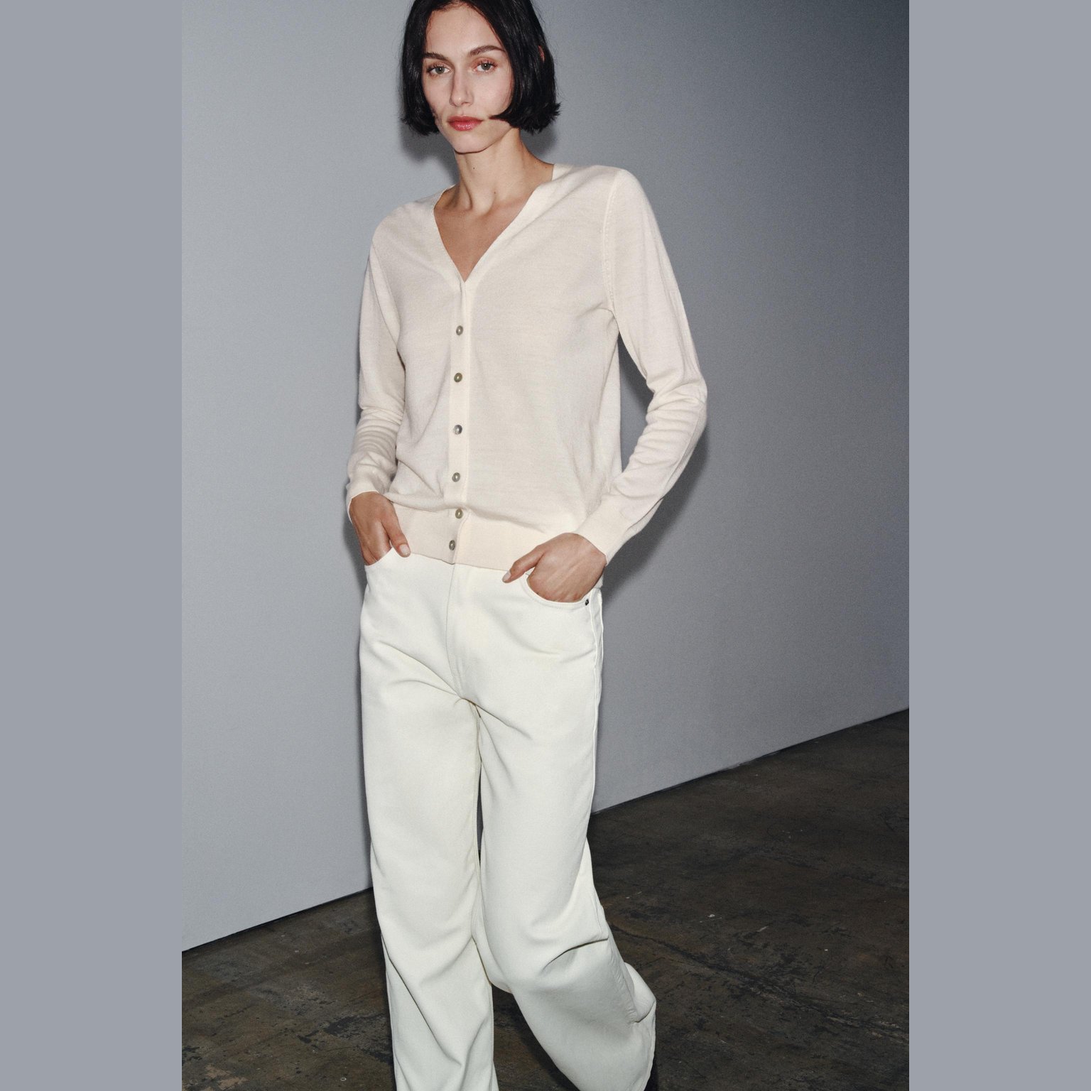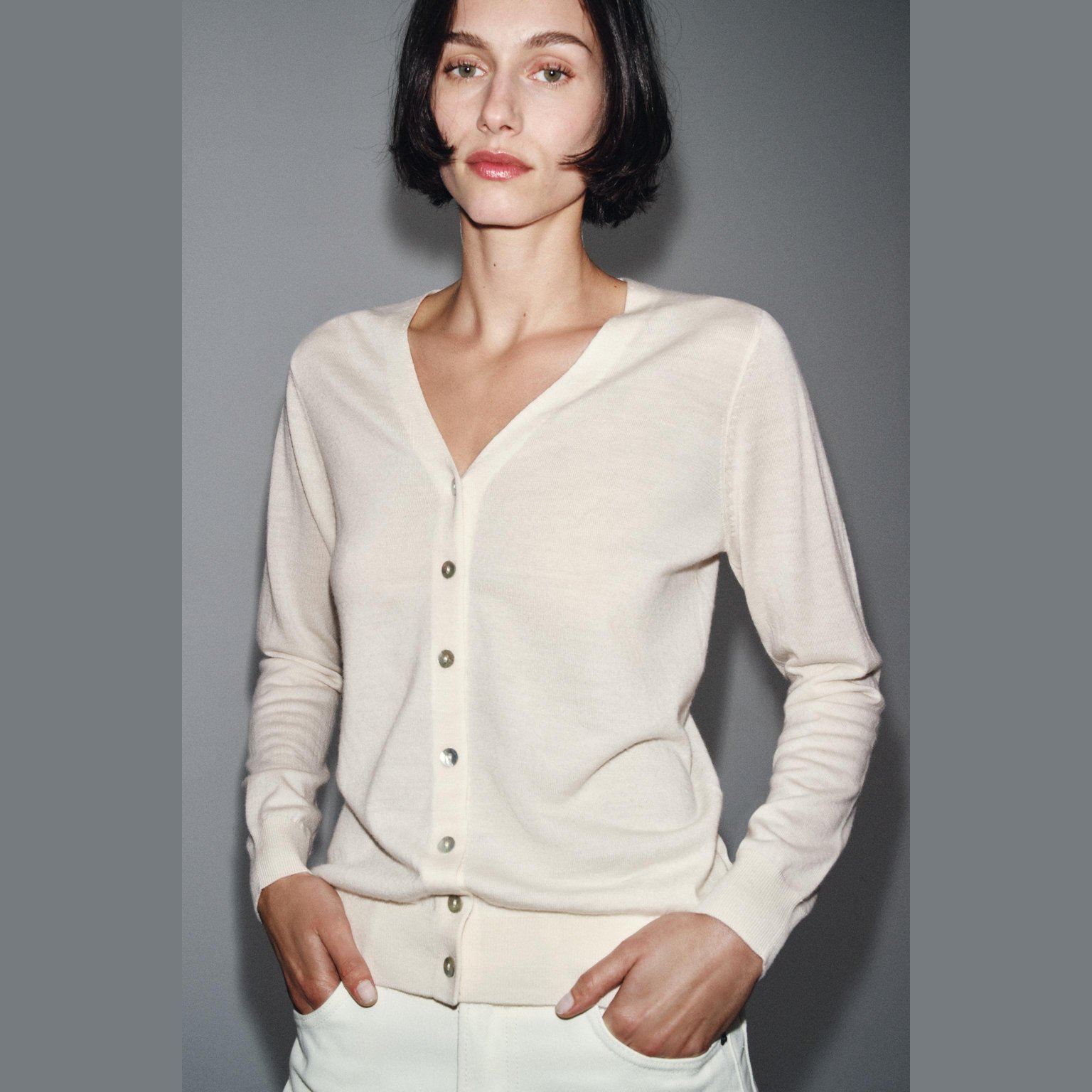 كارديغان أنيق بلون أوف وايت طبيعي، مصنوع بالكامل من الصوف الفاخر ليمنح دفئًا وملمسًا راقيًا، مع تصميم كلاسيكي عملي يناسب مختلف الإطلالات. يتميز بياقة على شكل V، أكمام طويلة، إغلاق أمامي بأزرار، وحاشية مستقيمة. قطعة مثالية للإطلالات الكاجوال الأنيقة في المواسم الباردة.