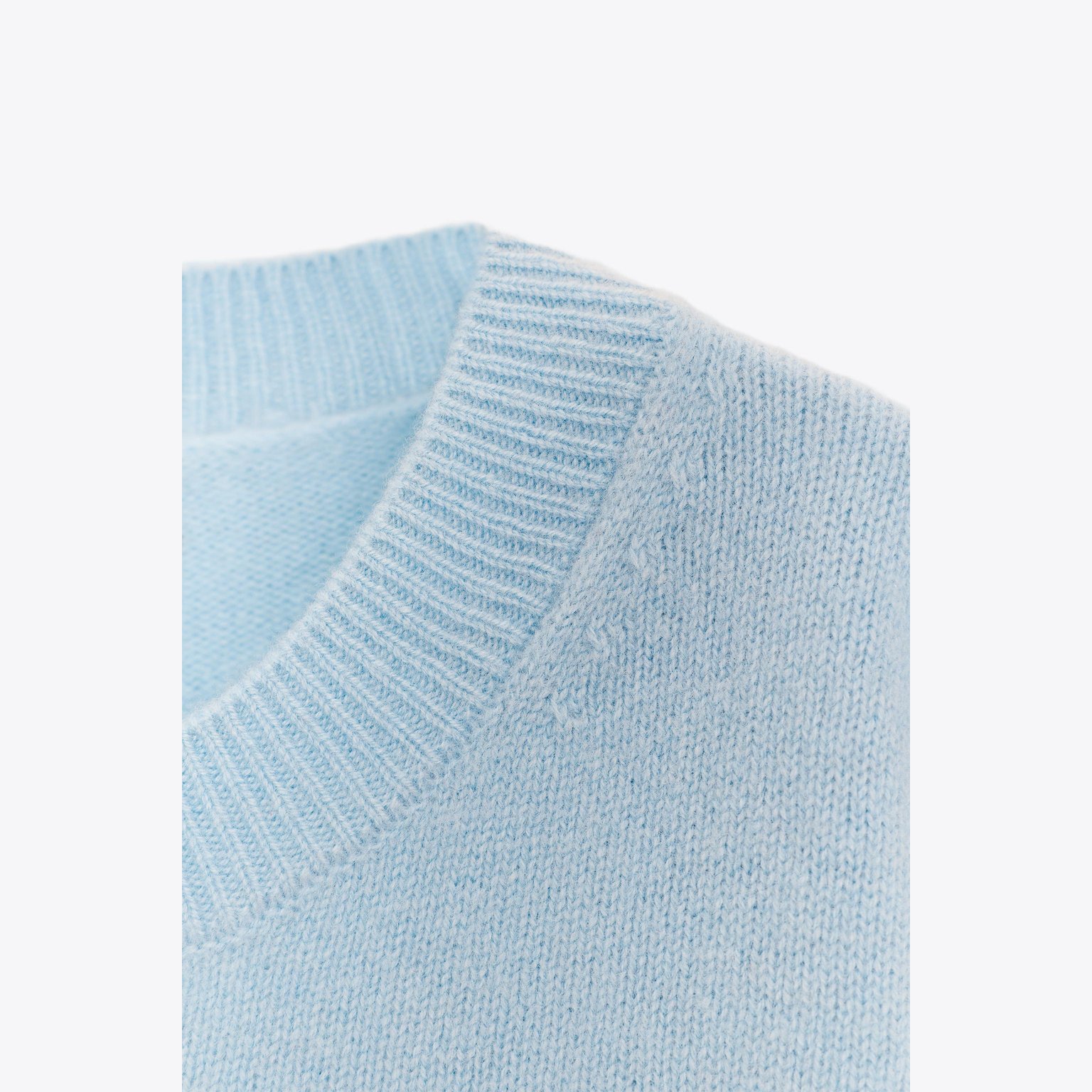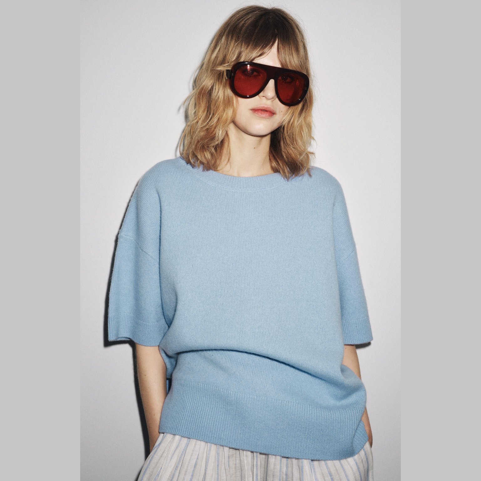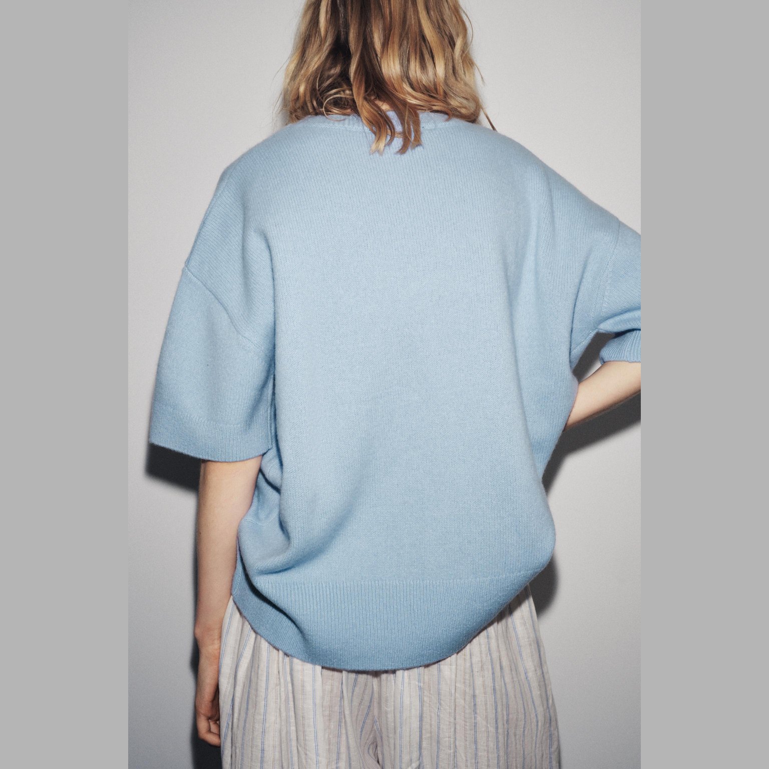 سويتر أنيق بلون أزرق فاتح طبيعي، مصنوع بالكامل من الصوف الفاخر ليمنح دفئًا وملمسًا راقيًا، مع تصميم عملي بأكمام قصيرة يناسب مختلف الإطلالات. يتميز برقبة مستديرة، أكمام قصيرة، وحاشية مستقيمة. قطعة مثالية للتنسيق مع طبقات متعددة أو ارتدائها منفردة لإطلالة كاجوال أنيقة.