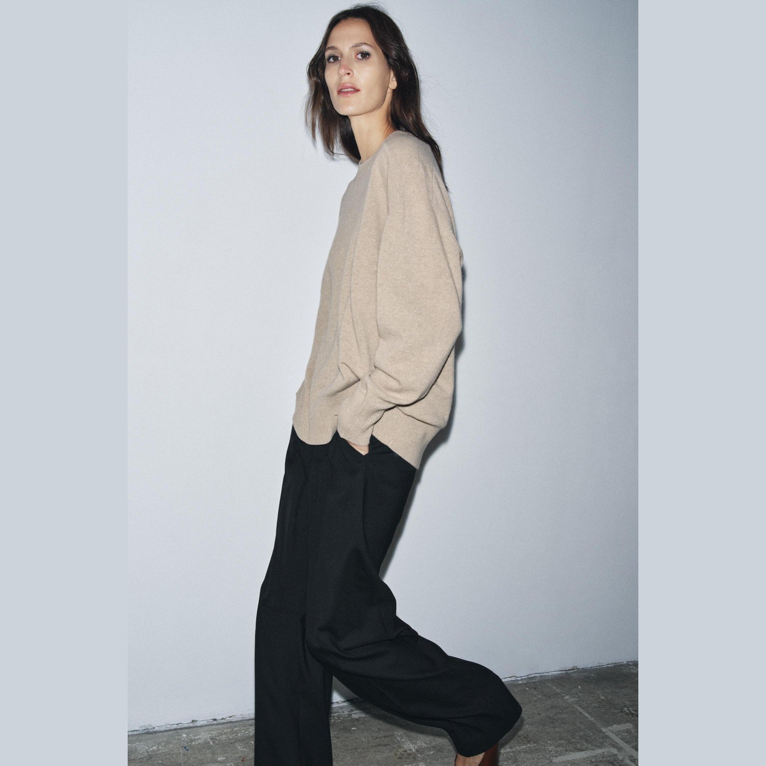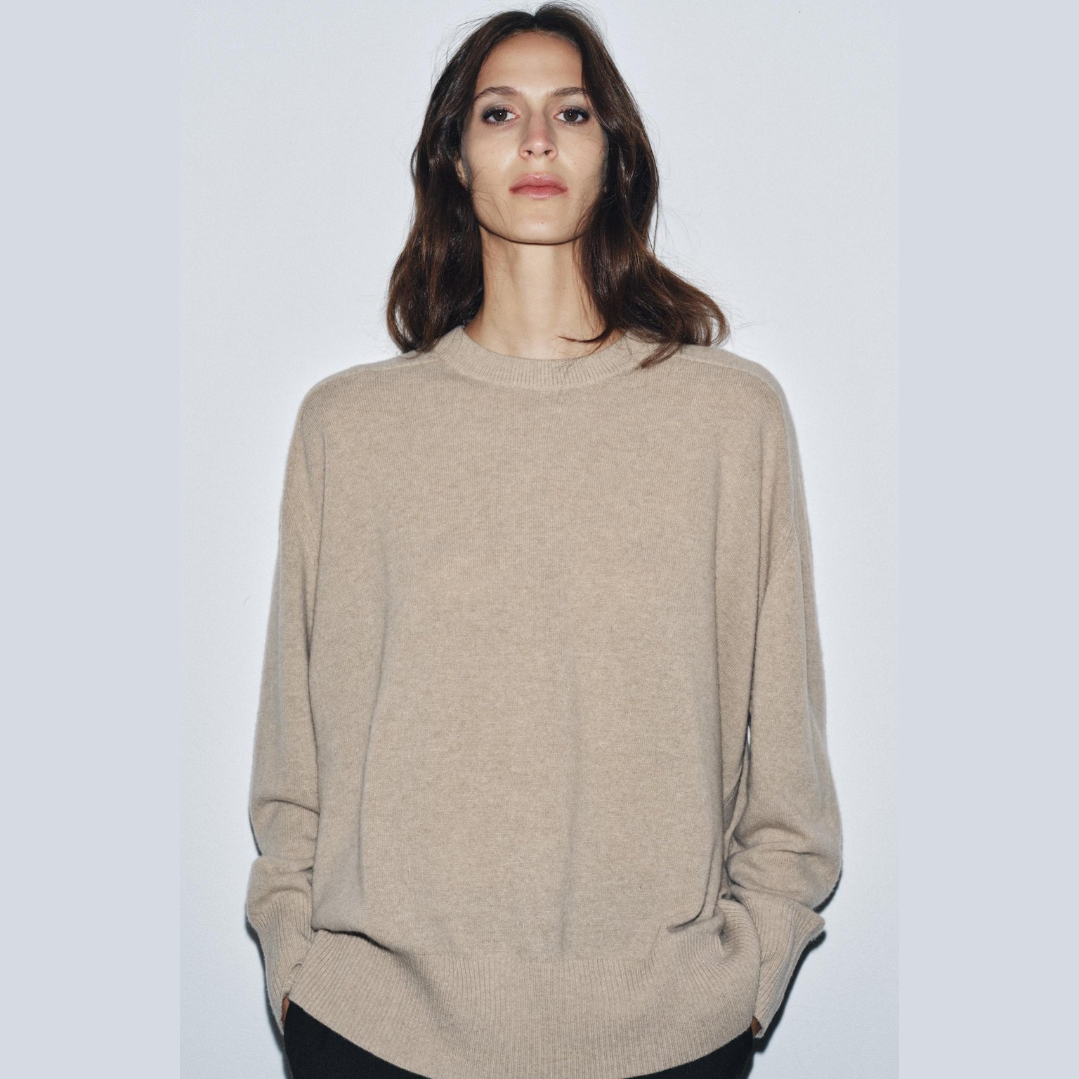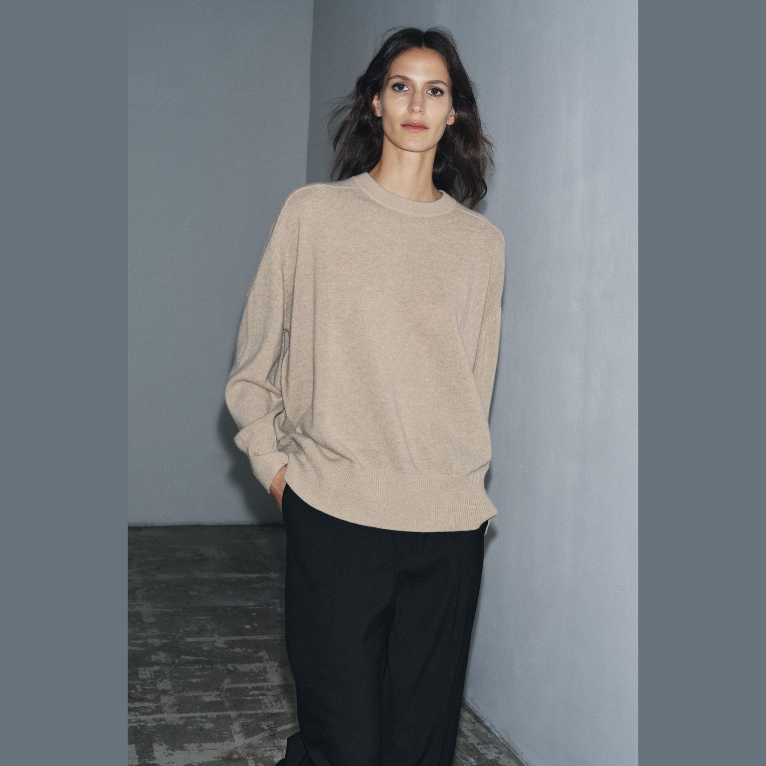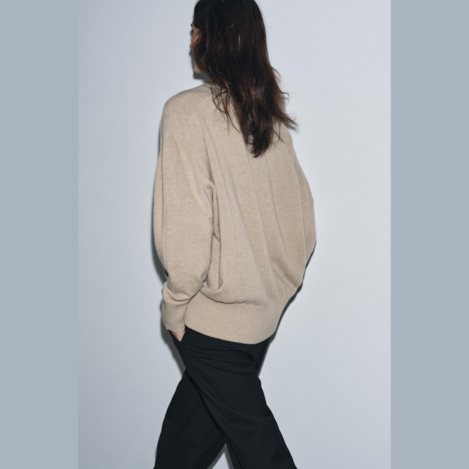 سويتر واسع بلون بيج طبيعي، مصنوع بالكامل من الصوف الفاخر ليمنح دفئًا وملمسًا راقيًا، مع تصميم مريح وعملي يناسب مختلف الإطلالات. يتميز برقبة مستديرة، أكمام طويلة، وحواف مضلعة. قطعة مثالية للإطلالات الكاجوال الأنيقة في المواسم الباردة.