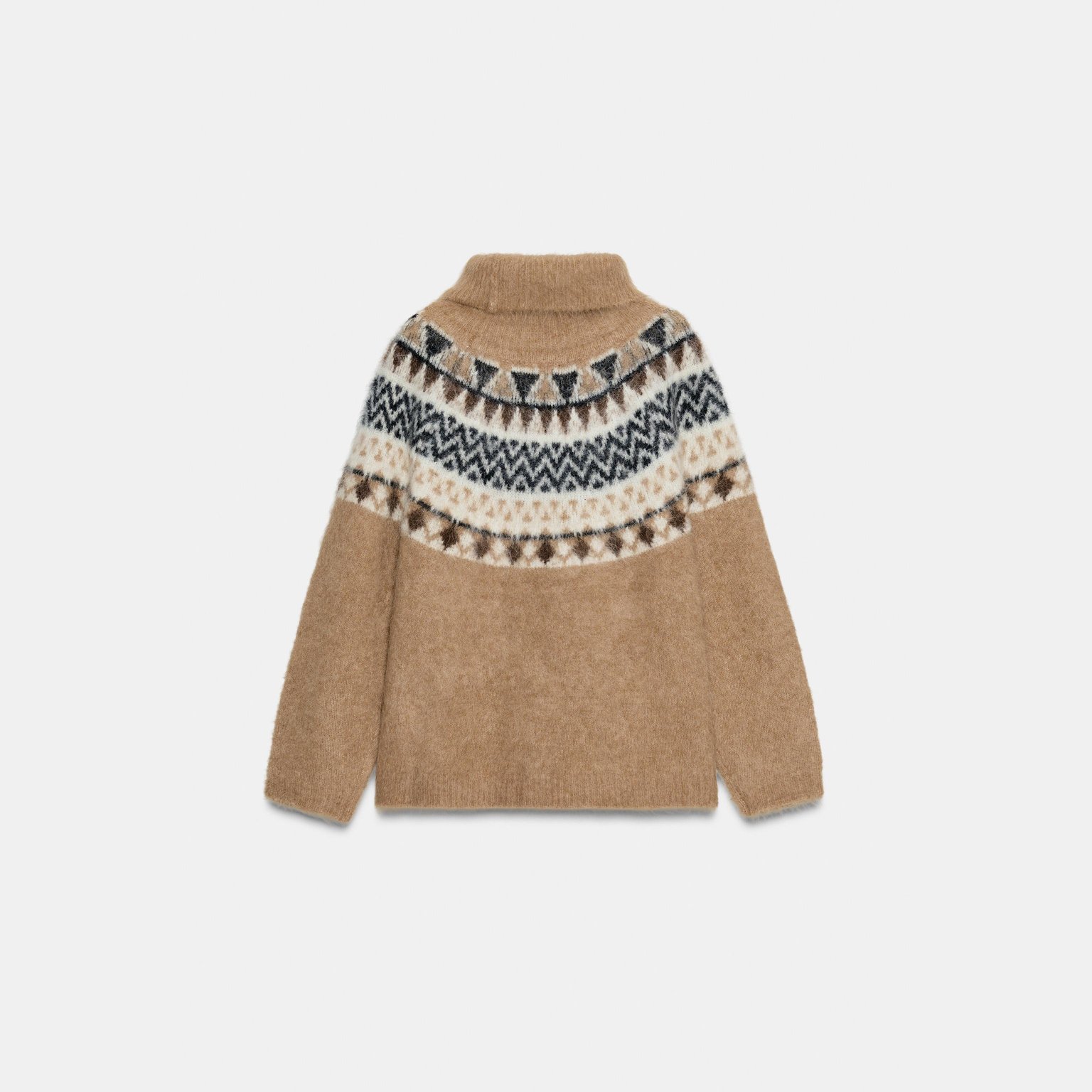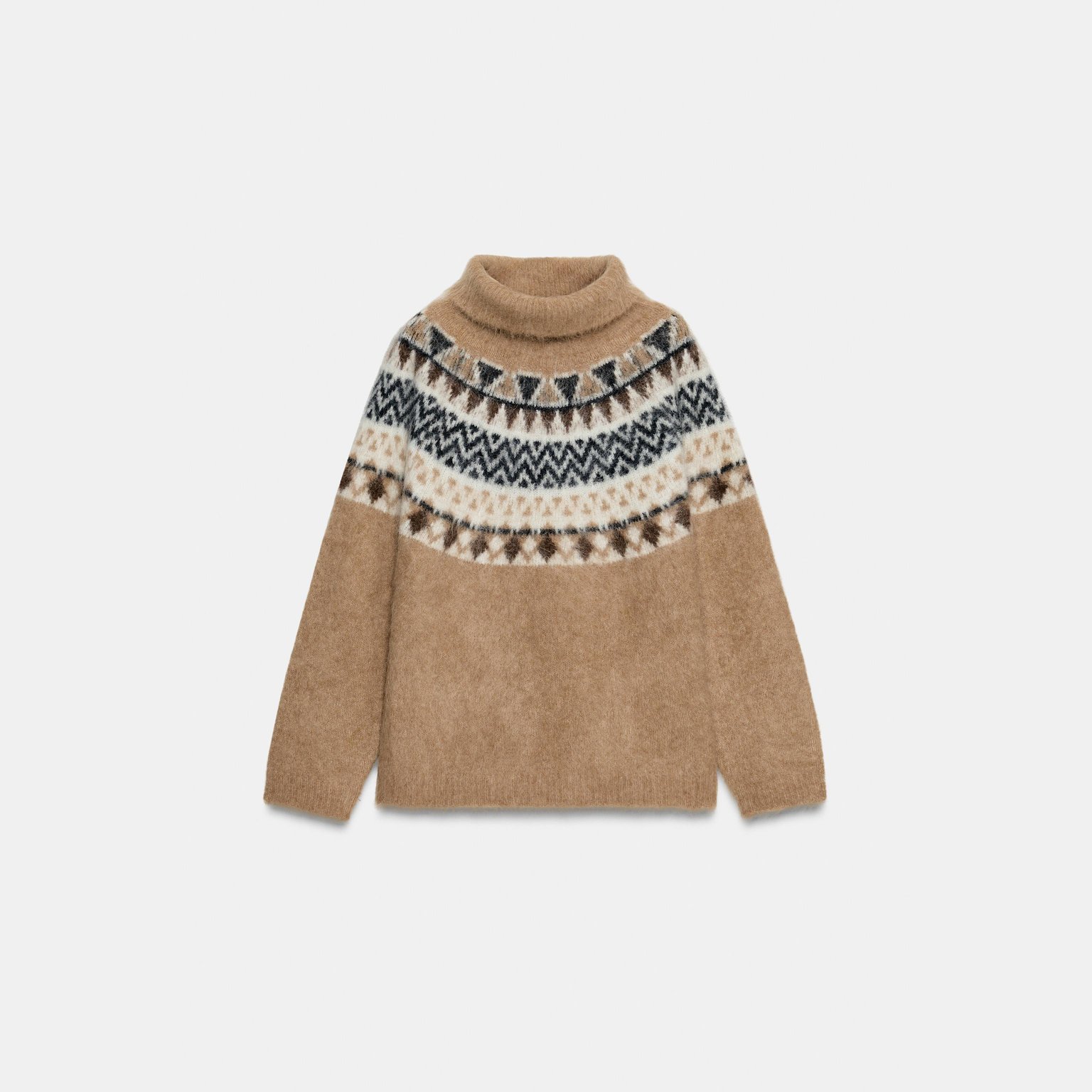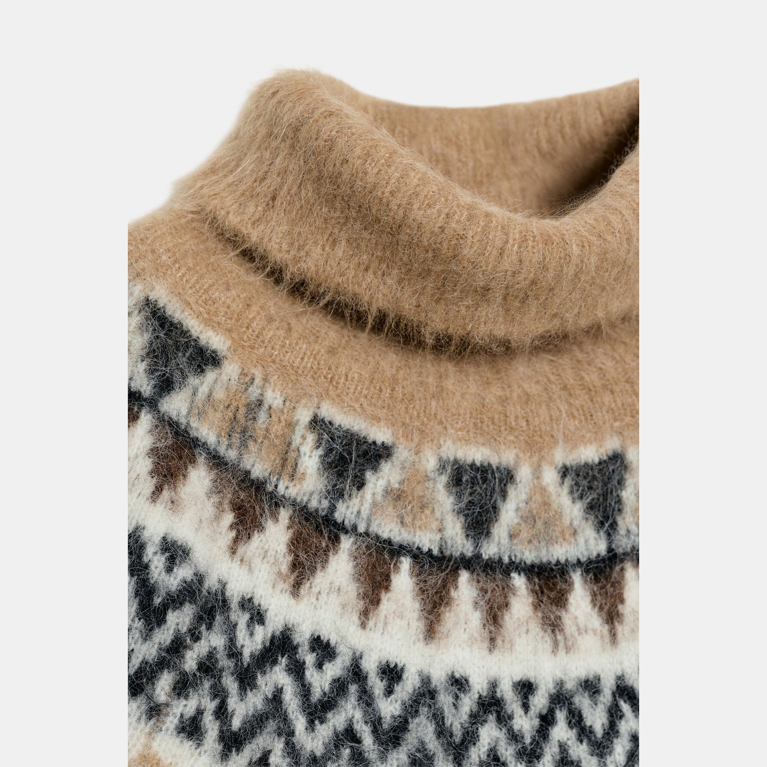 سويتر أنيق بلون جملي فاتح طبيعي، مصنوع من خامة ممزوجة بالألباكا تمنح دفئًا وملمسًا فاخرًا، مع نقشة جاكار متباينة تضيف لمسة عصرية مميزة. يتميز بياقة عالية، أكمام طويلة، وحواف مضلعة. قطعة مثالية للإطلالات الكاجوال الأنيقة في المواسم الباردة.
