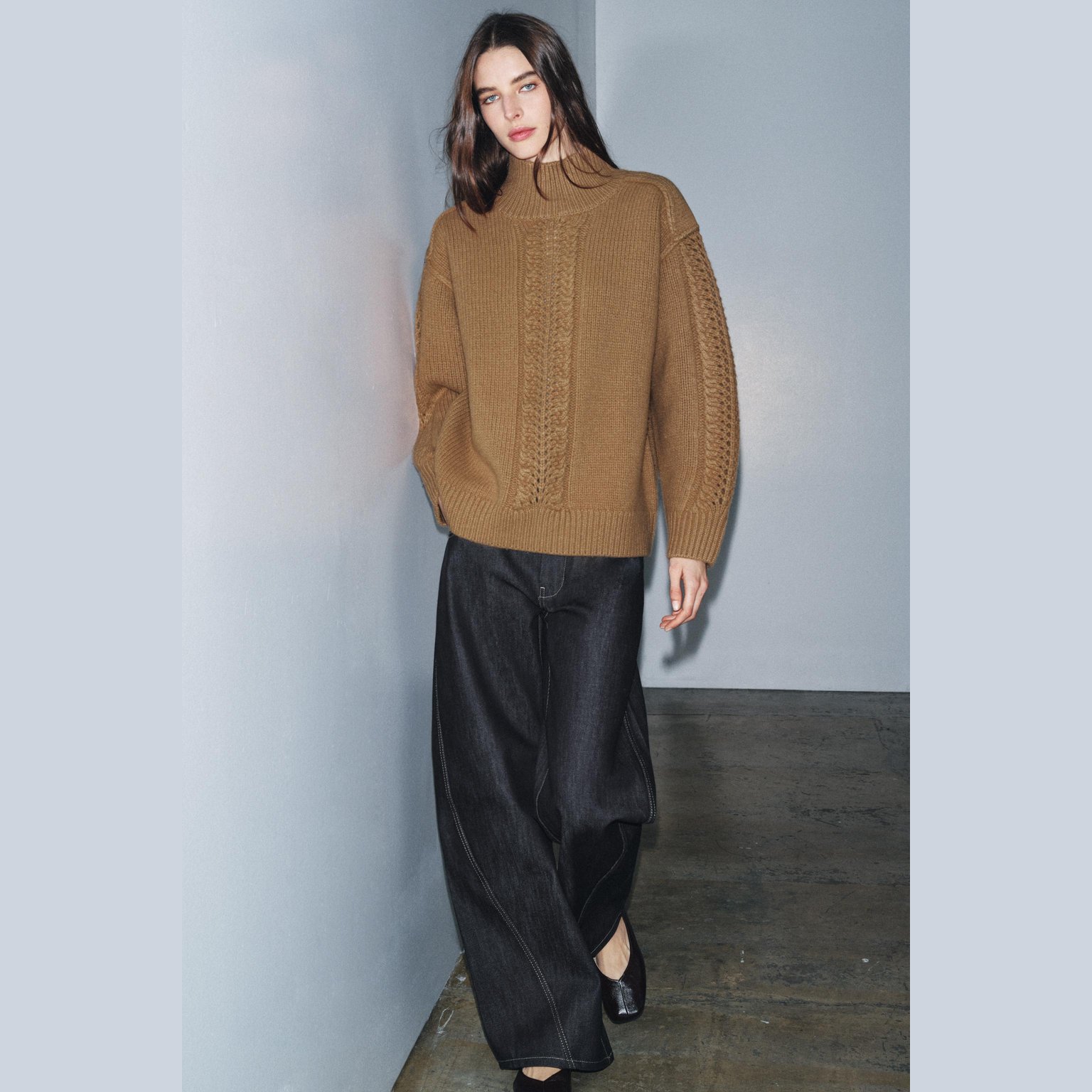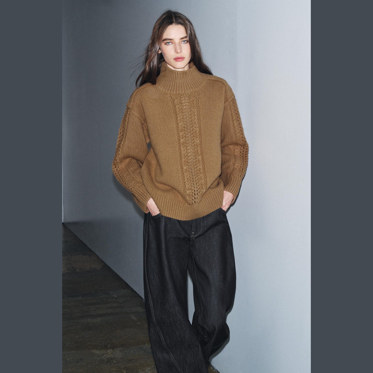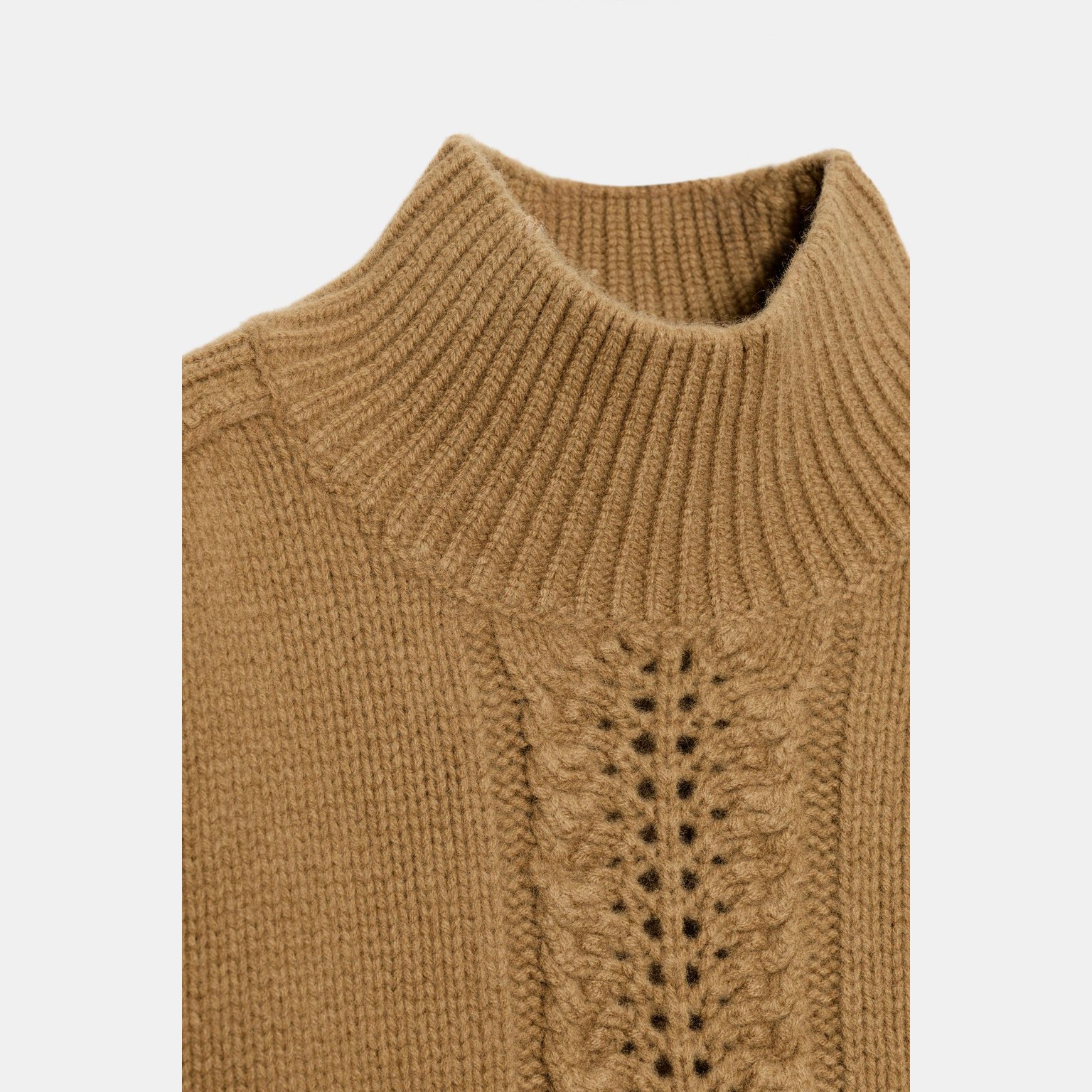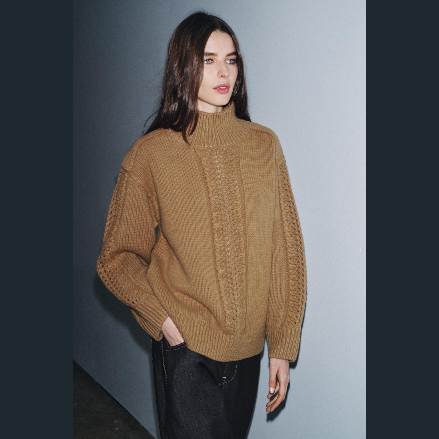 سويتر أنيق بلون جملي متوسط طبيعي، مصنوع بالكامل من الصوف الفاخر ليمنح دفئًا وملمسًا راقيًا، مع تصميم محبوك بنسيج بارز يضيف لمسة مميزة. يتميز بياقة عالية، أكمام طويلة، وحواف مضلعة. قطعة مثالية للإطلالات الكاجوال الأنيقة في المواسم الباردة.