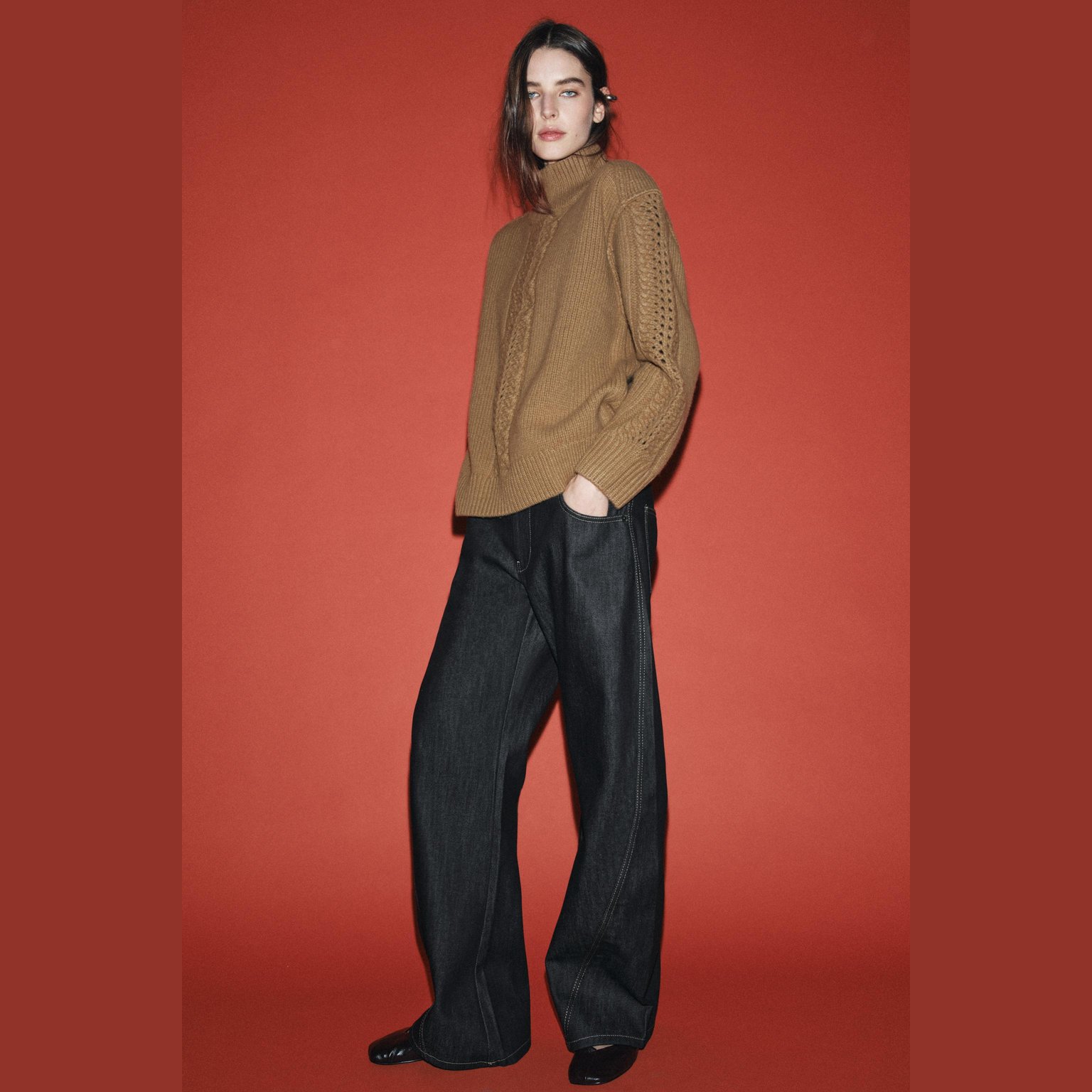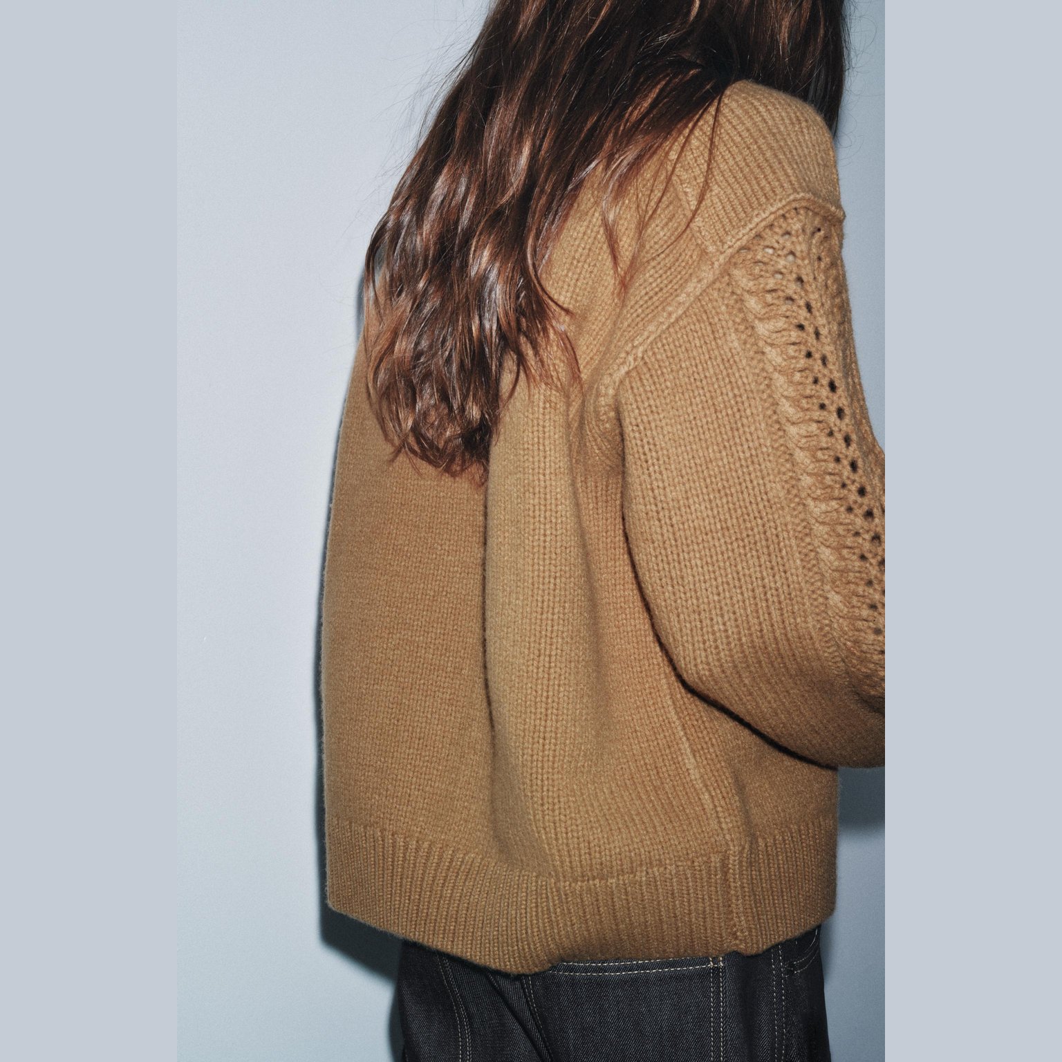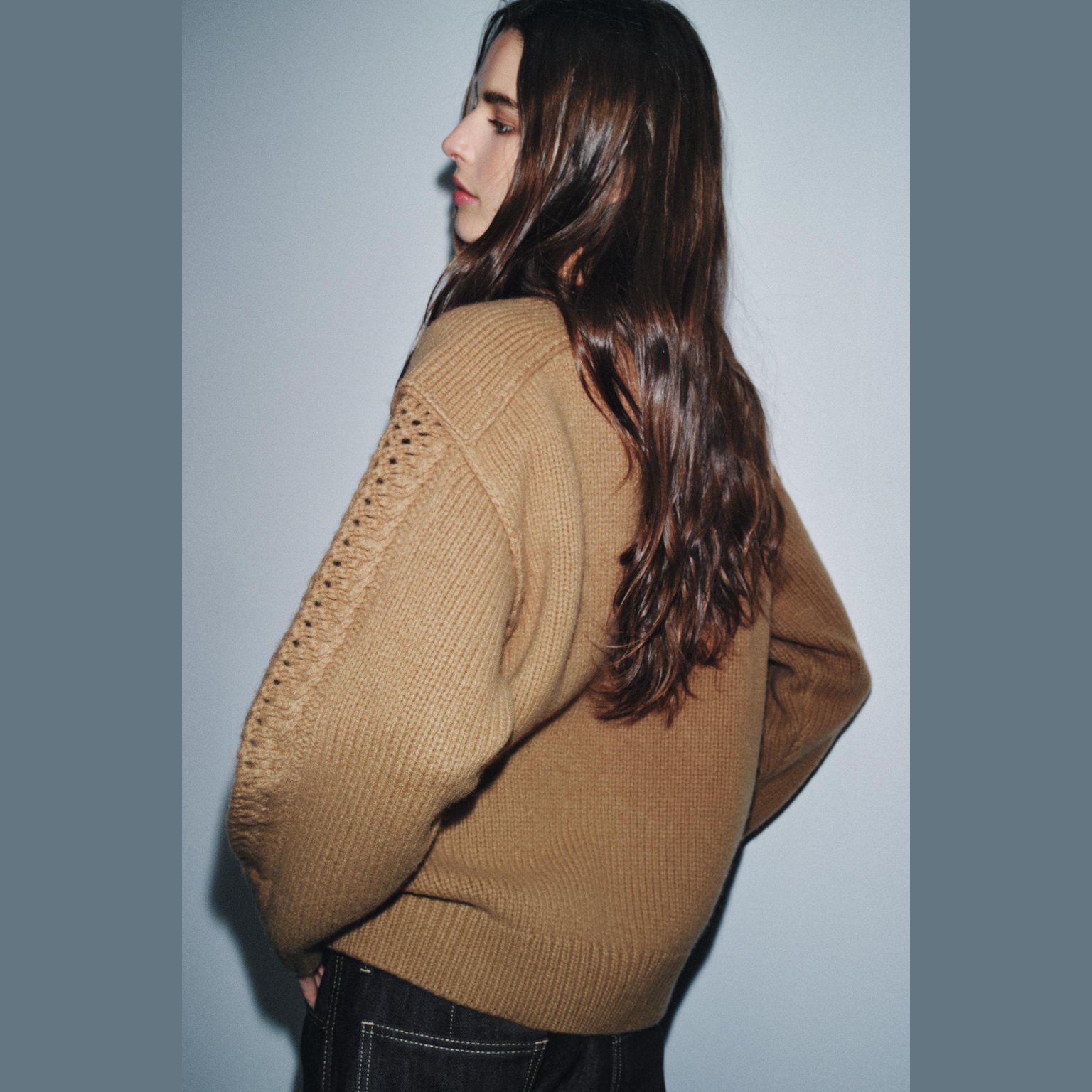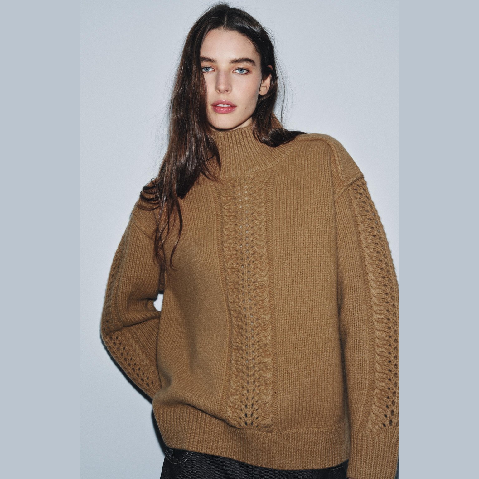 سويتر أنيق بلون جملي متوسط طبيعي، مصنوع بالكامل من الصوف الفاخر ليمنح دفئًا وملمسًا راقيًا، مع تصميم محبوك بنسيج بارز يضيف لمسة مميزة. يتميز بياقة عالية، أكمام طويلة، وحواف مضلعة. قطعة مثالية للإطلالات الكاجوال الأنيقة في المواسم الباردة.