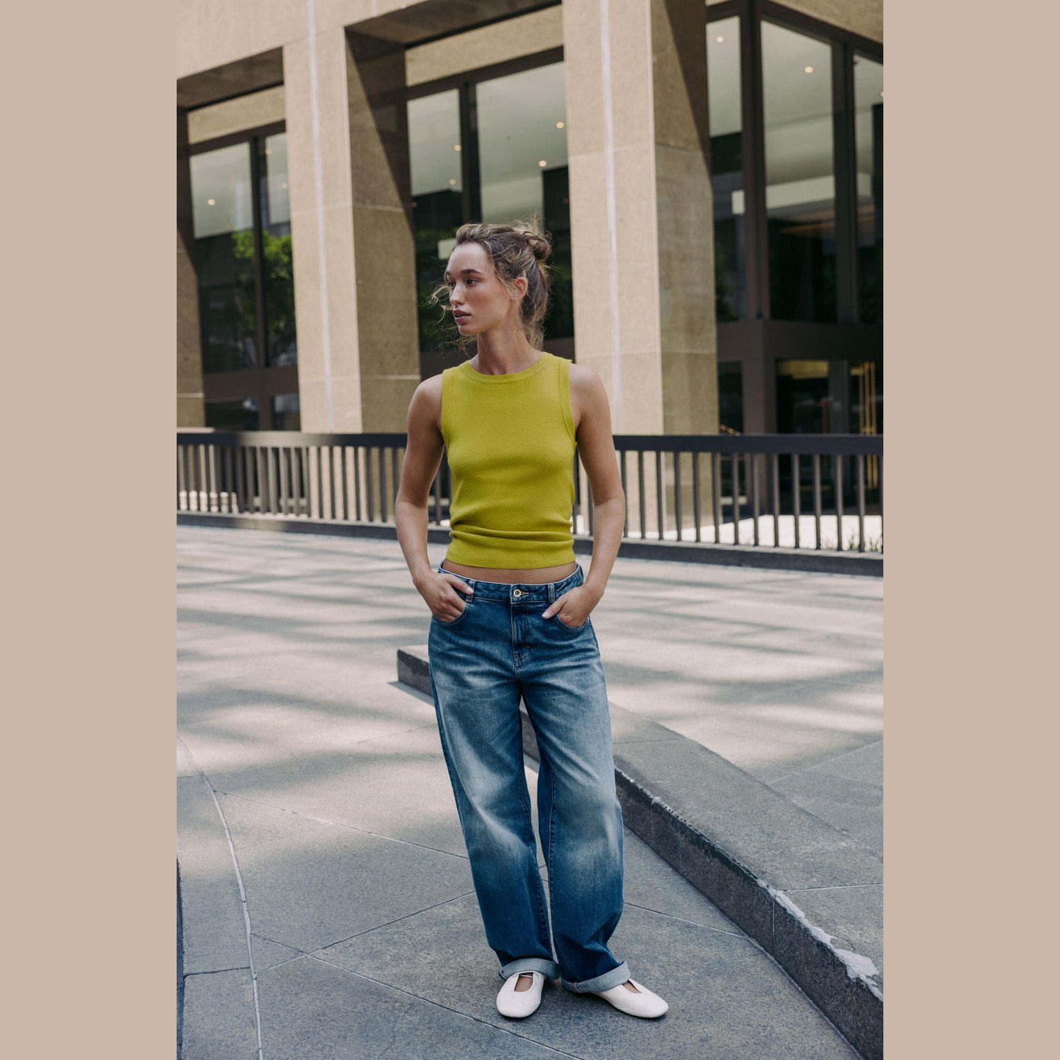 - التصميم: توب محبوك أساسي بلا أكمام (Basic Knit Top)