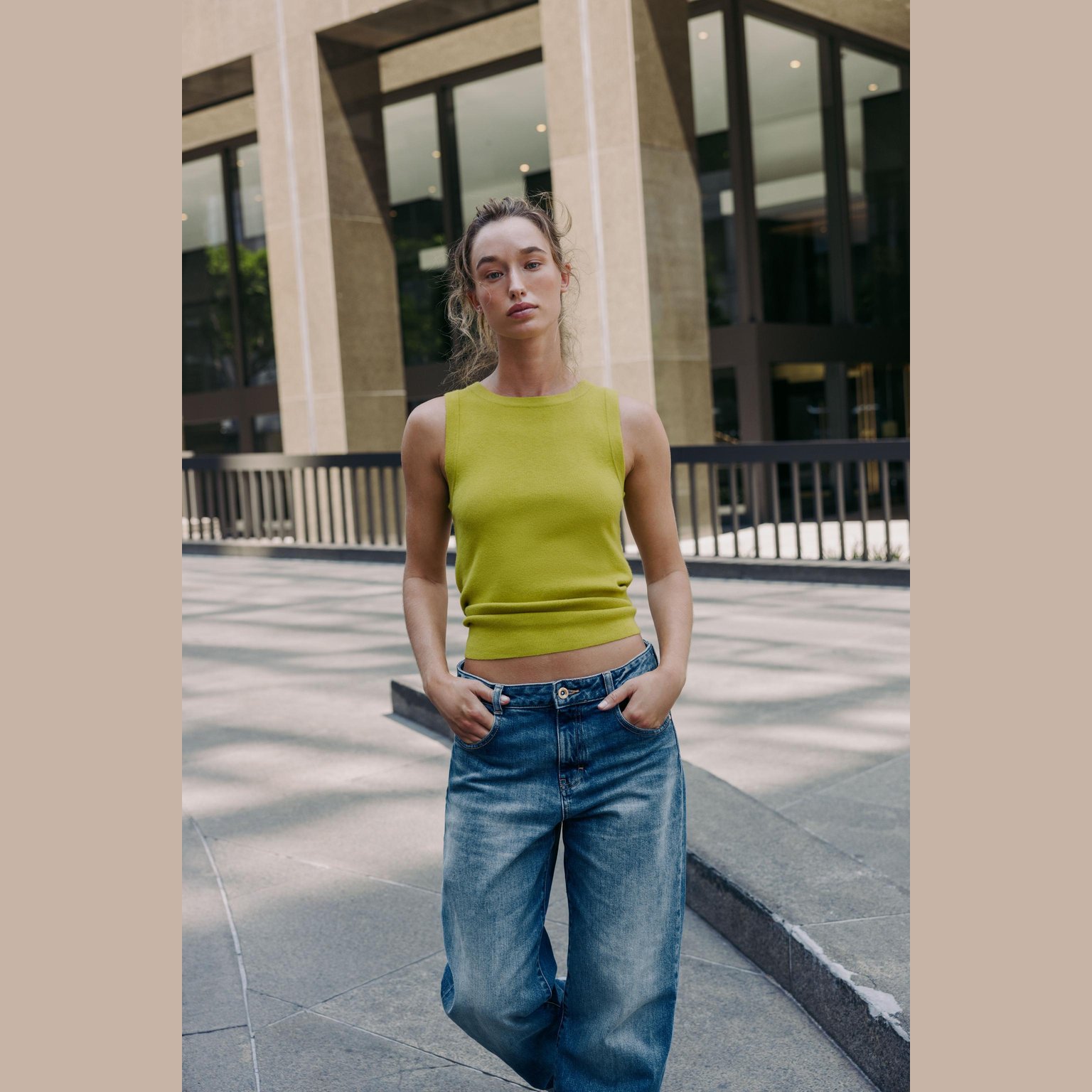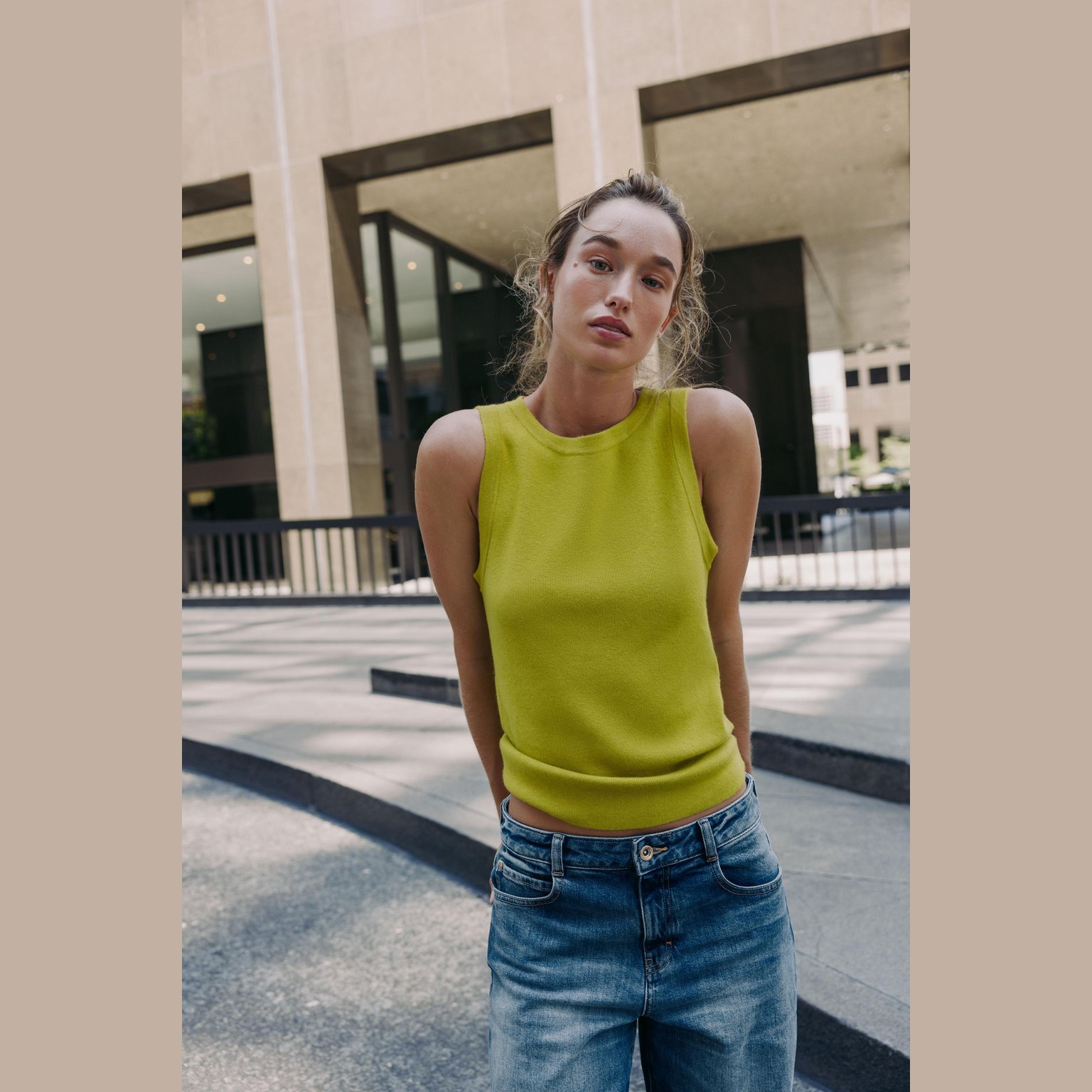 توب محبوك أساسي بلا أكمام – لون طبيعي (فستقي فاتح) – Light Pistachio (Basic Knit Top) توب أنيق بلون فستقي فاتح طبيعي، مصنوع من خامة محبوكة عملية تمنح راحة وملمس عملي، مع تصميم كلاسيكي يناسب مختلف الإطلالات. يتميز بياقة مستديرة وحواف مضلعة تضيف لمسة عملية وأنيقة. قطعة مثالية للتنسيقات اليومية الكاجوال الأنيقة أو كطبقة أساسية تحت جاكيتات ومعاطف.