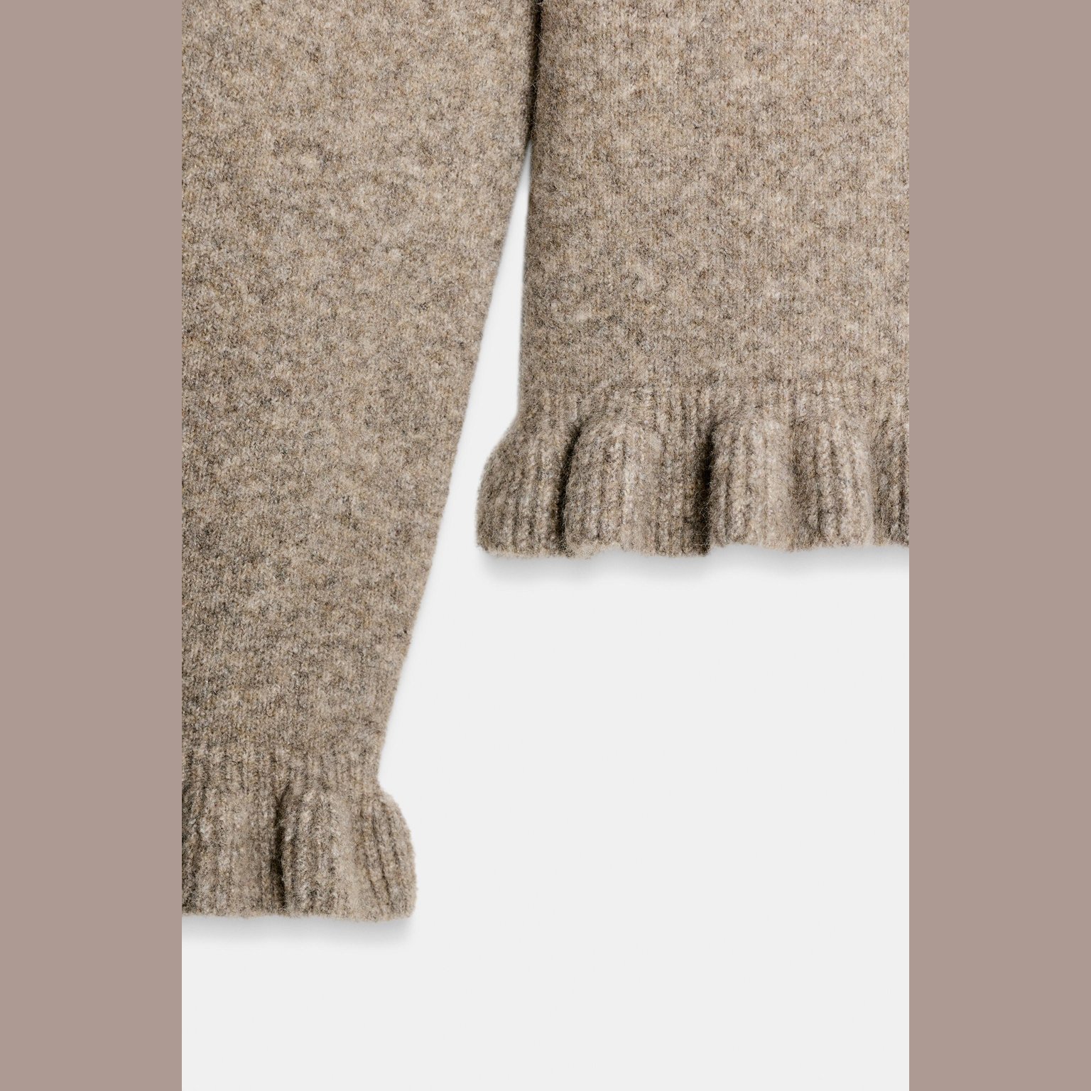 كارديغان محبوك مع حواف كشكش – لون طبيعي (رملي-بيج) – Mink Sand (Knit Cardigan with Ruffle Trims) كارديغان أنيق بلون رملي-بيج طبيعي، مصنوع من خامة محبوكة عملية تمنح راحة ودفء، مع تصميم كلاسيكي مزين بحواف كشكش تضيف لمسة أنثوية مميزة. يتميز بياقة مستديرة، أكمام طويلة، وحواف مضلعة مع إغلاق أمامي بأزرار. قطعة مثالية للتنسيقات اليومية الكاجوال الأنيقة أو كطبقة إضافية فوق التوبات والقمصان.