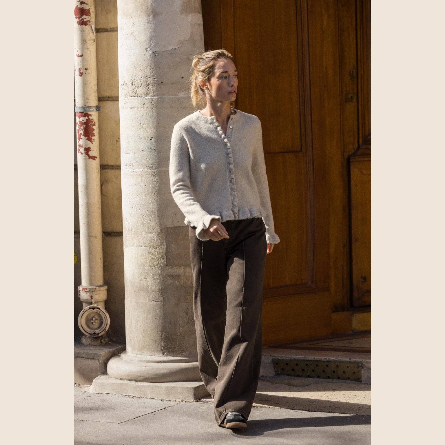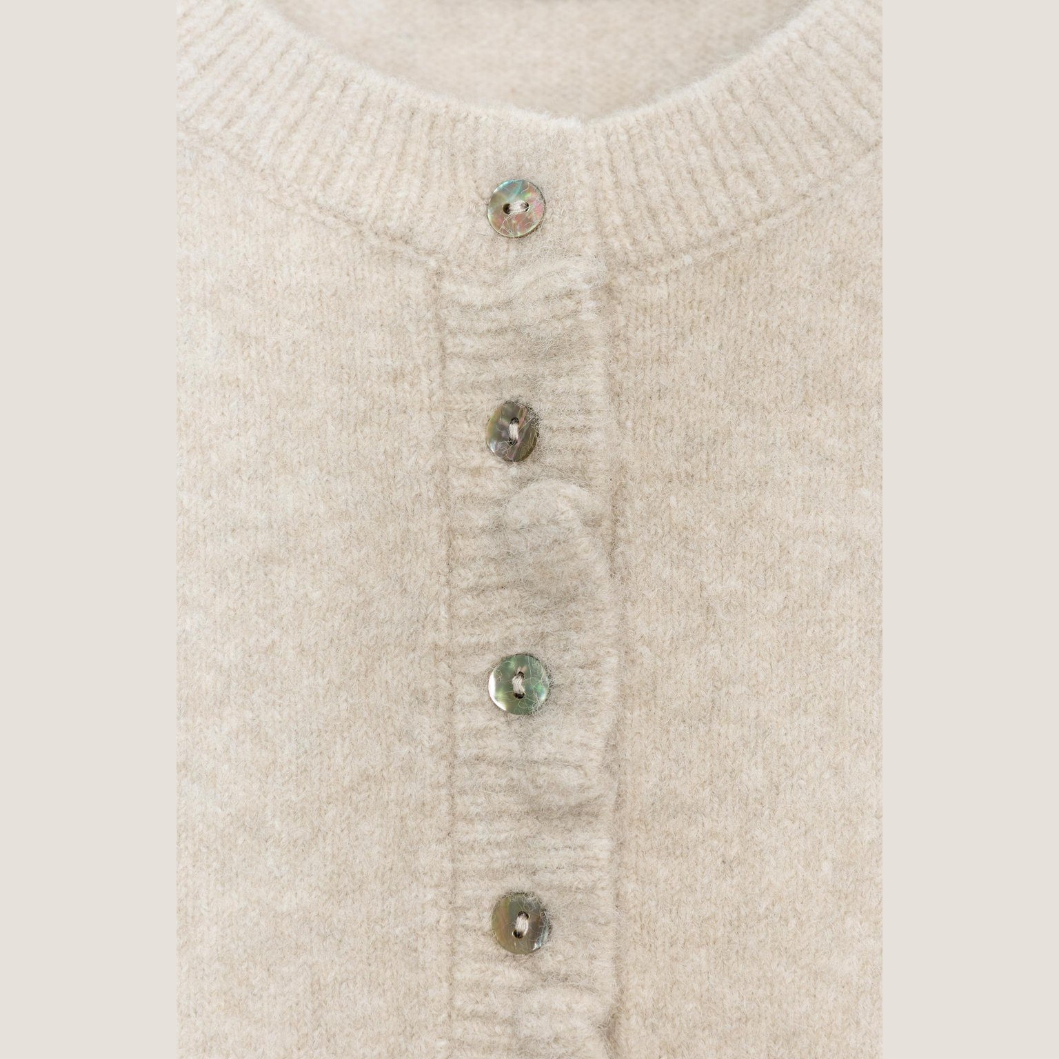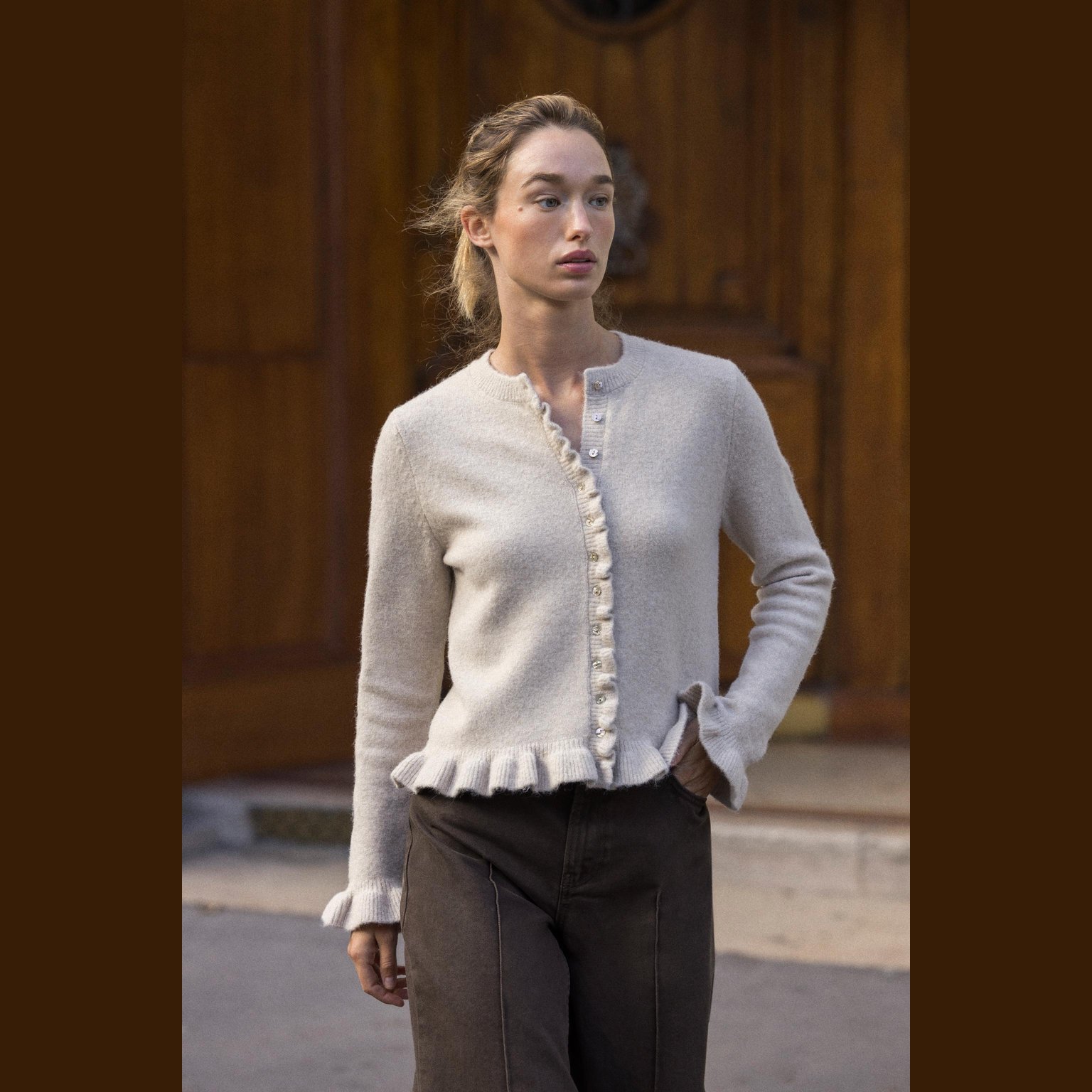 كارديغان محبوك مع حواف كشكش – لون طبيعي (رملي-بيج) – Sand Mink (Ruffle Knit Cardigan) كارديغان أنيق بلون رملي-بيج طبيعي، مصنوع من خامة محبوكة عملية تمنح راحة ودفء، مع تصميم كلاسيكي مزين بحواف كشكش تضيف لمسة أنثوية مميزة. يتميز بياقة مستديرة، أكمام طويلة، وحواف مضلعة مع إغلاق أمامي بأزرار. قطعة مثالية للتنسيقات اليومية الكاجوال الأنيقة أو كطبقة إضافية فوق التوبات والقمصان.