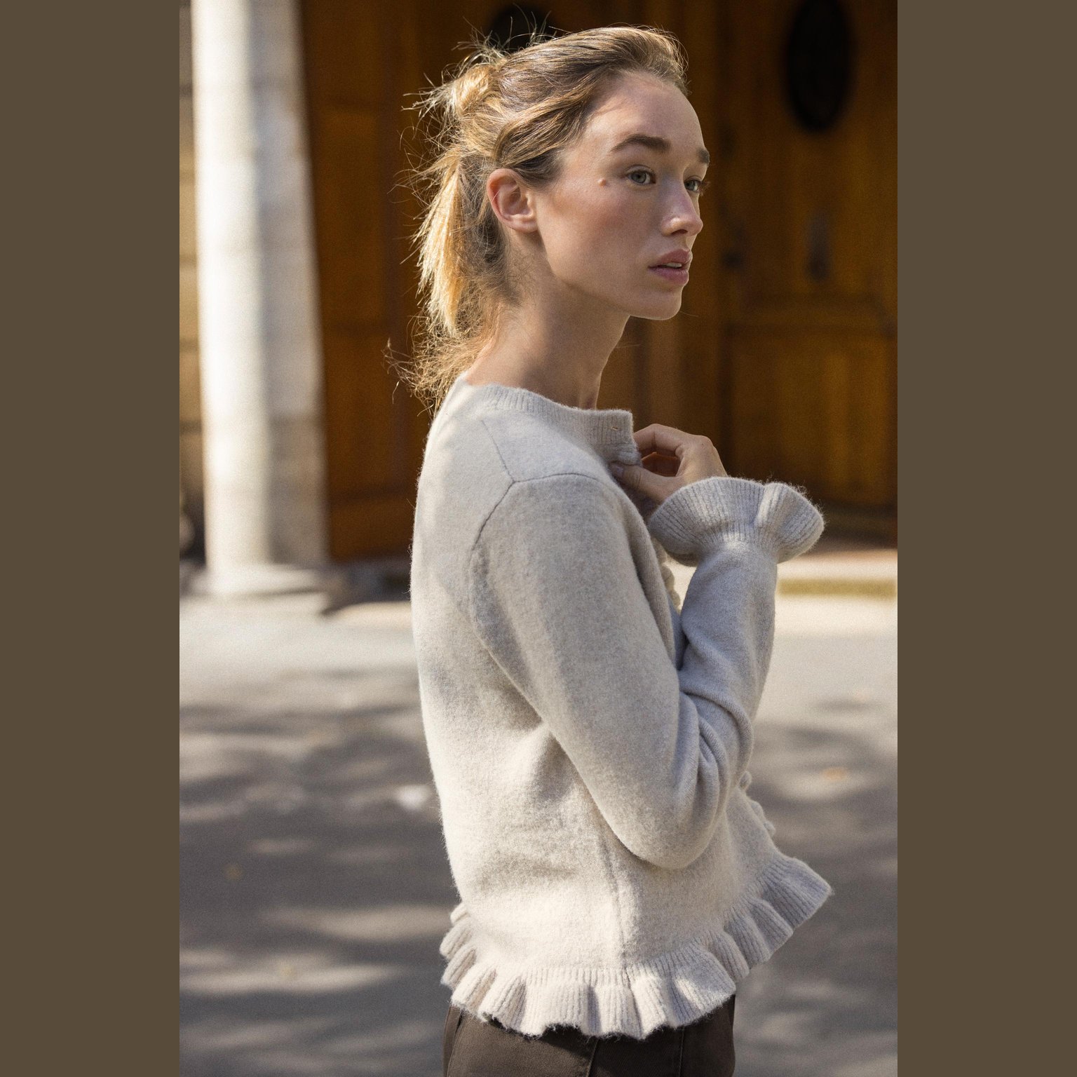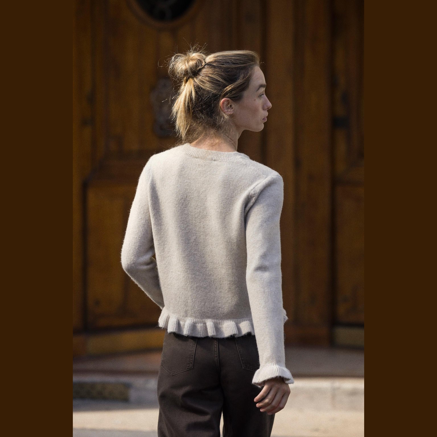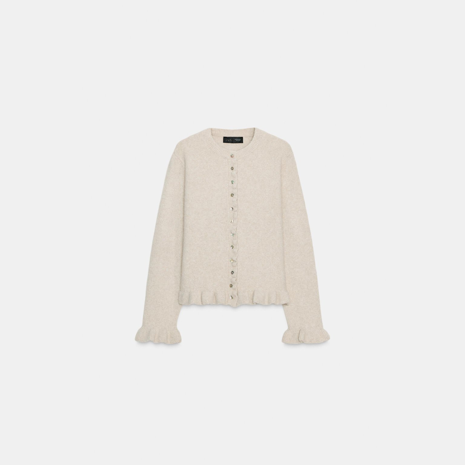 - التصميم: كارديغان محبوك مع حواف كشكش (Ruffle Knit Cardigan)