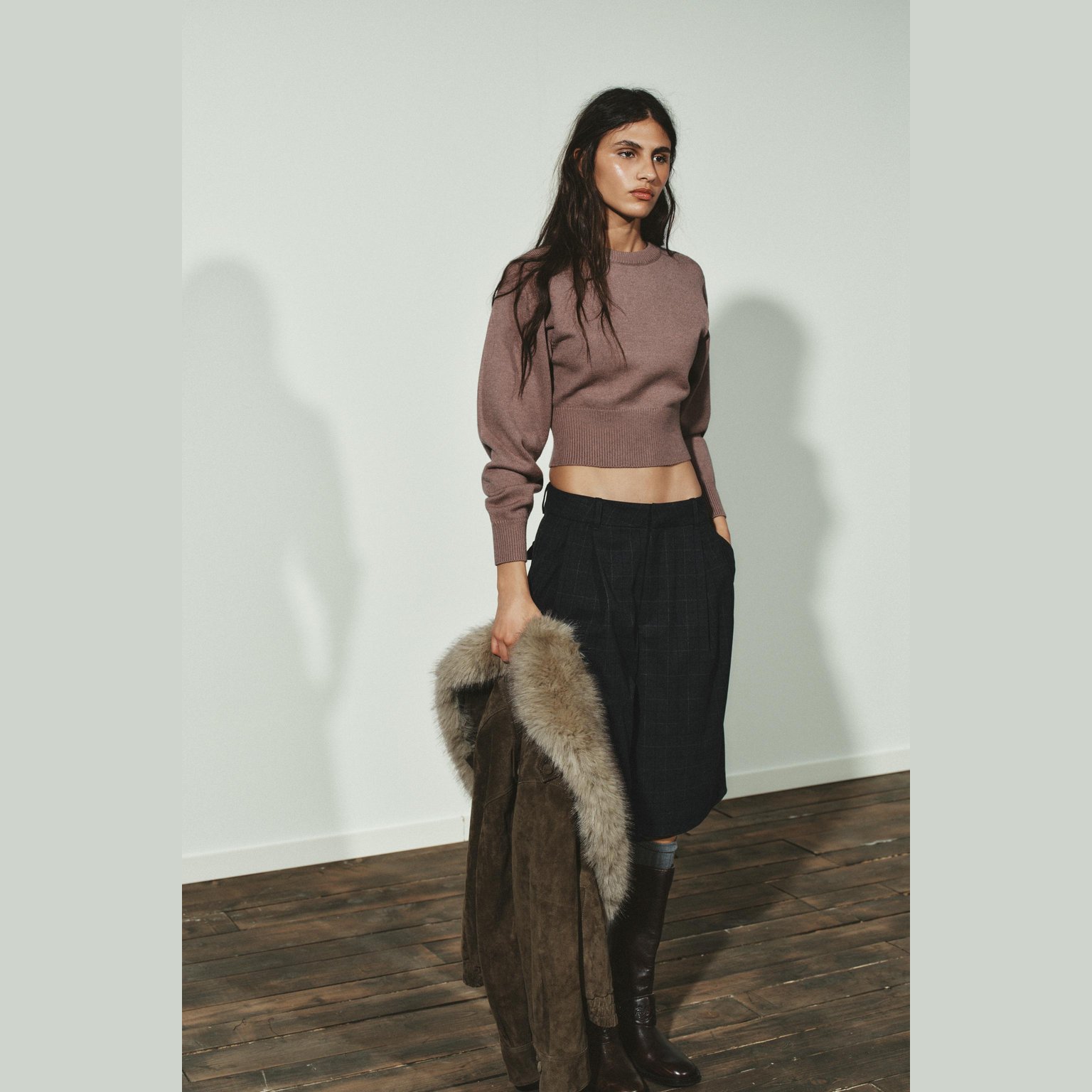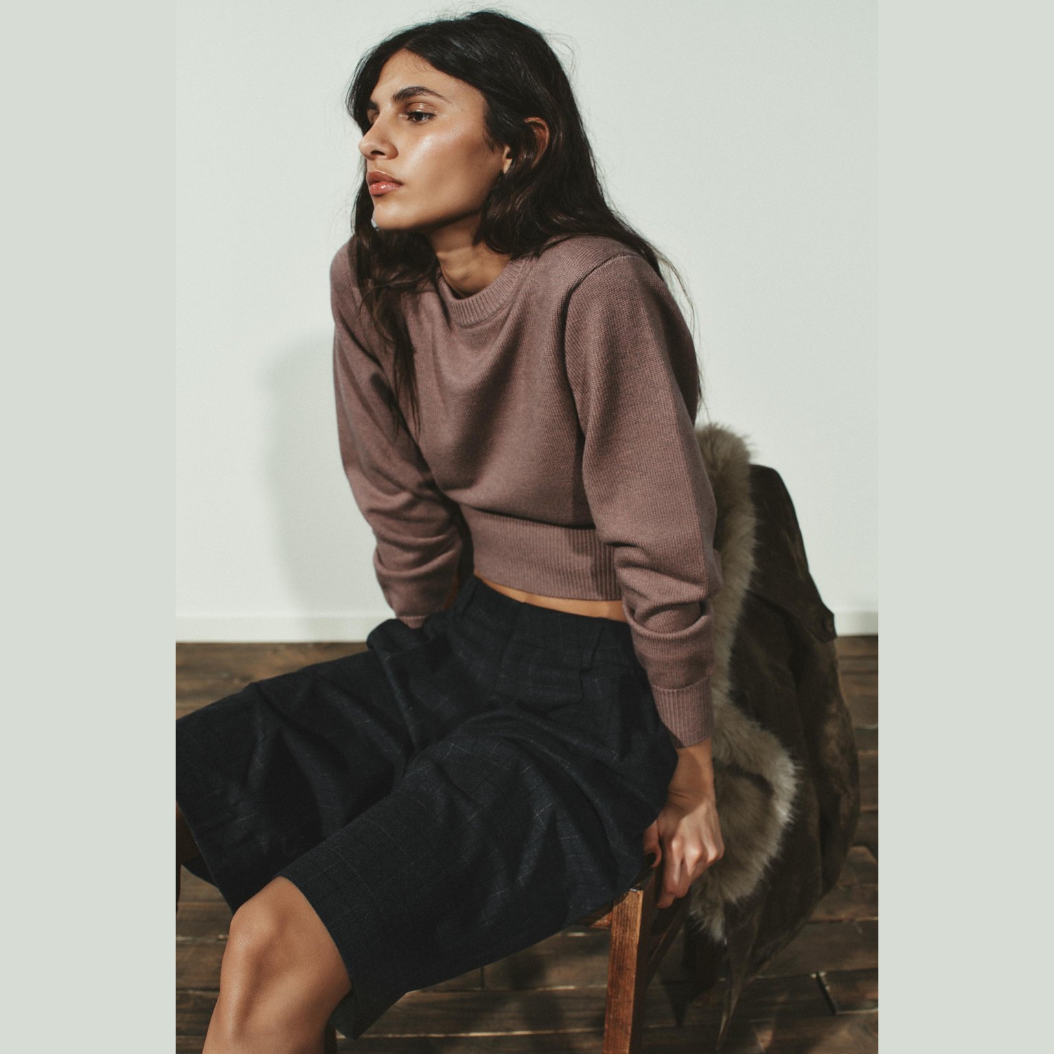 سويتر محبوك قصير أساسي – لون طبيعي (بني–تاوپ) – Brown/Taupe (Cropped Plain Knit Jumper) سويتر أنيق بلون بني–تاوپ طبيعي، مصنوع من خامة محبوكة عملية تمنح راحة وملمس عملي، مع تصميم قصير كلاسيكي يناسب مختلف الإطلالات. يتميز بياقة مستديرة، أكمام طويلة، وحواف مضلعة تضيف لمسة عملية وأنيقة. قطعة مثالية للتنسيقات اليومية الكاجوال الأنيقة أو كطبقة أساسية مع بنطلونات عالية الخصر أو تنانير.