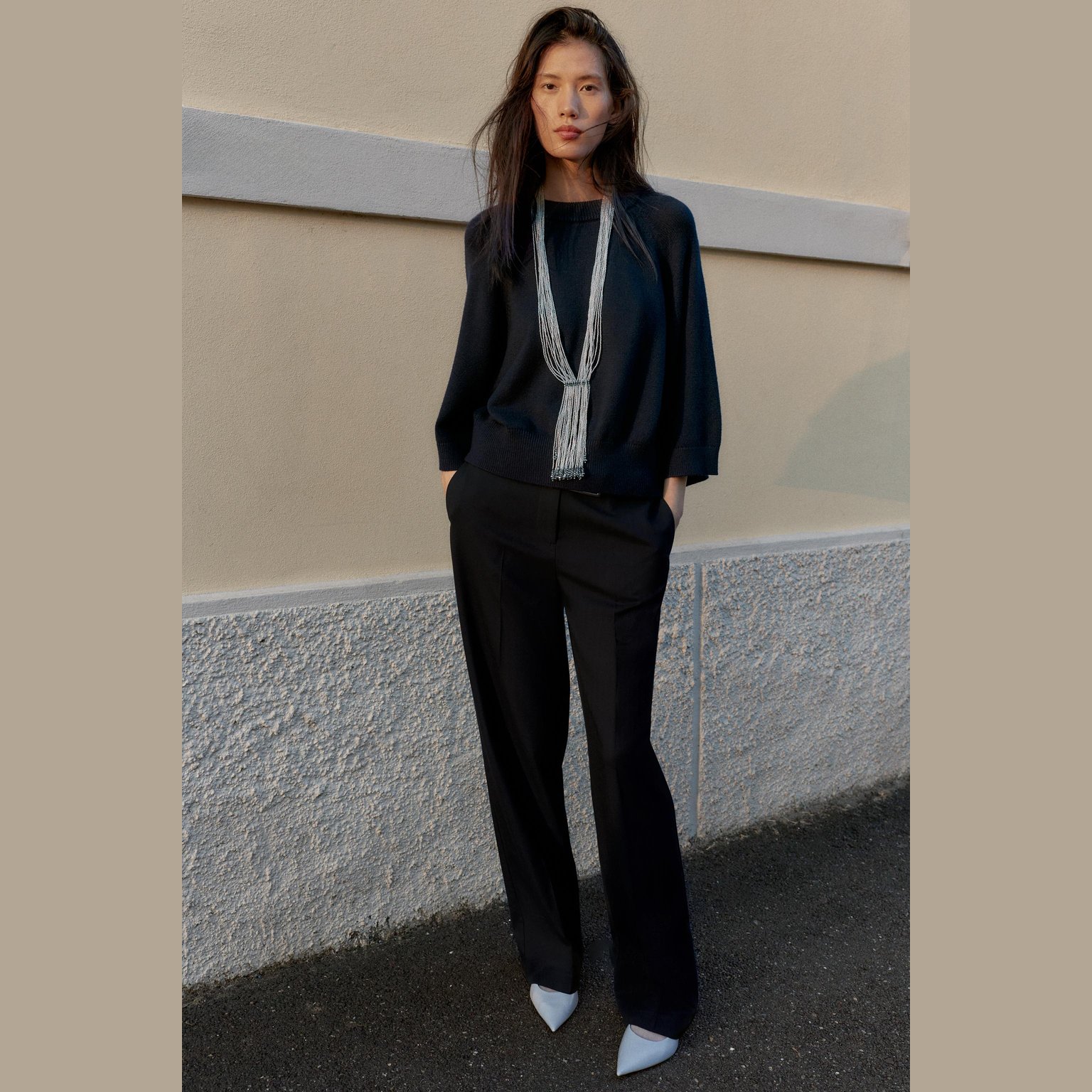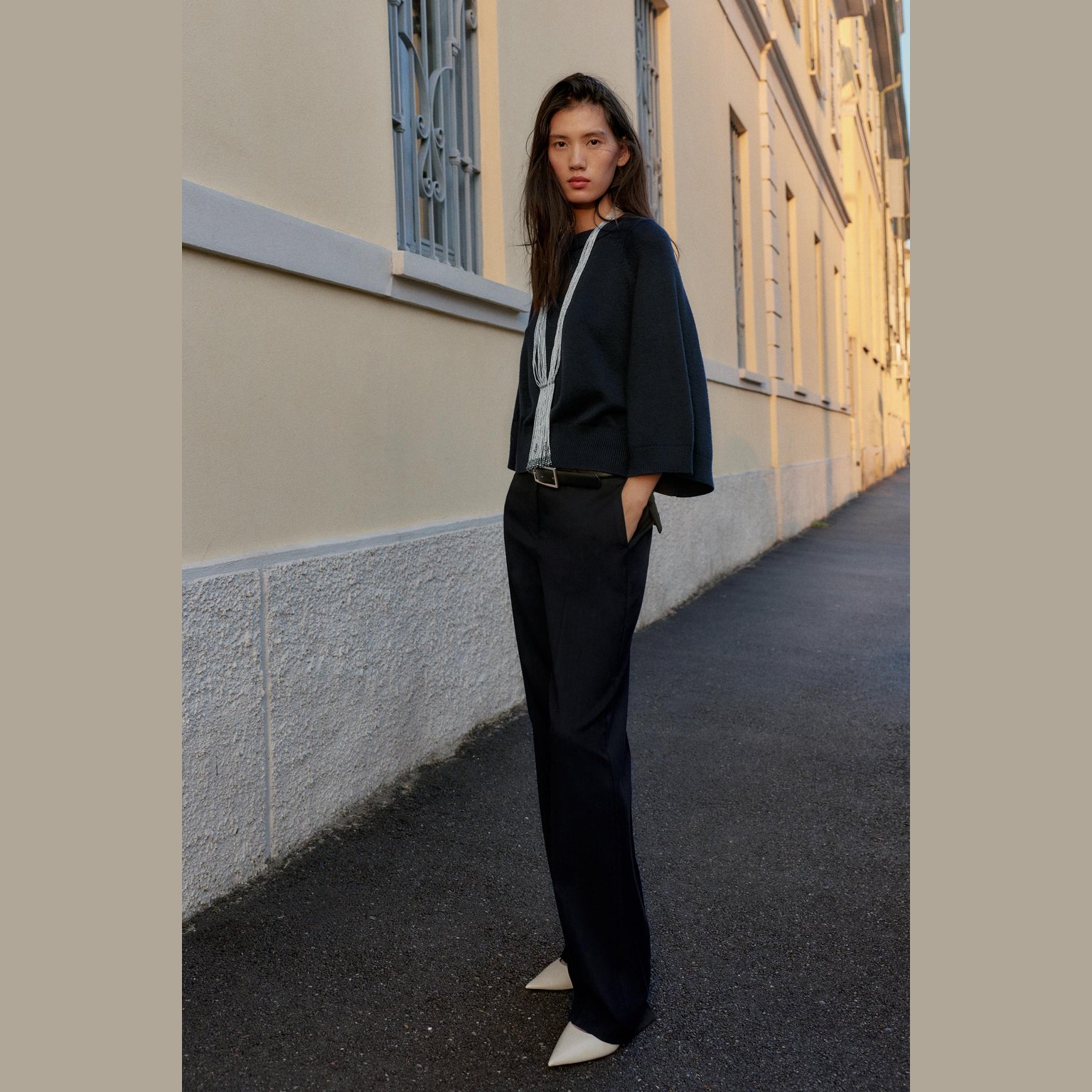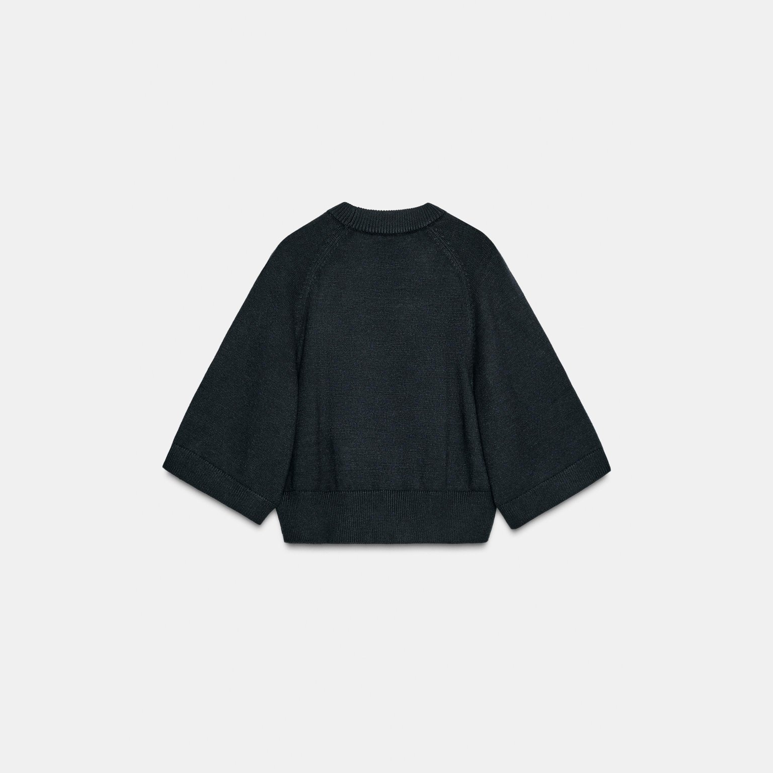 سويتر محبوك بأكمام واسعة – لون طبيعي (كحلي) – Navy Blue (Knit Jumper with Wide Sleeves) سويتر أنيق بلون كحلي طبيعي، مصنوع من خامة محبوكة عملية تمنح راحة وملمس عملي، مع تصميم كلاسيكي يتميز بأكمام واسعة أسفل المرفق تضيف لمسة عصرية مميزة. يتميز بياقة مستديرة وحواف مضلعة أنيقة. قطعة مثالية للإطلالات اليومية الكاجوال الأنيقة أو التنسيقات العملية في المواسم الانتقالية.