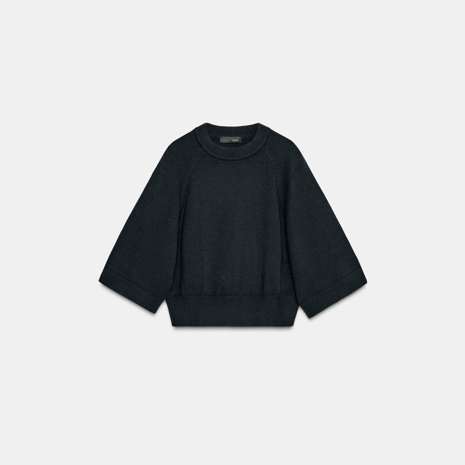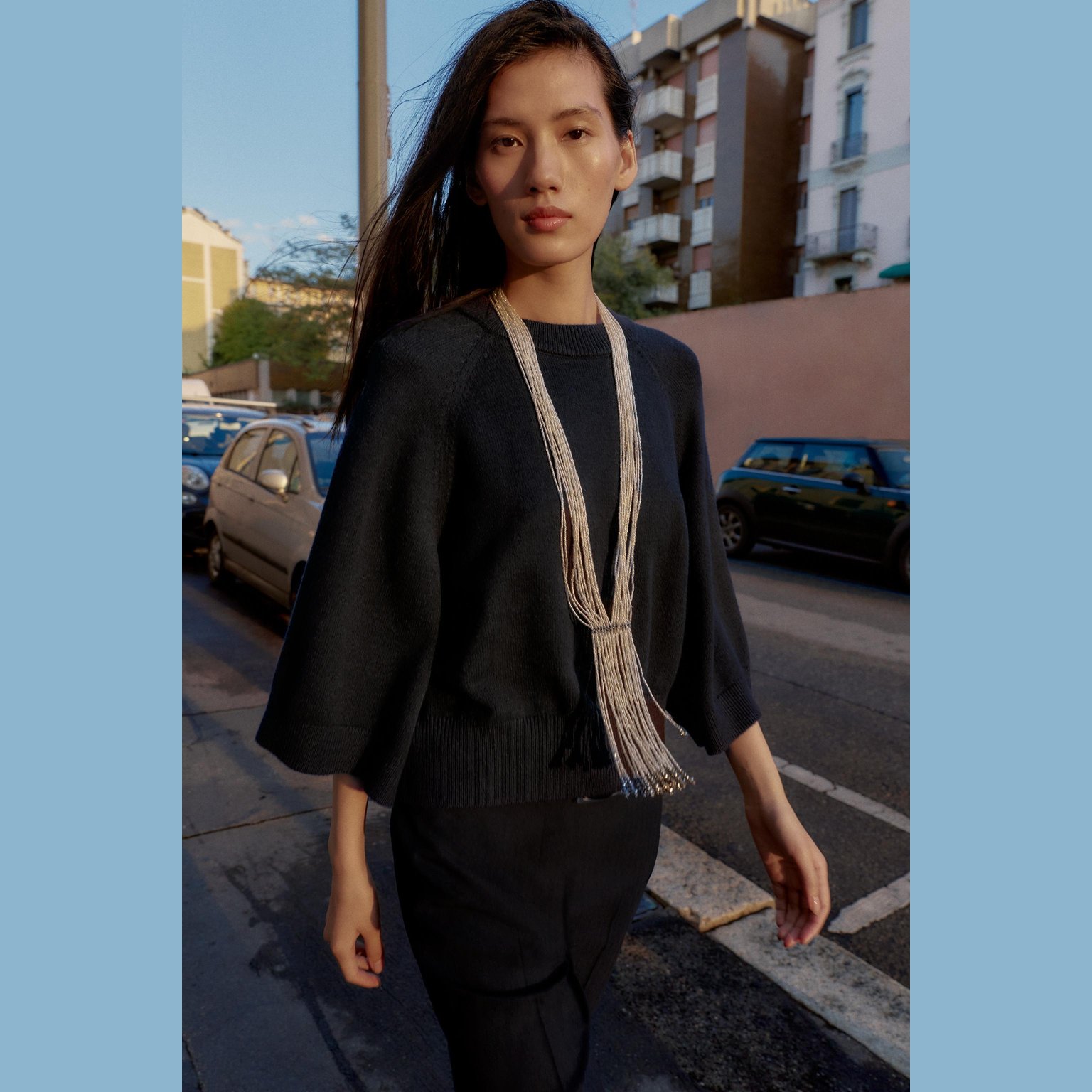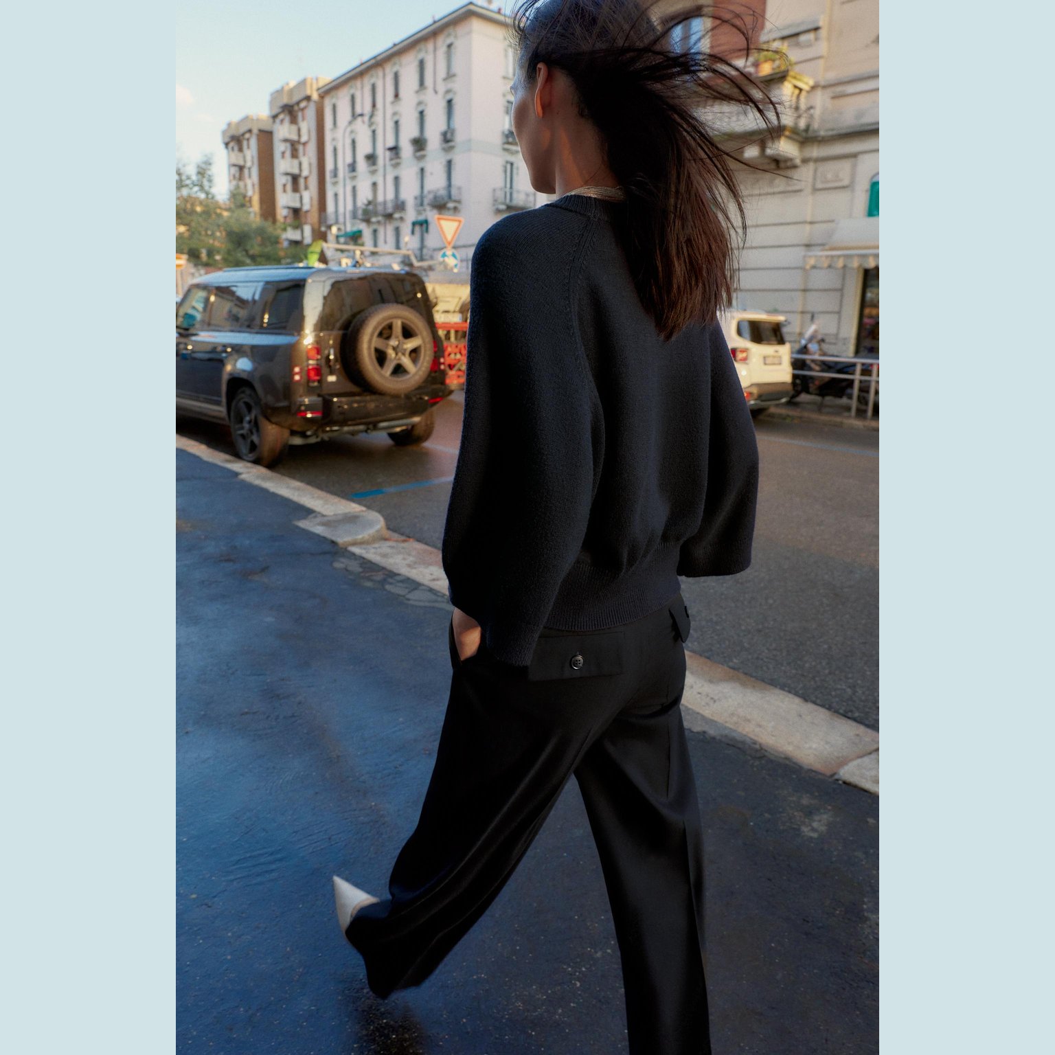 سويتر محبوك بأكمام واسعة – لون طبيعي (كحلي) – Navy Blue (Knit Jumper with Wide Sleeves) سويتر أنيق بلون كحلي طبيعي، مصنوع من خامة محبوكة عملية تمنح راحة وملمس عملي، مع تصميم كلاسيكي يتميز بأكمام واسعة أسفل المرفق تضيف لمسة عصرية مميزة. يتميز بياقة مستديرة وحواف مضلعة أنيقة. قطعة مثالية للإطلالات اليومية الكاجوال الأنيقة أو التنسيقات العملية في المواسم الانتقالية.