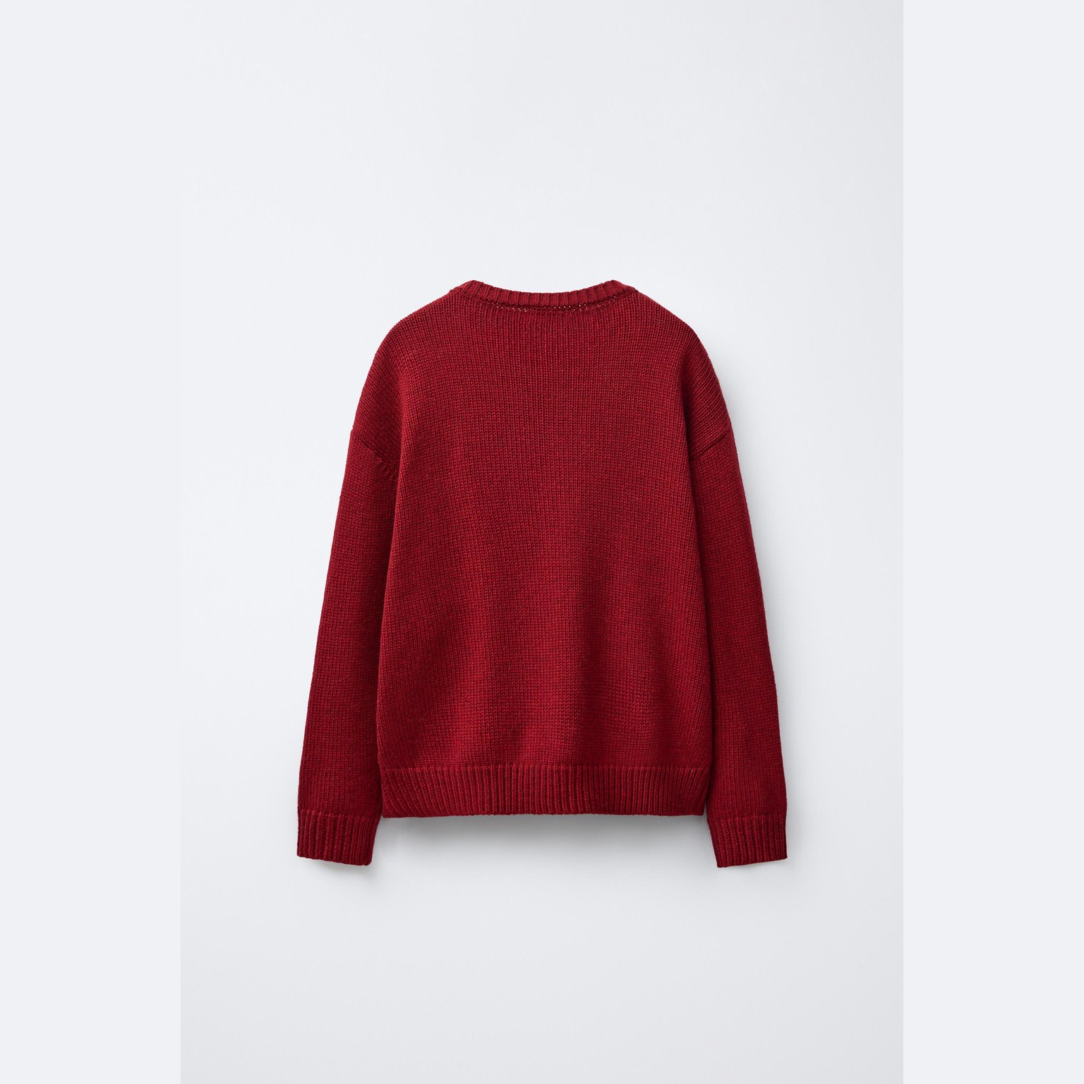 سويتر محبوك بمزيج الصوف مع تطريز دب – لون طبيعي (أحمر داكن) – Dark Red (Wool Blend Knit Jumper with Embroidered Bear) سويتر أنيق بلون أحمر داكن طبيعي، مصنوع من مزيج عملي من الصوف يمنح دفئًا وراحة، مع تصميم كلاسيكي مزين بتطريز دب على الأمام يضيف لمسة مرحة وعصرية. يتميز بياقة مستديرة، أكمام طويلة، وحواف مضلعة أنيقة. قطعة مثالية للإطلالات اليومية الكاجوال الأنيقة أو التنسيقات العملية في المواسم الانتقالية.