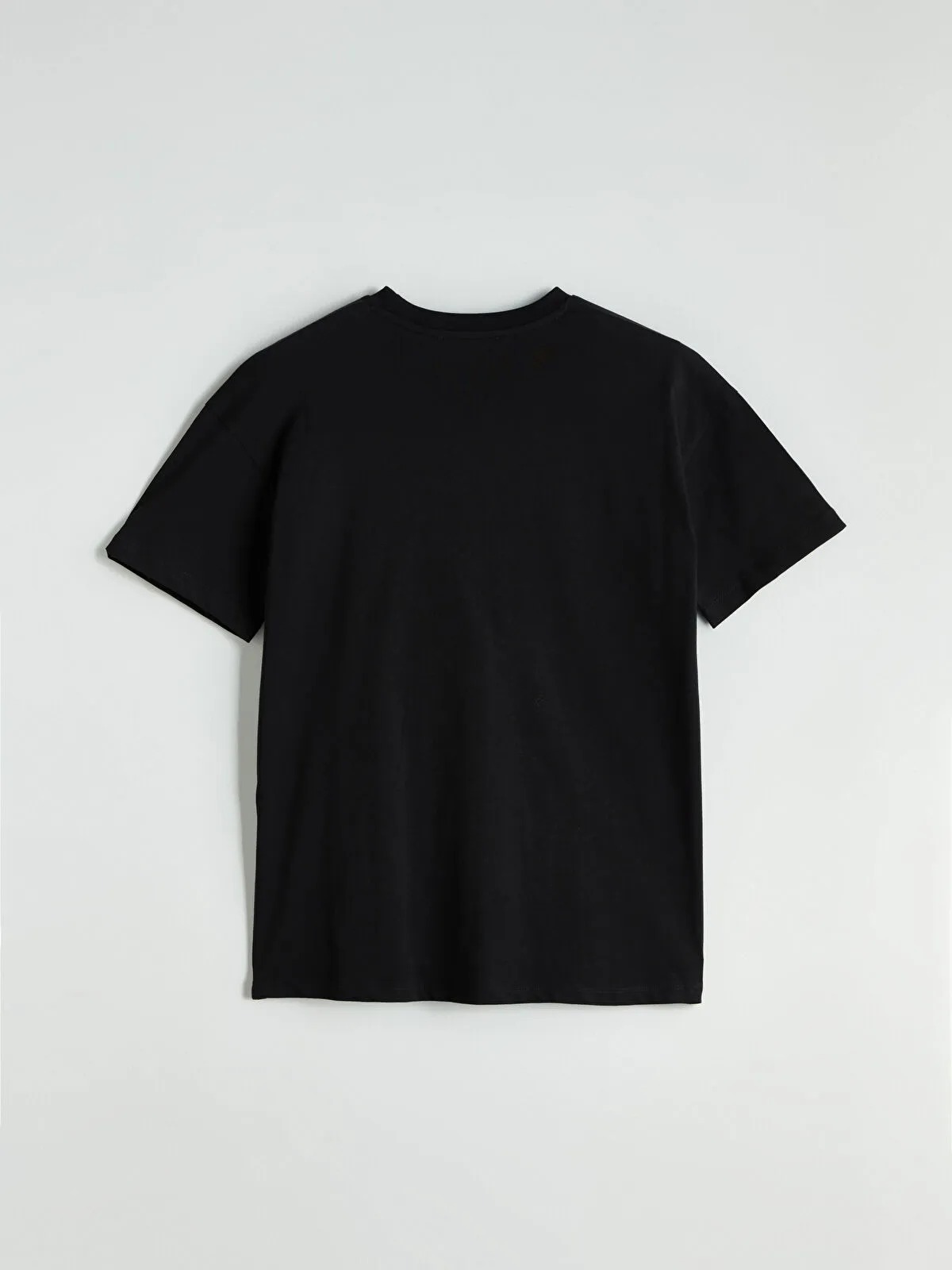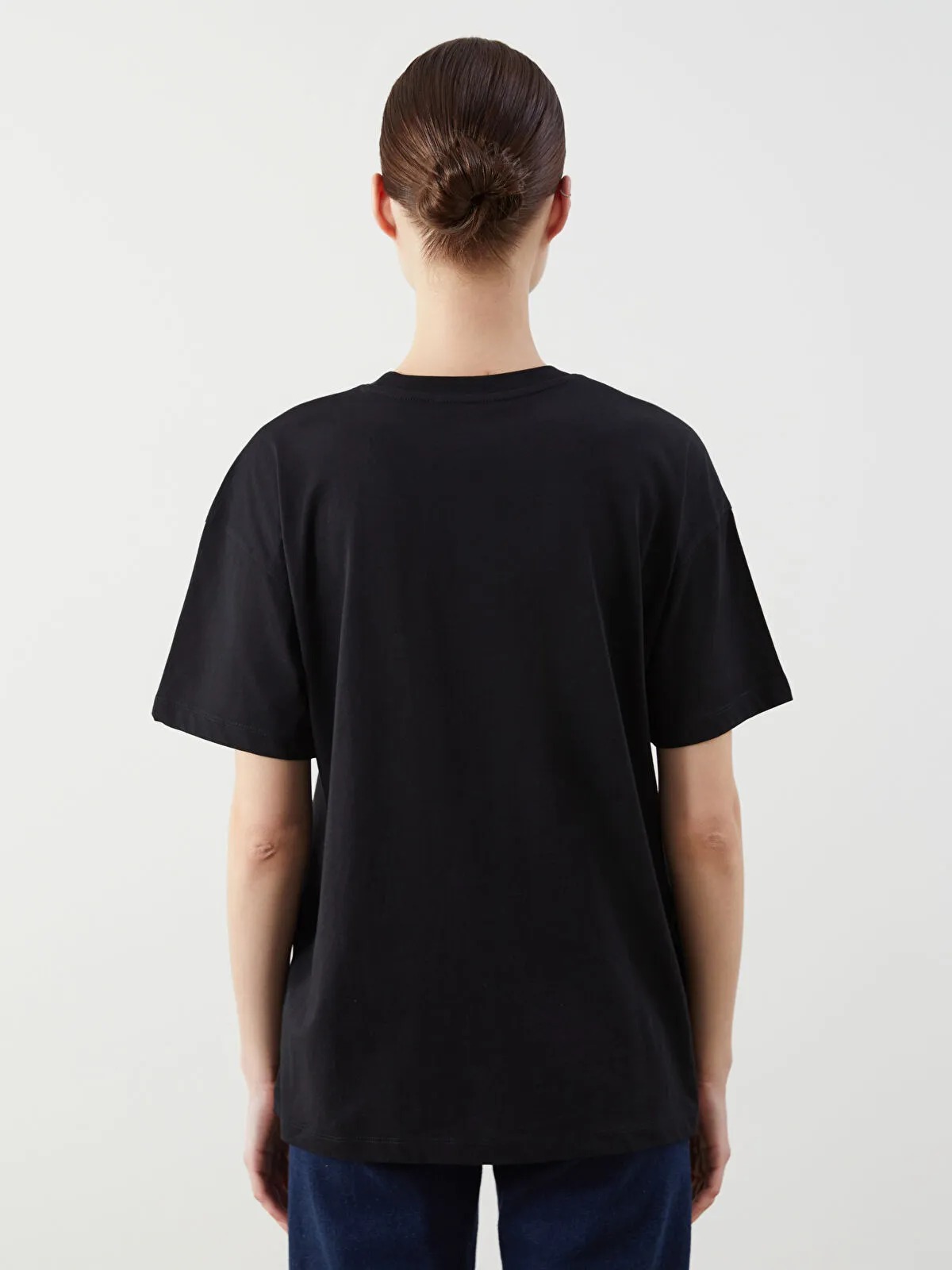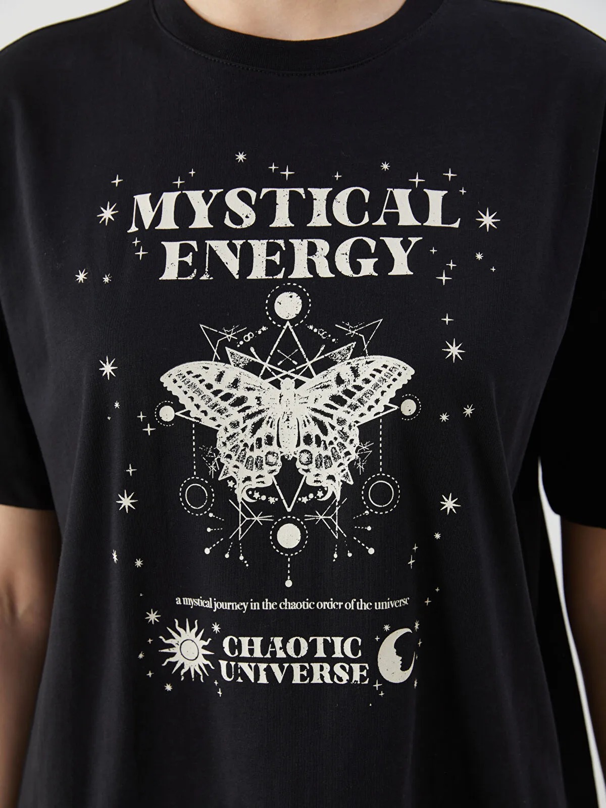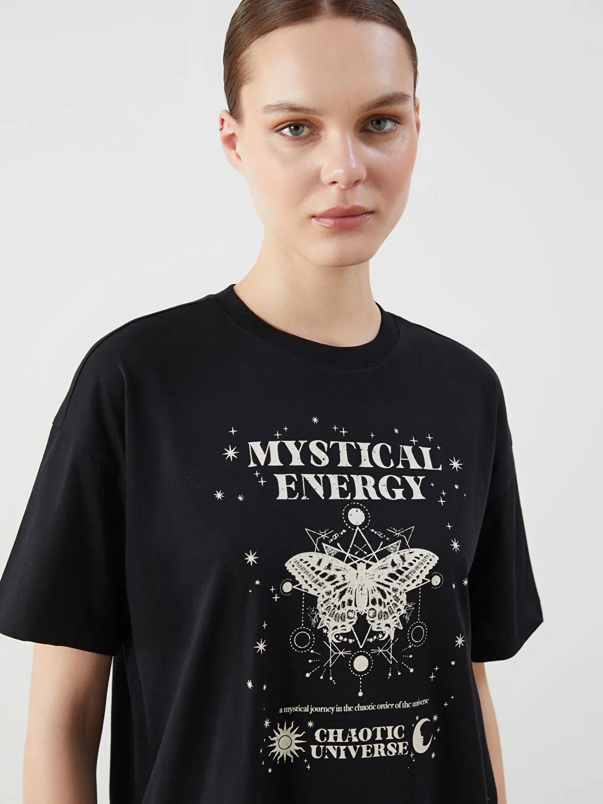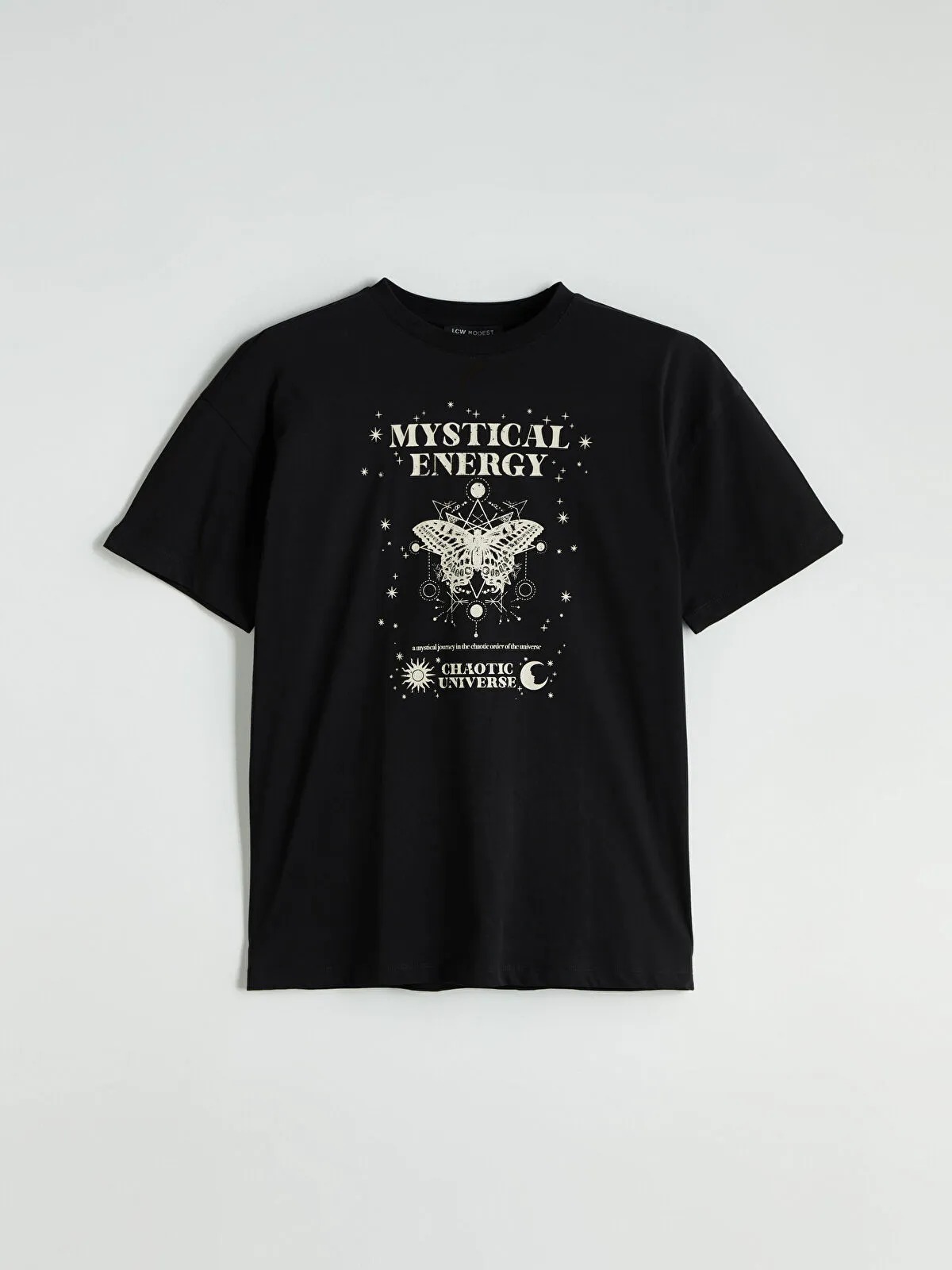 تيشيرت نسائي بلون أسود ناصع، بياقة دائرية قصيرة وأكمام قصيرة، مزين بطبعة رسمية لعناصر أنيقة تضيف لمسة شبابية وعصرية إلى الإطلالة. تصميم Loose Fit يمنح حرية حركة وراحة طوال اليوم، مثالي للإطلالة الكاجوال اليومية بأسلوب متوازن وأنيق.