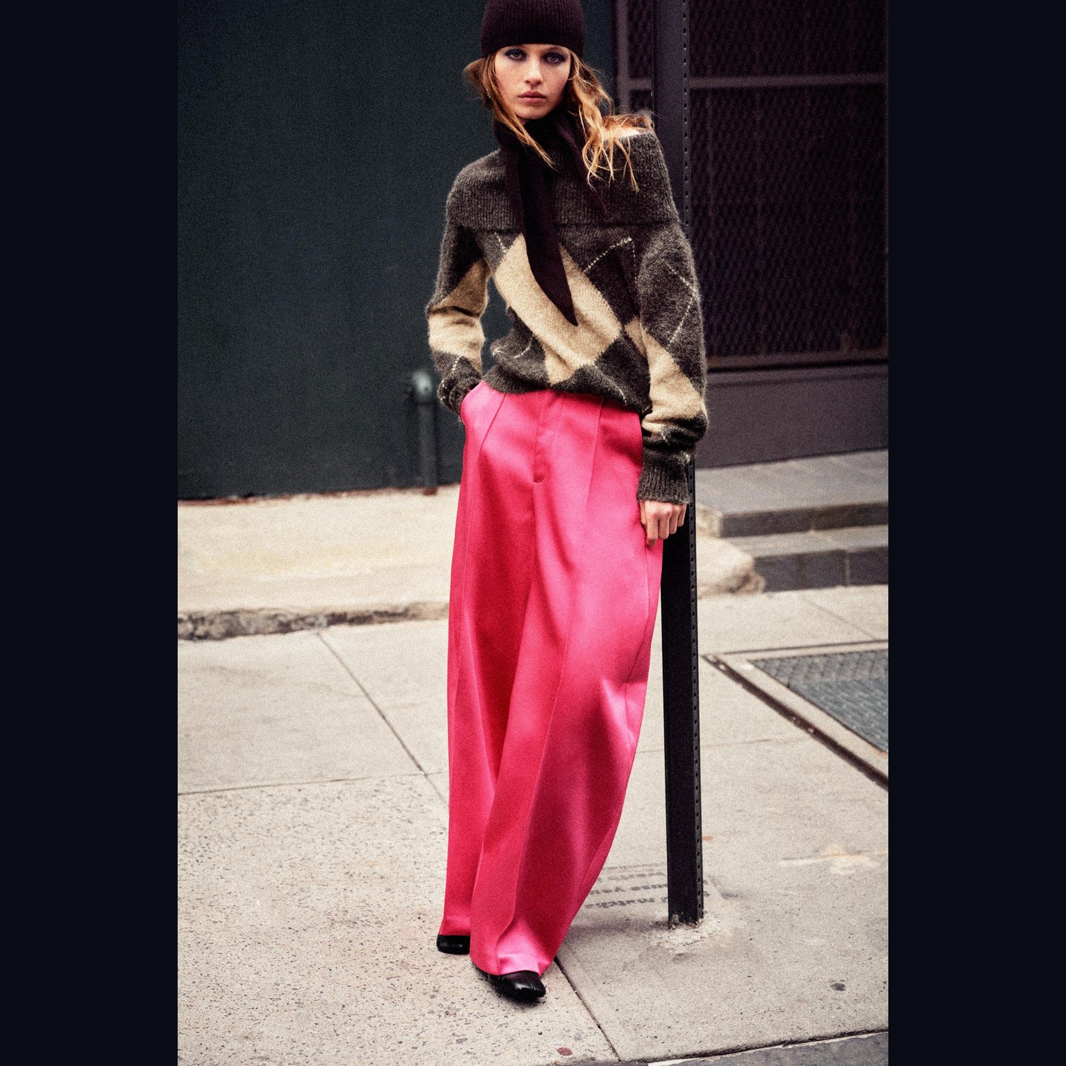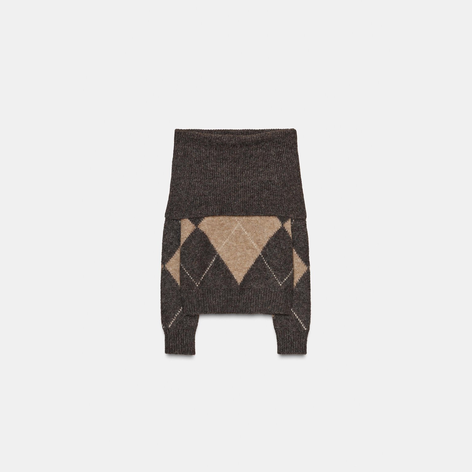 - التصميم: سويتر محبوك بدون أكتاف بنقشة ماسية (Diamond Pattern Strapless Knit Jumper)