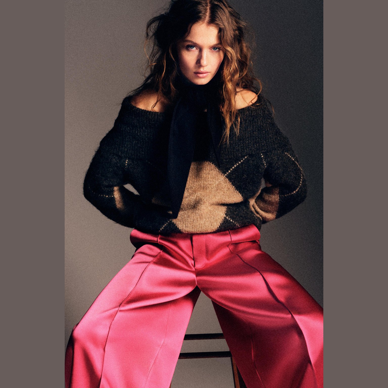سويتر محبوك بدون أكتاف بنقشة ماسية – لون طبيعي (رمادي–بيج) – Grey/Beige (Diamond Pattern Strapless Knit Jumper) سويتر أنيق بلون رمادي–بيج طبيعي، مصنوع من خامة محبوكة عملية تمنح راحة وملمس عملي، مع تصميم بدون أكتاف مزين بنقشة ماسية تضيف لمسة عصرية مميزة. يتميز بياقة مستقيمة مع طيّة علوية، أكمام طويلة، وحواف مضلعة أنيقة. قطعة مثالية للإطلالات اليومية الكاجوال الأنيقة أو التنسيقات العملية في المواسم الانتقالية.