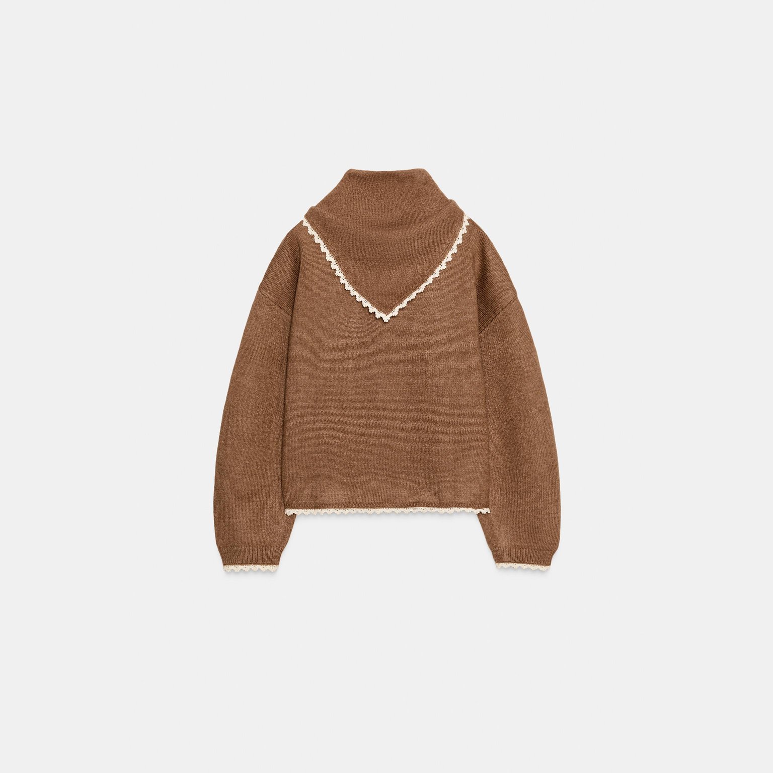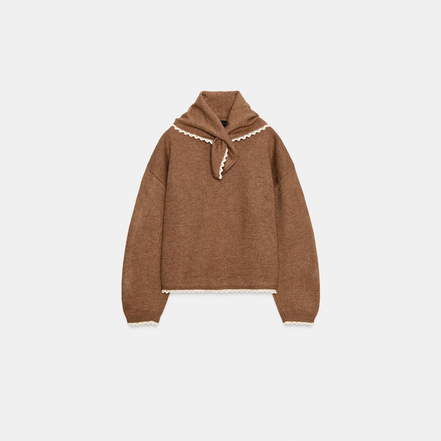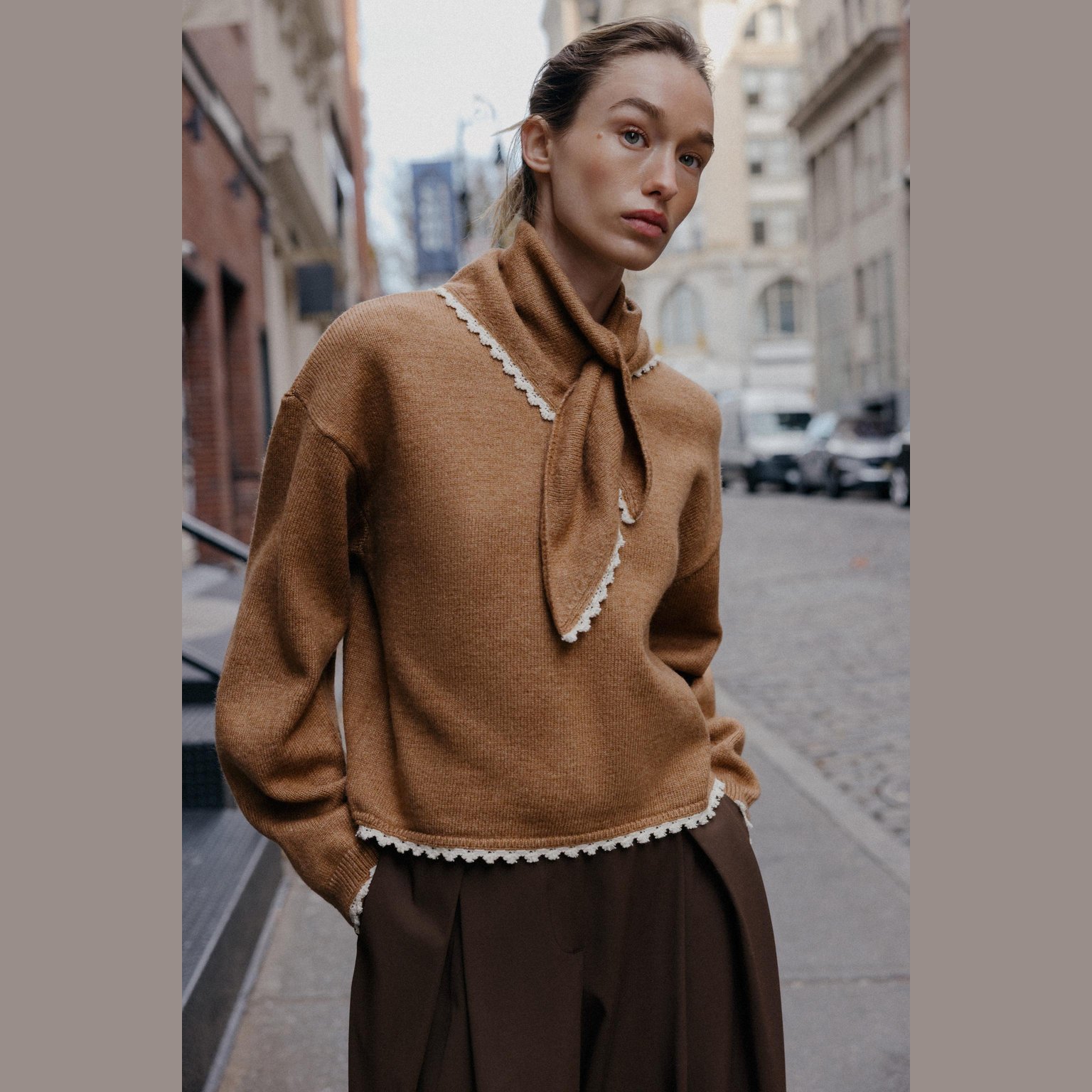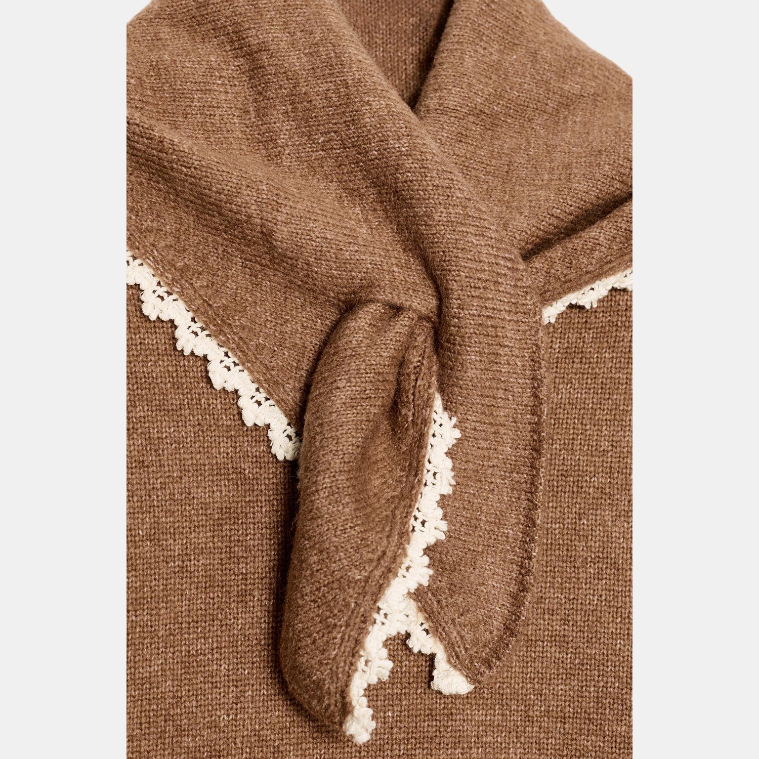 سويتر محبوك مع بندانا وتفاصيل دانتيل – لون طبيعي (جملي متوسط) – Mid-Camel (Knit Jumper with Bandana and Lace Trim) سويتر أنيق بلون جملي متوسط طبيعي، مصنوع من خامة محبوكة عملية تمنح راحة وملمس عملي، مع تصميم كلاسيكي مزين ببندانا مدمجة وتفاصيل دانتيل متباينة تضيف لمسة أنثوية مميزة. يتميز بياقة مستديرة، أكمام طويلة، وحواف مضلعة أنيقة. قطعة مثالية للإطلالات اليومية الكاجوال الأنيقة أو التنسيقات العملية في المواسم الانتقالية.