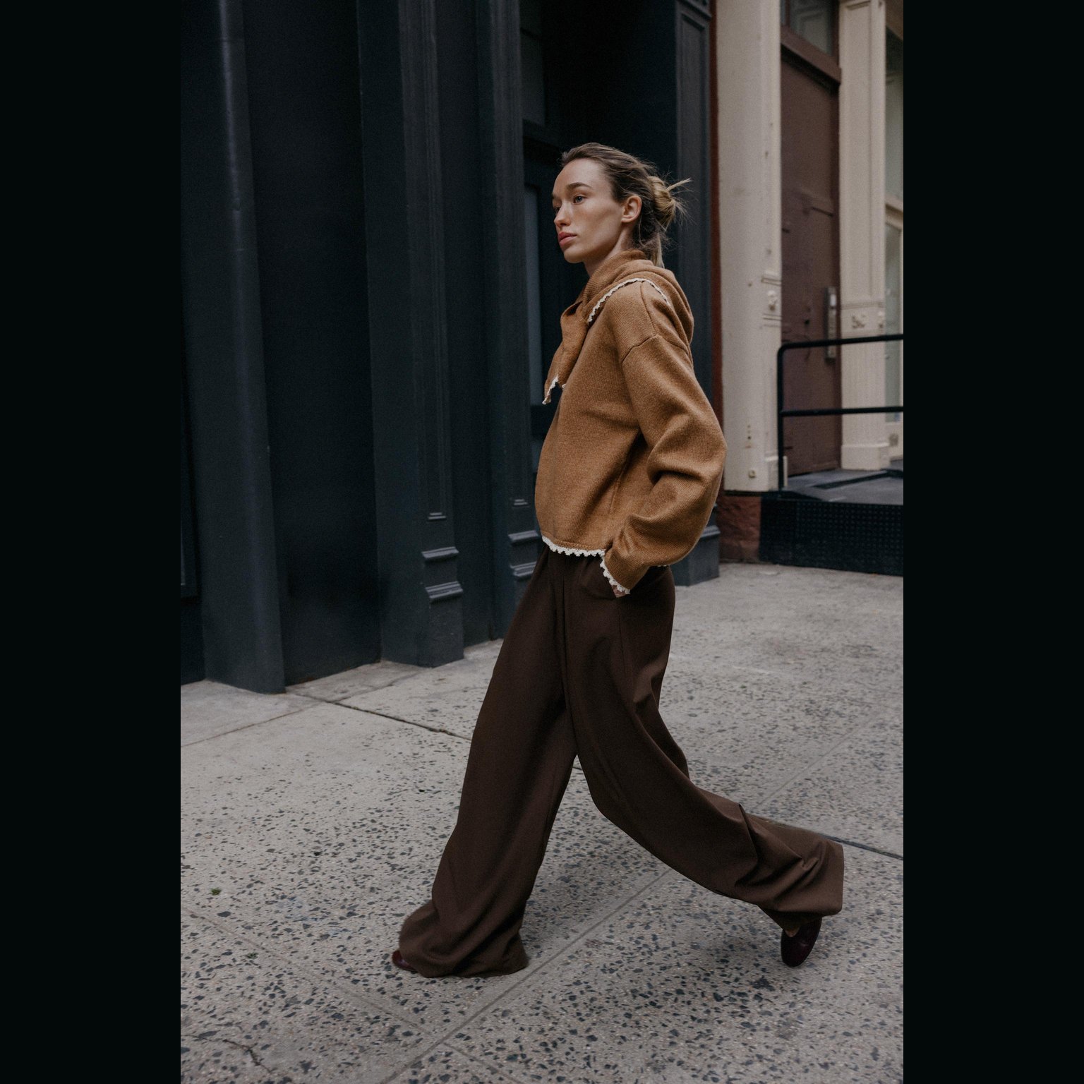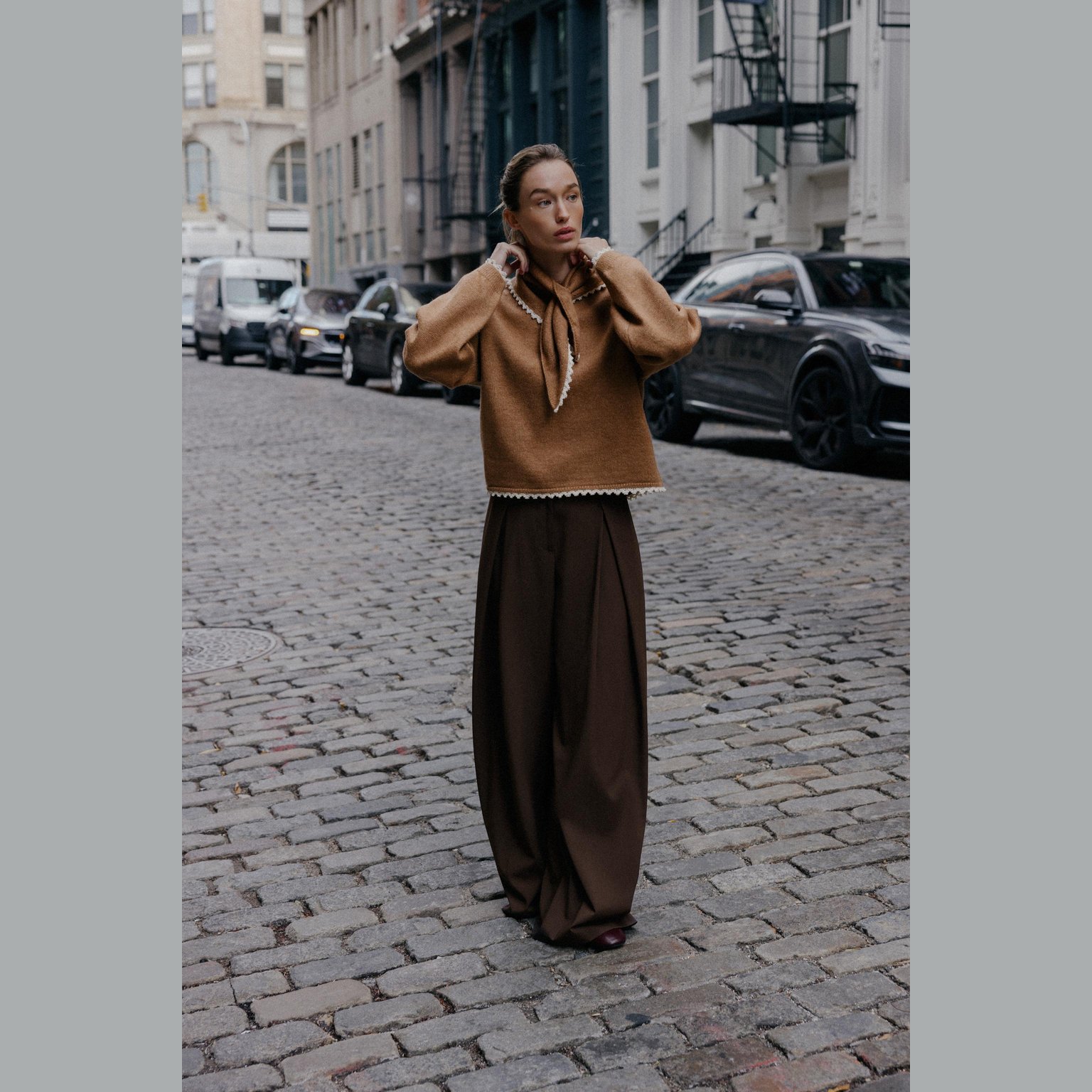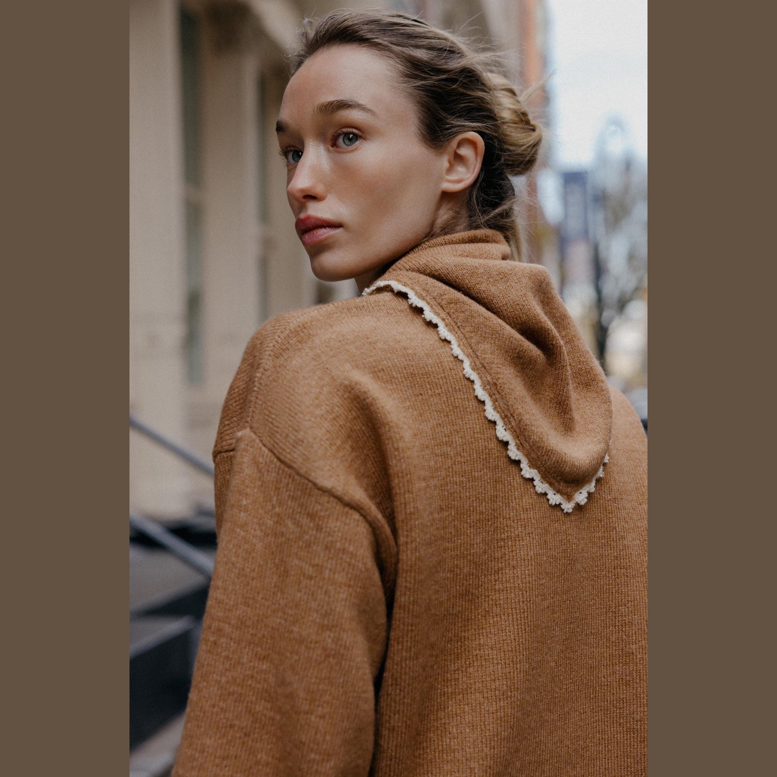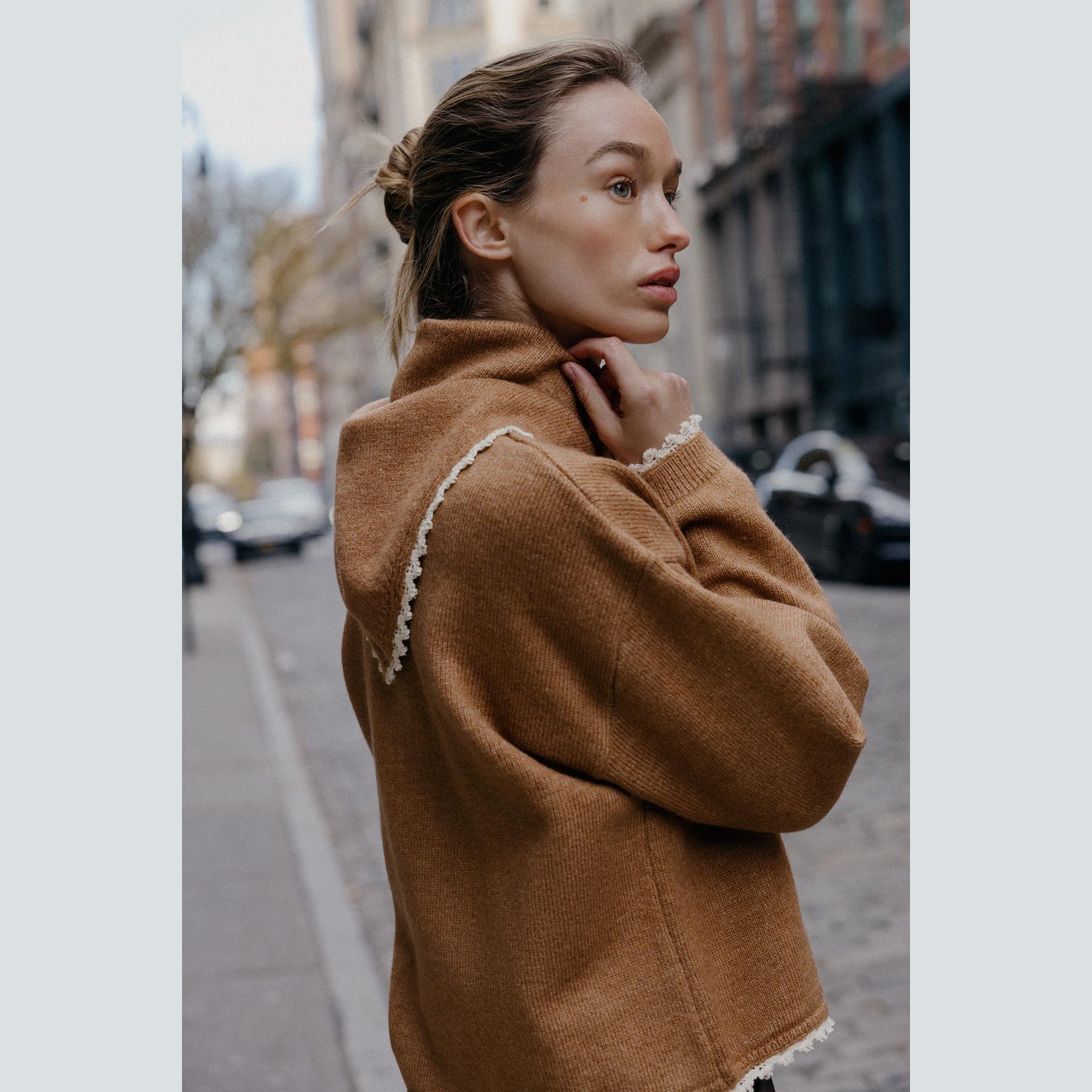 سويتر محبوك مع بندانا وتفاصيل دانتيل – لون طبيعي (جملي متوسط) – Mid-Camel (Knit Jumper with Bandana and Lace Trim) سويتر أنيق بلون جملي متوسط طبيعي، مصنوع من خامة محبوكة عملية تمنح راحة وملمس عملي، مع تصميم كلاسيكي مزين ببندانا مدمجة وتفاصيل دانتيل متباينة تضيف لمسة أنثوية مميزة. يتميز بياقة مستديرة، أكمام طويلة، وحواف مضلعة أنيقة. قطعة مثالية للإطلالات اليومية الكاجوال الأنيقة أو التنسيقات العملية في المواسم الانتقالية.