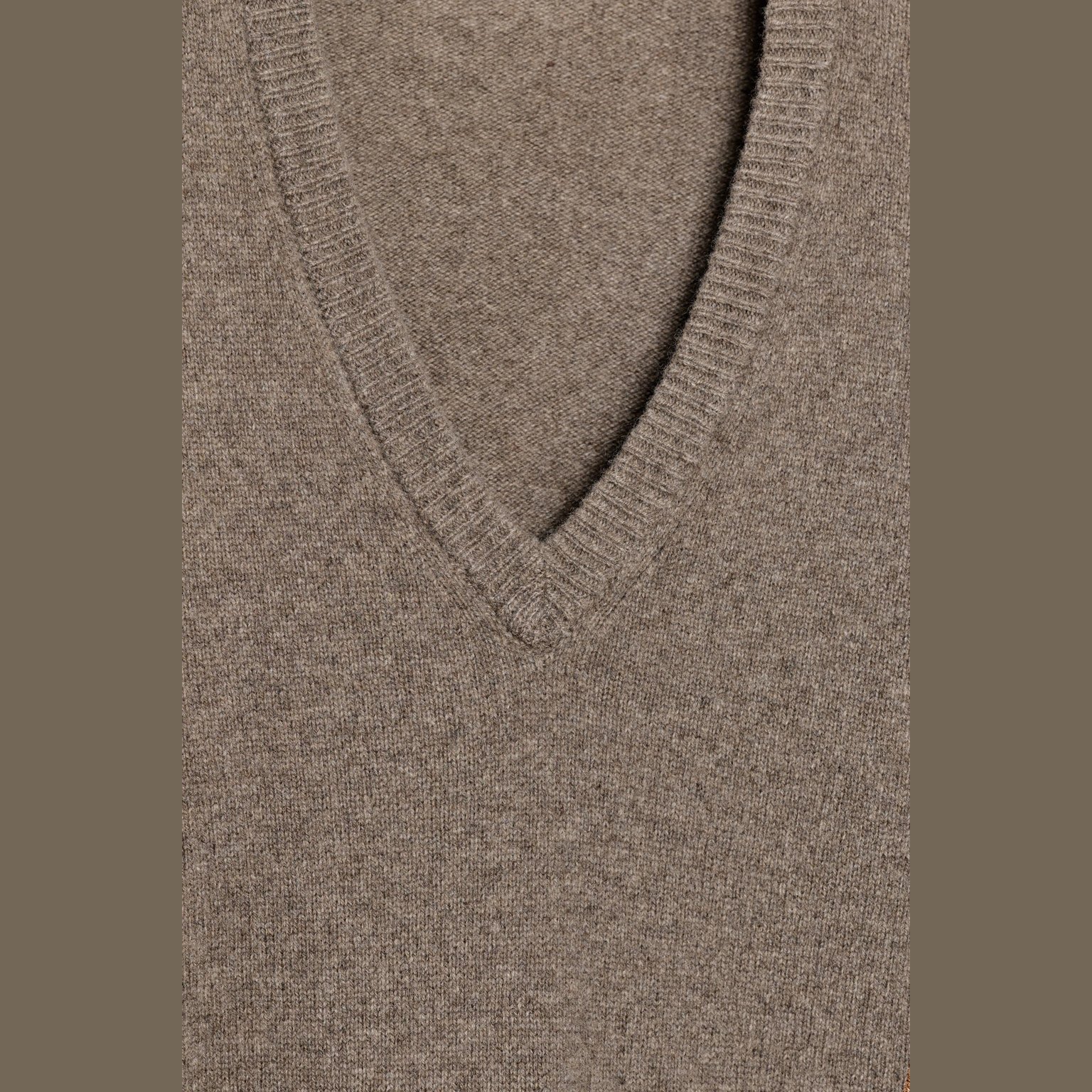 سويتر محبوك من الكشمير والصوف بياقة V – لون طبيعي (بني–تاوپ) – Brown/Taupe (Cashmere and Wool V-Neck Jumper) سويتر أنيق بلون بني–تاوپ طبيعي، مصنوع من مزيج فاخر من الكشمير والصوف يمنح دفئًا وملمسًا ناعمًا، مع تصميم كلاسيكي بياقة V تضيف لمسة عصرية مميزة. يتميز بأكمام طويلة وحواف مضلعة أنيقة. قطعة مثالية للتنسيقات اليومية الكاجوال الأنيقة أو كطبقة أساسية في المواسم الانتقالية.