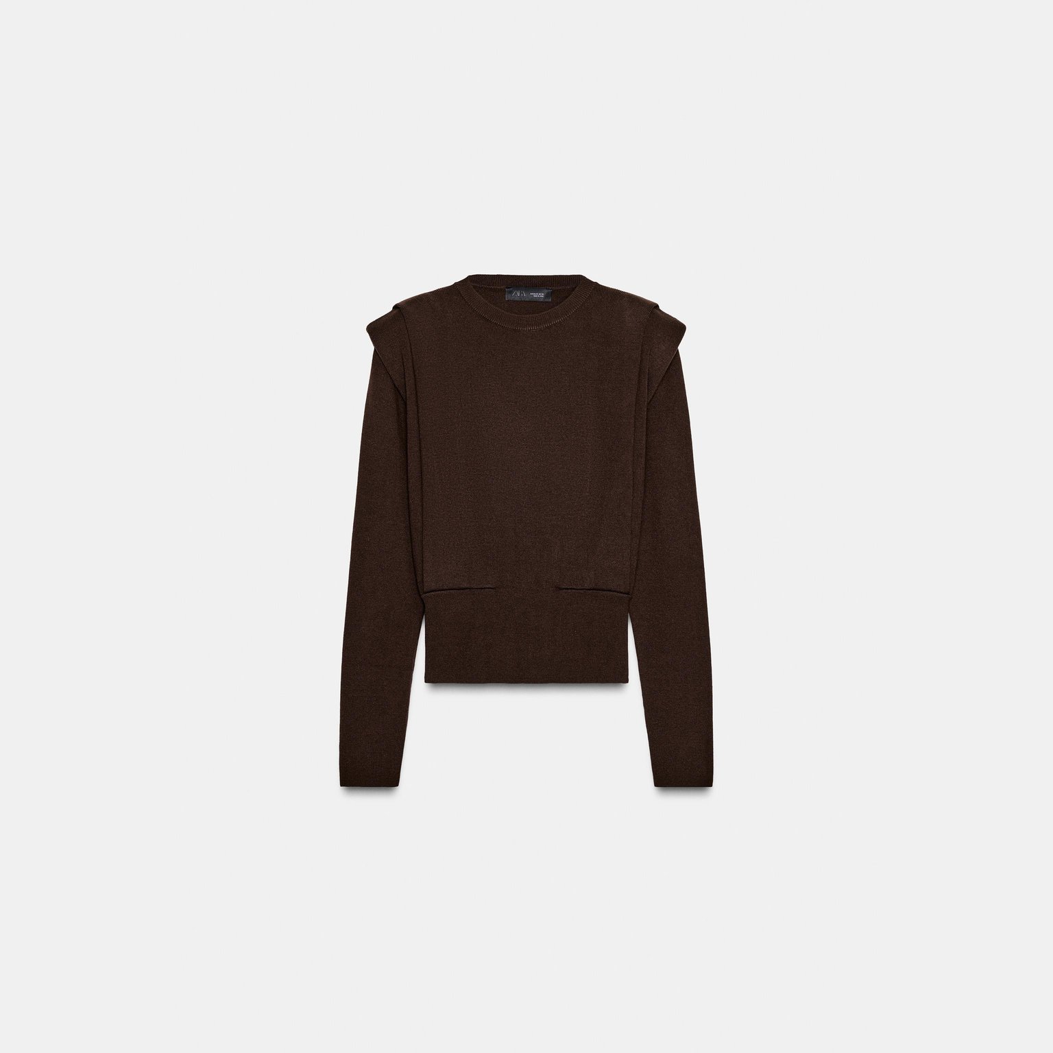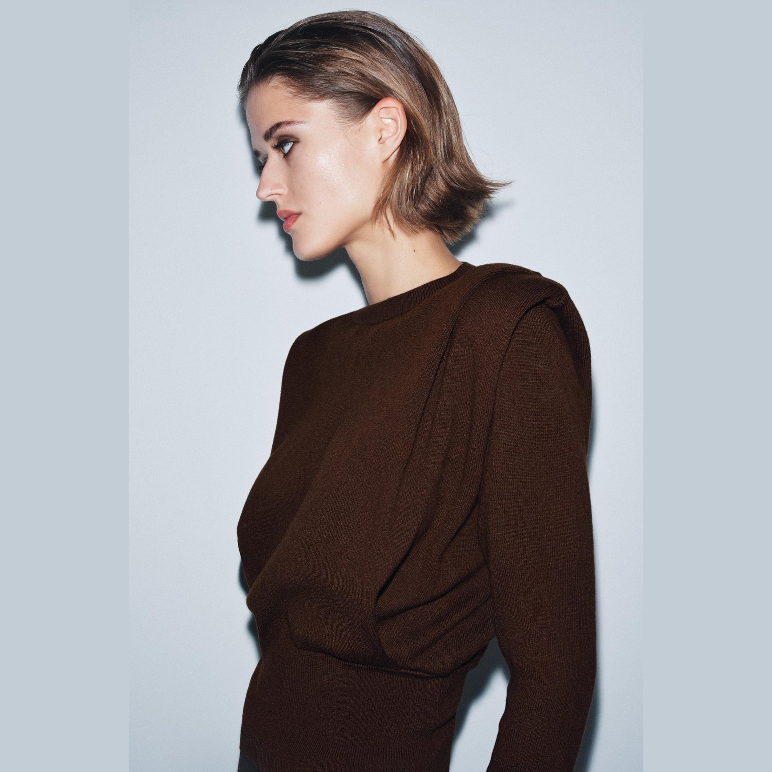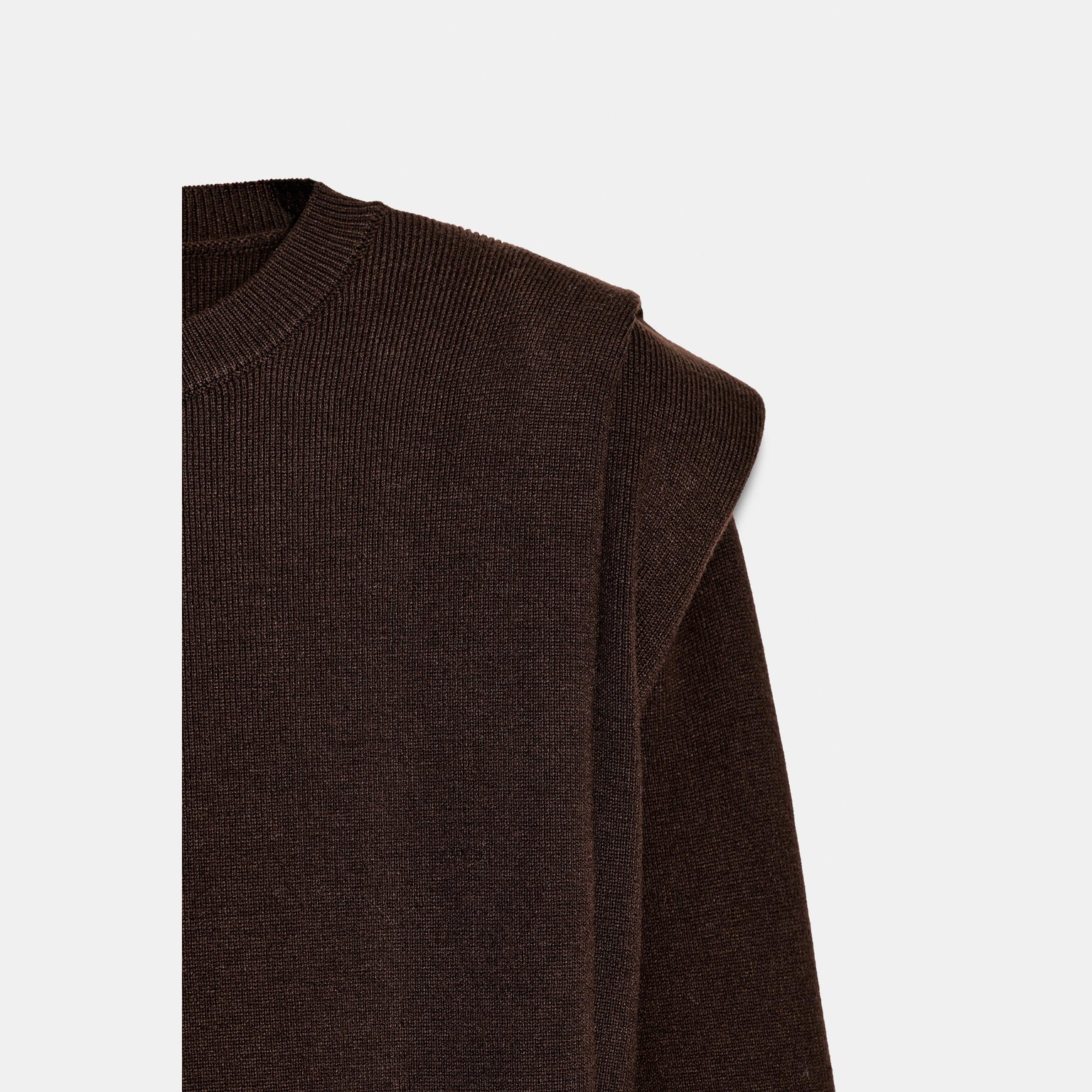 سويتر محبوك مع حشوات كتف – لون طبيعي (بني) – Brown (Knit Jumper with Shoulder Pads) سويتر أنيق بلون بني طبيعي، مصنوع من خامة محبوكة عملية تمنح راحة ودفئًا، مع تصميم كلاسيكي مزود بحشوات كتف تضيف لمسة عصرية وهيكلية مميزة. يتميز بياقة مستديرة، أكمام طويلة، وحواف مضلعة أنيقة. قطعة مثالية للتنسيقات اليومية الكاجوال الأنيقة أو كطبقة إضافية في المواسم الانتقالية.