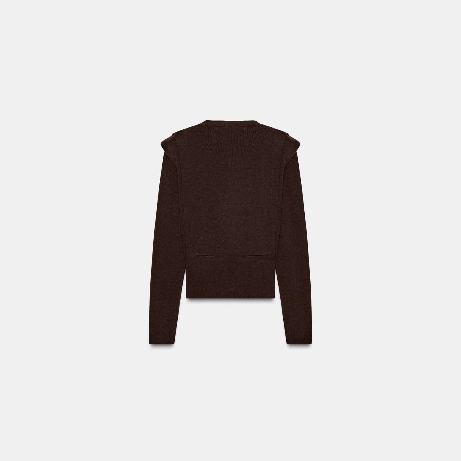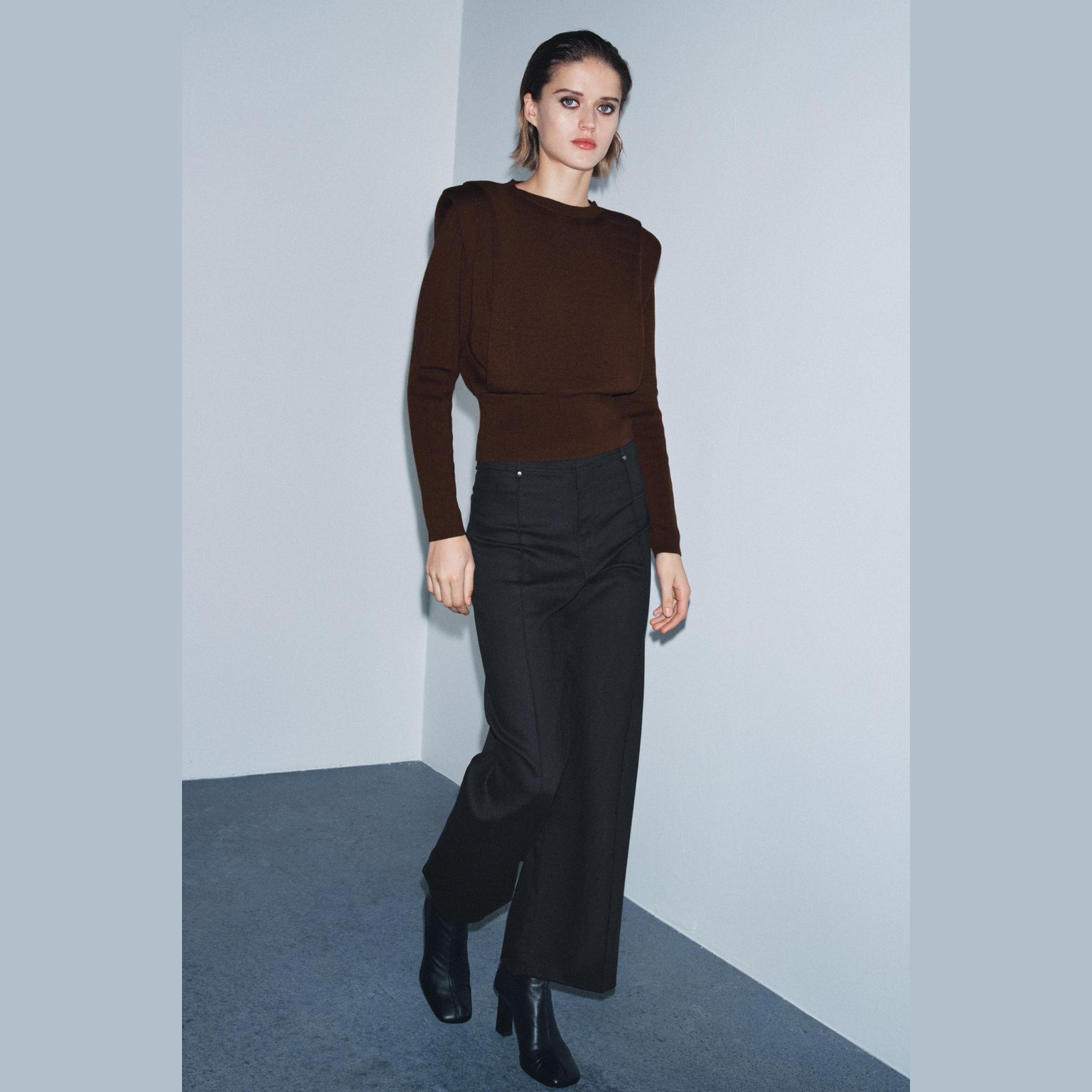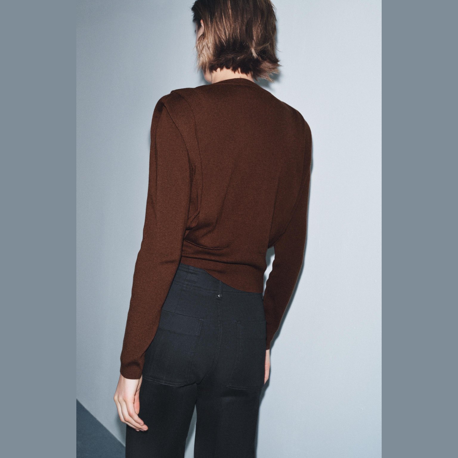 سويتر محبوك مع حشوات كتف – لون طبيعي (بني) – Brown (Knit Jumper with Shoulder Pads) سويتر أنيق بلون بني طبيعي، مصنوع من خامة محبوكة عملية تمنح راحة ودفئًا، مع تصميم كلاسيكي مزود بحشوات كتف تضيف لمسة عصرية وهيكلية مميزة. يتميز بياقة مستديرة، أكمام طويلة، وحواف مضلعة أنيقة. قطعة مثالية للتنسيقات اليومية الكاجوال الأنيقة أو كطبقة إضافية في المواسم الانتقالية.