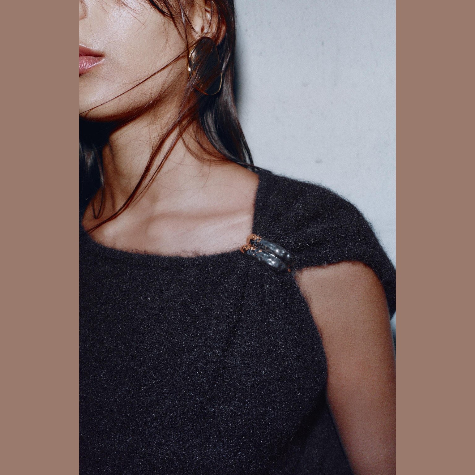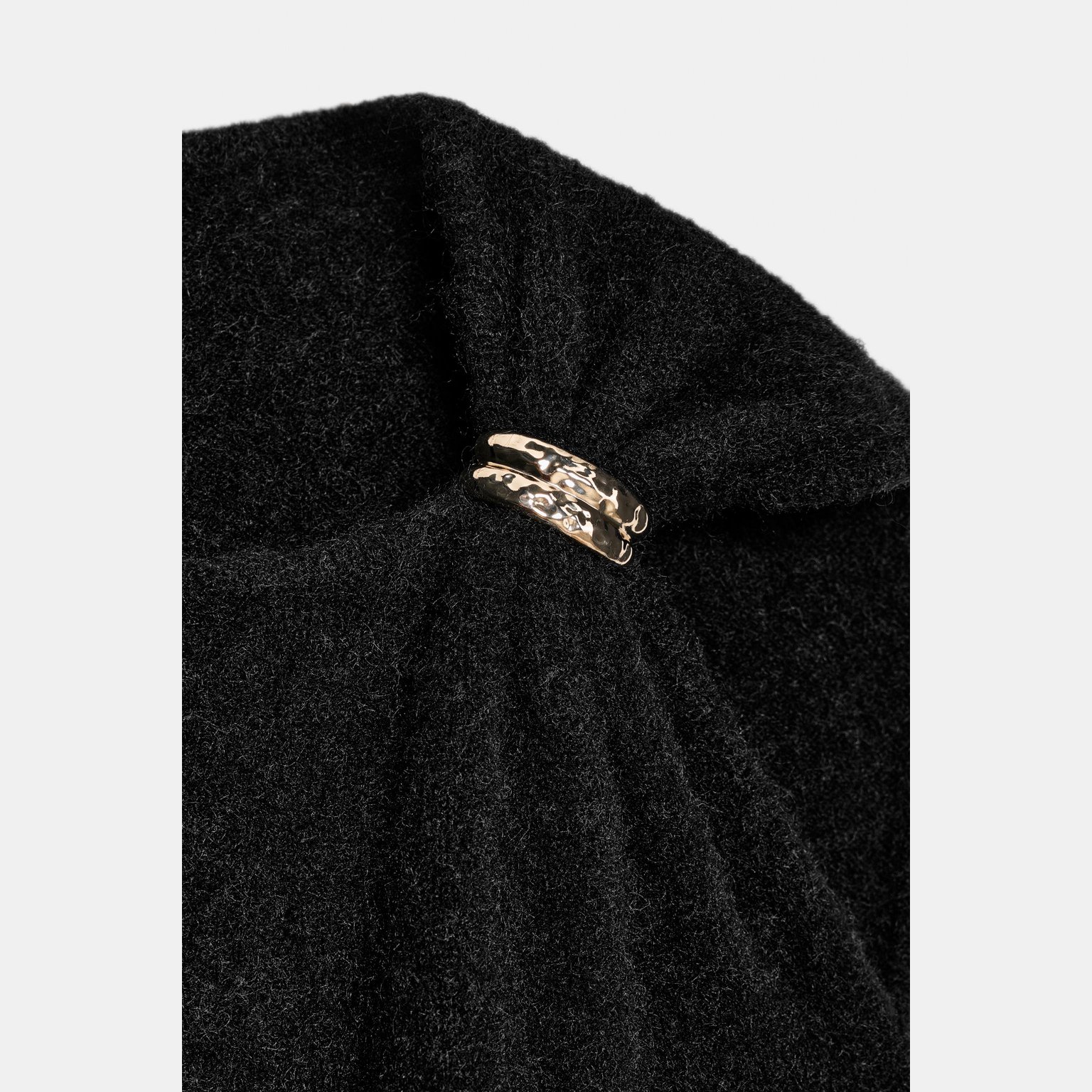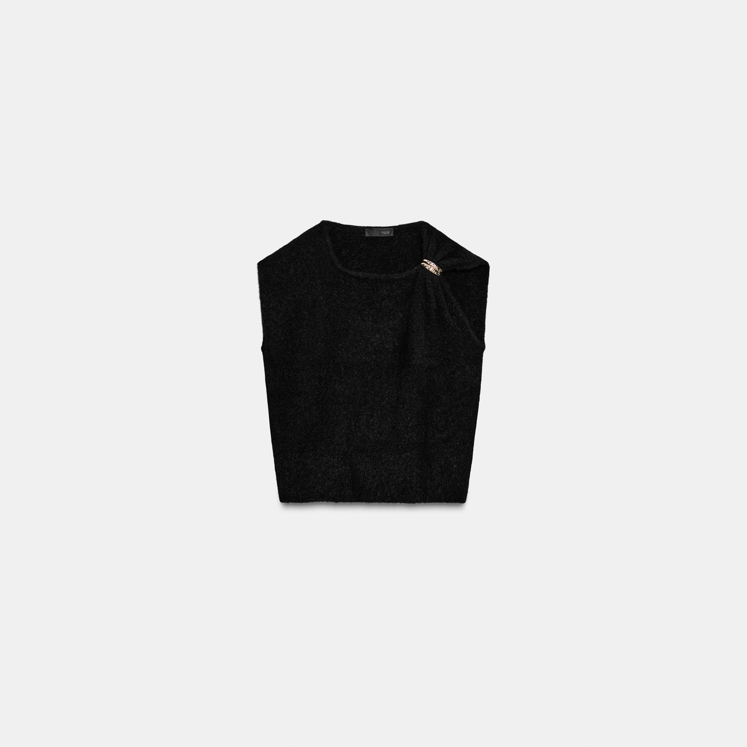 سويتر محبوك بدون أكمام مع بروش – لون طبيعي (أسود) – Black (Sleeveless Knit Jumper with Brooch) سويتر أنيق بلون أسود طبيعي، مصنوع من خامة محبوكة عملية تمنح راحة وملمس عملي، مع تصميم بدون أكمام مزين ببروش ذهبي أنيق عند الياقة. يتميز بياقة draped ملتفة، وحواف مضلعة أنيقة. قطعة مثالية للتنسيقات اليومية الكاجوال الأنيقة أو كطبقة إضافية في المواسم الانتقالية.