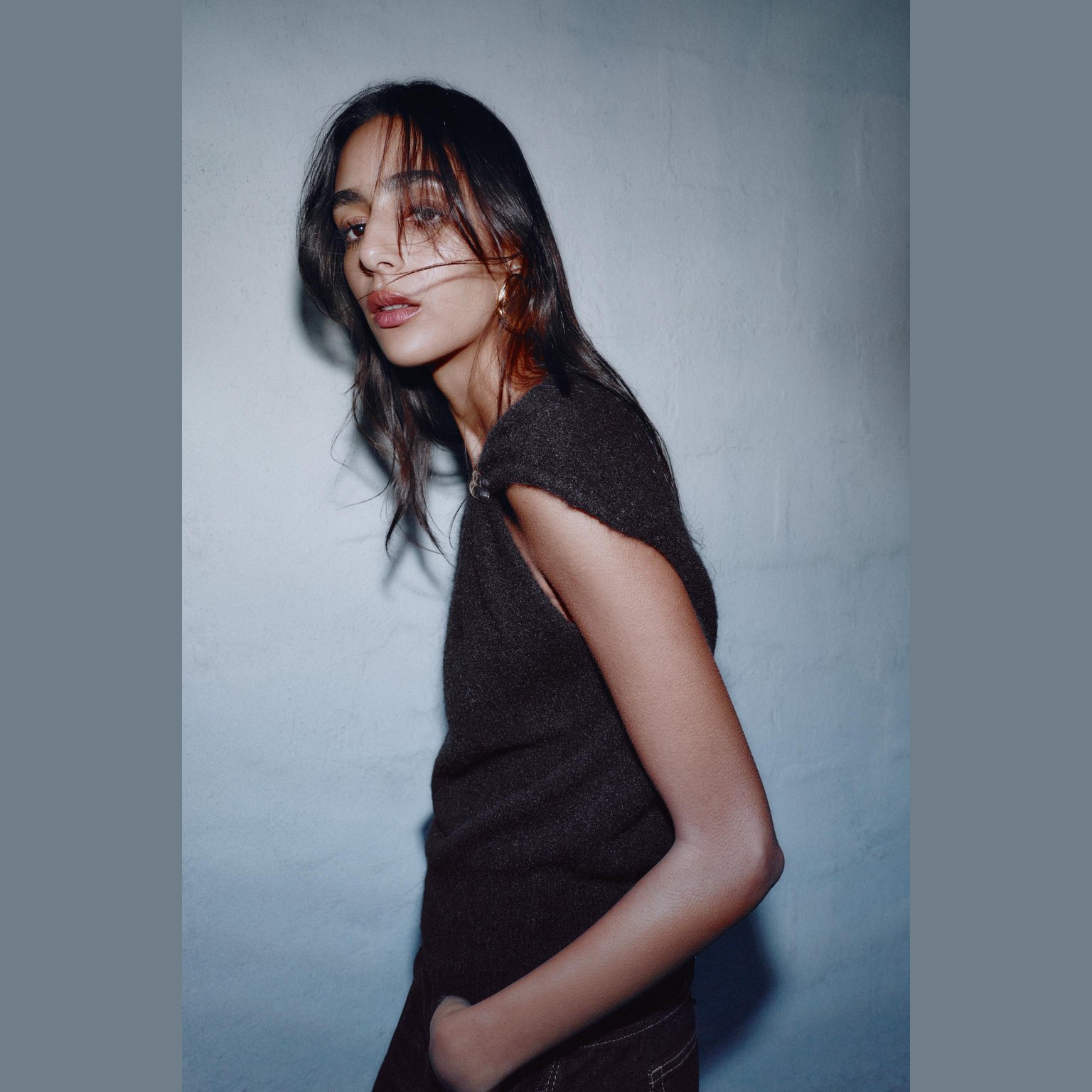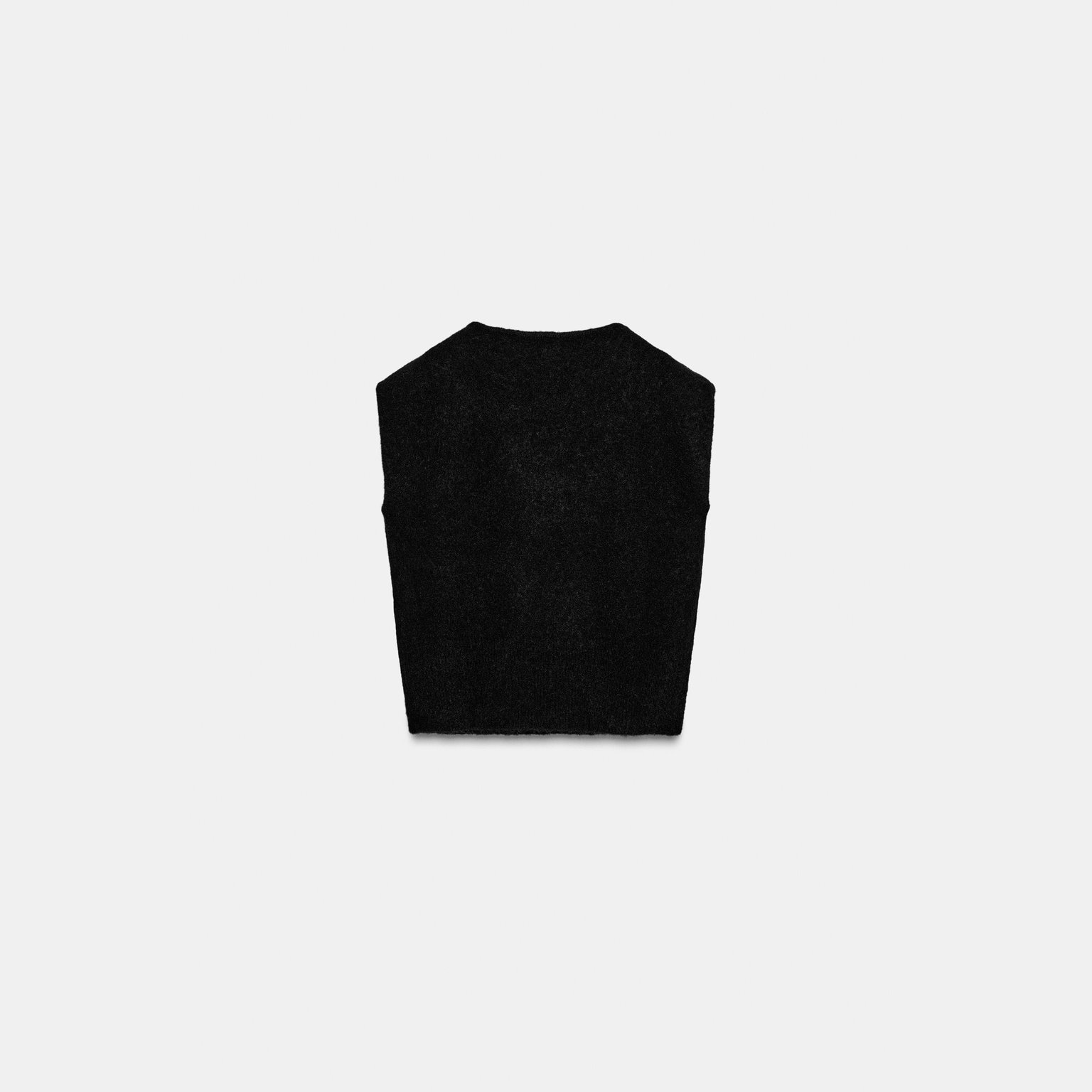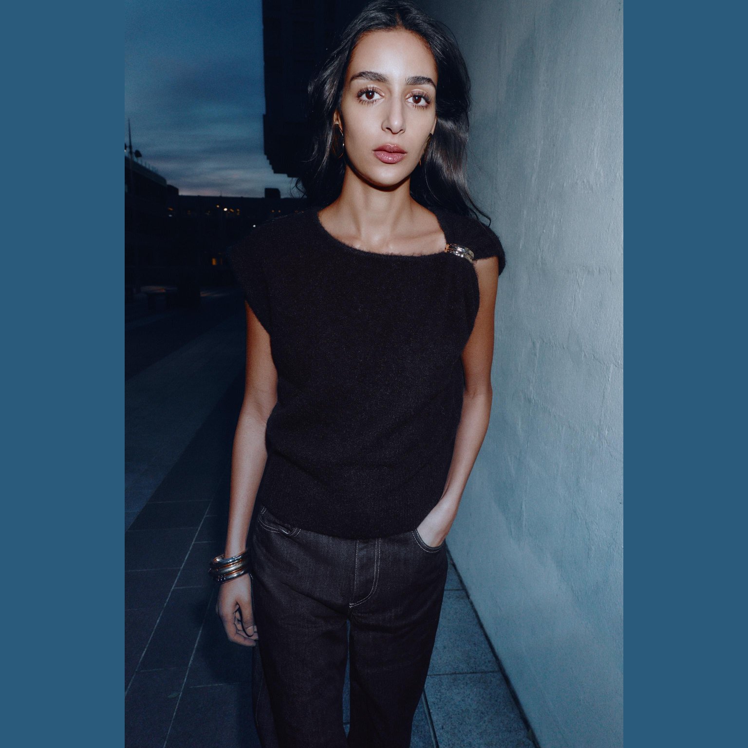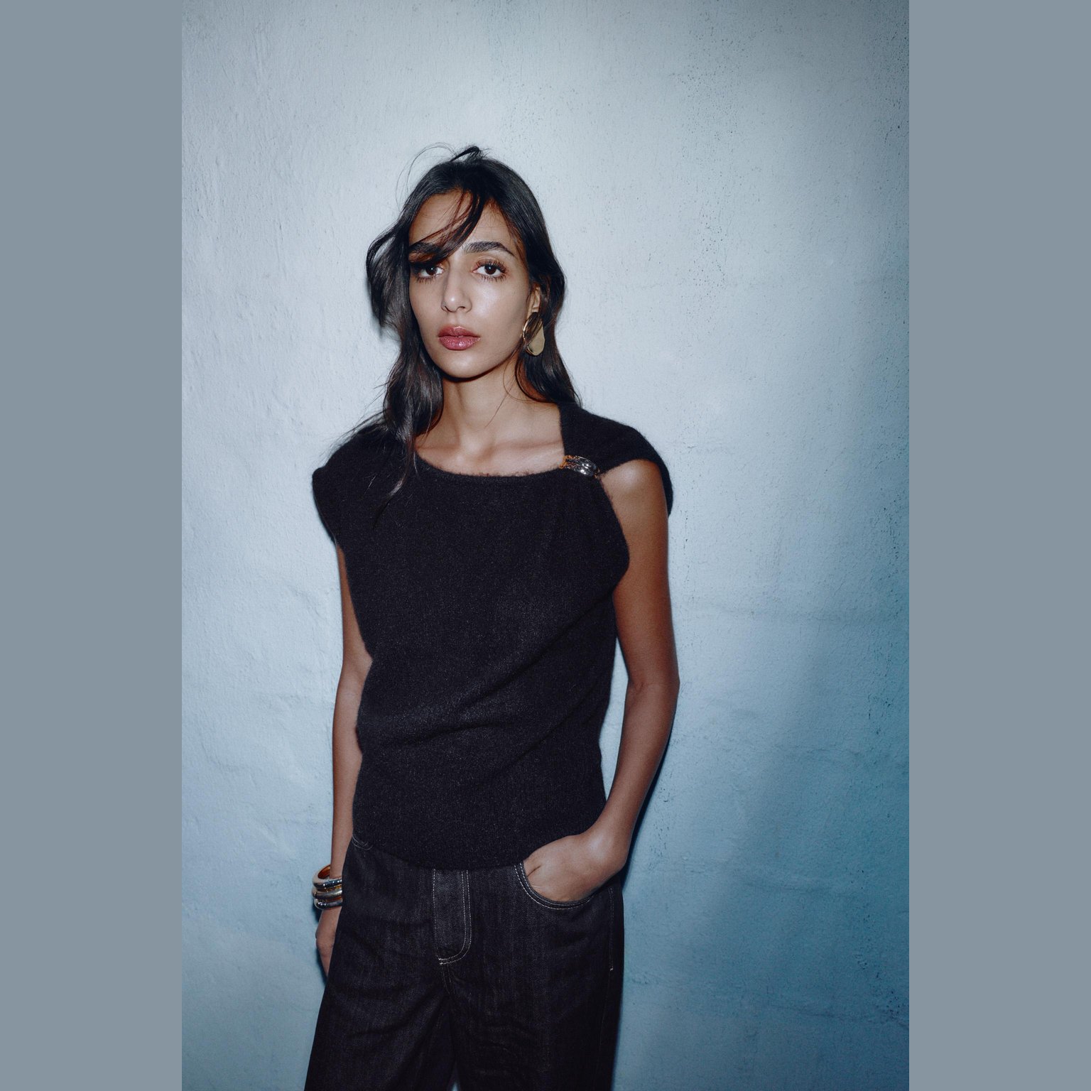 سويتر محبوك بدون أكمام مع بروش – لون طبيعي (أسود) – Black (Sleeveless Knit Jumper with Brooch) سويتر أنيق بلون أسود طبيعي، مصنوع من خامة محبوكة عملية تمنح راحة وملمس عملي، مع تصميم بدون أكمام مزين ببروش ذهبي أنيق عند الياقة. يتميز بياقة draped ملتفة، وحواف مضلعة أنيقة. قطعة مثالية للتنسيقات اليومية الكاجوال الأنيقة أو كطبقة إضافية في المواسم الانتقالية.