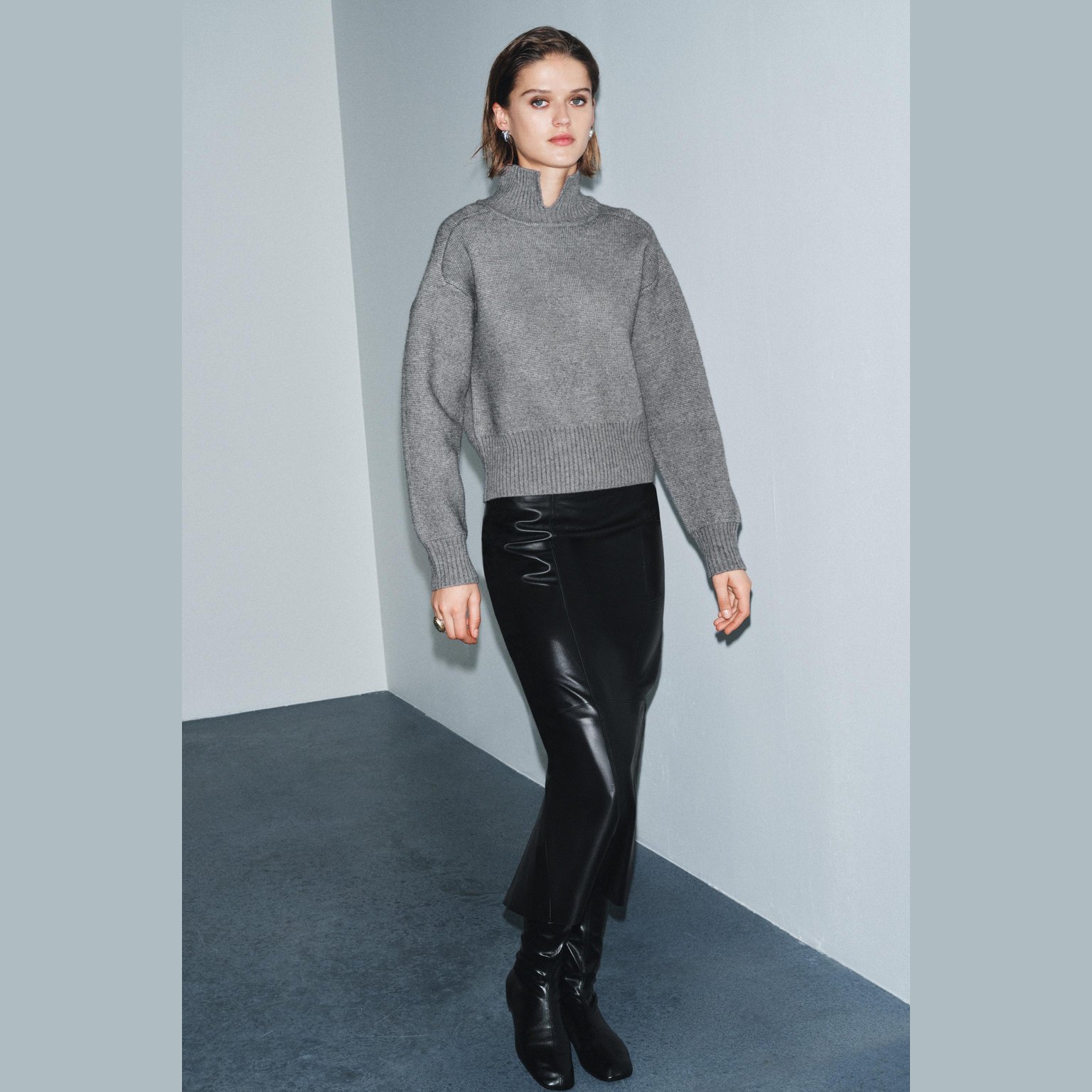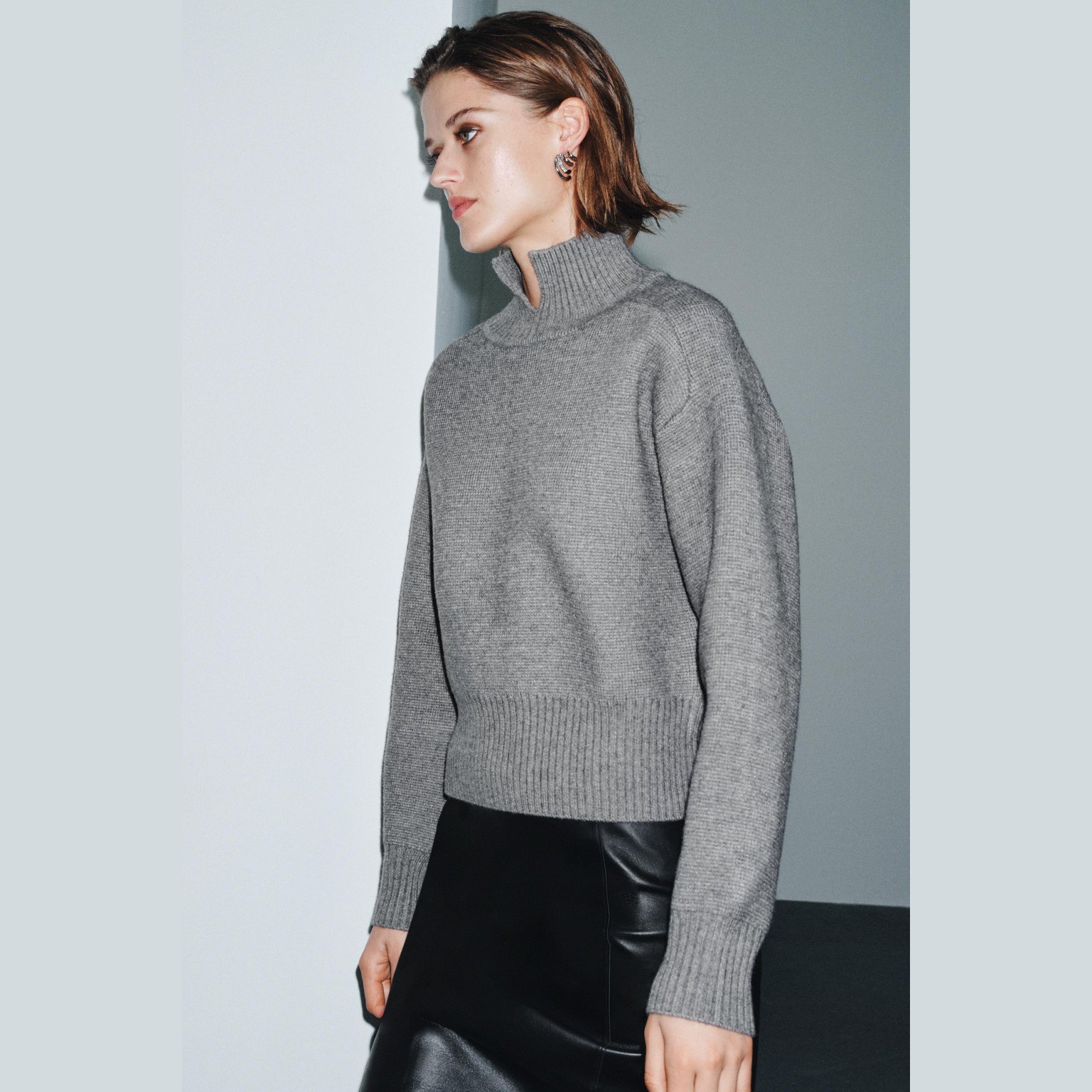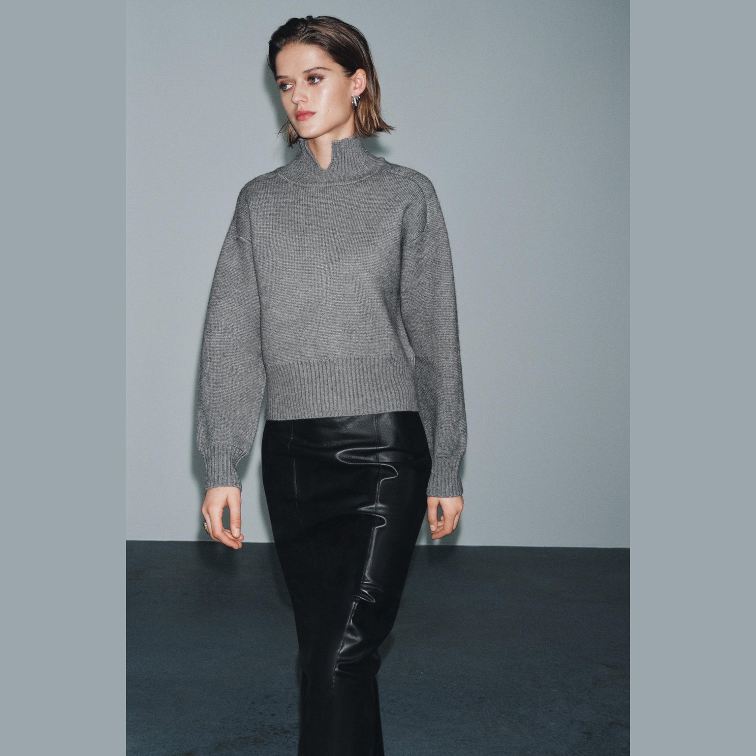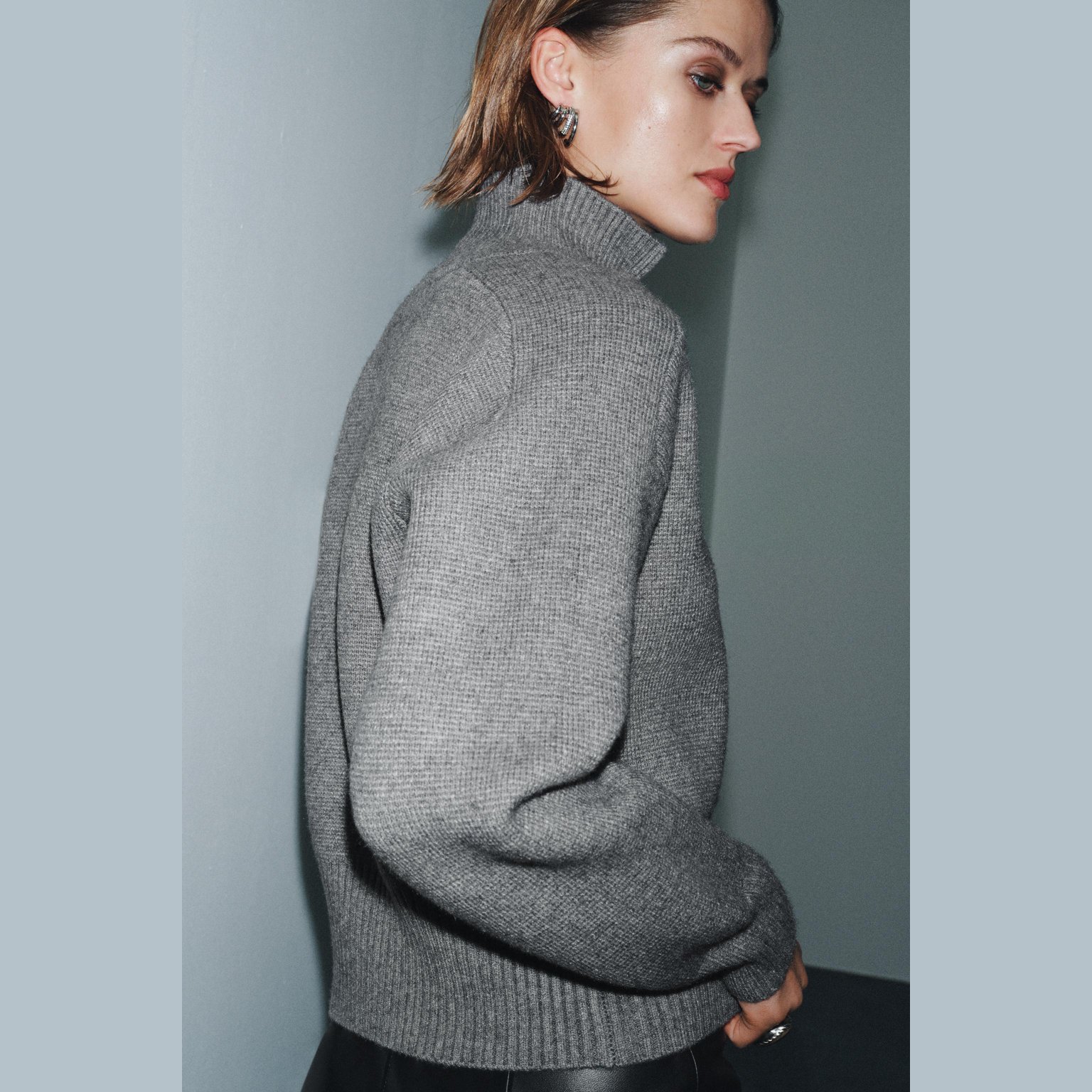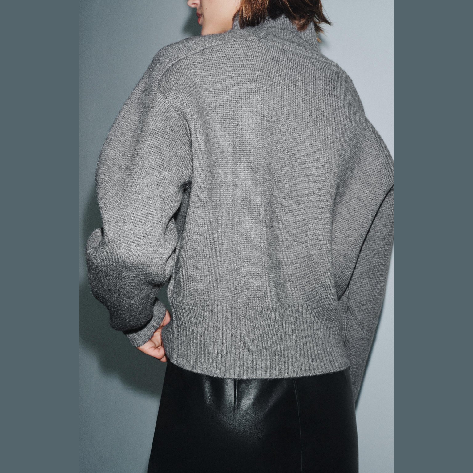 - التصميم: سويتر محبوك بياقة عالية مع فتحة أمامية (Knit Jumper with Neck Opening)