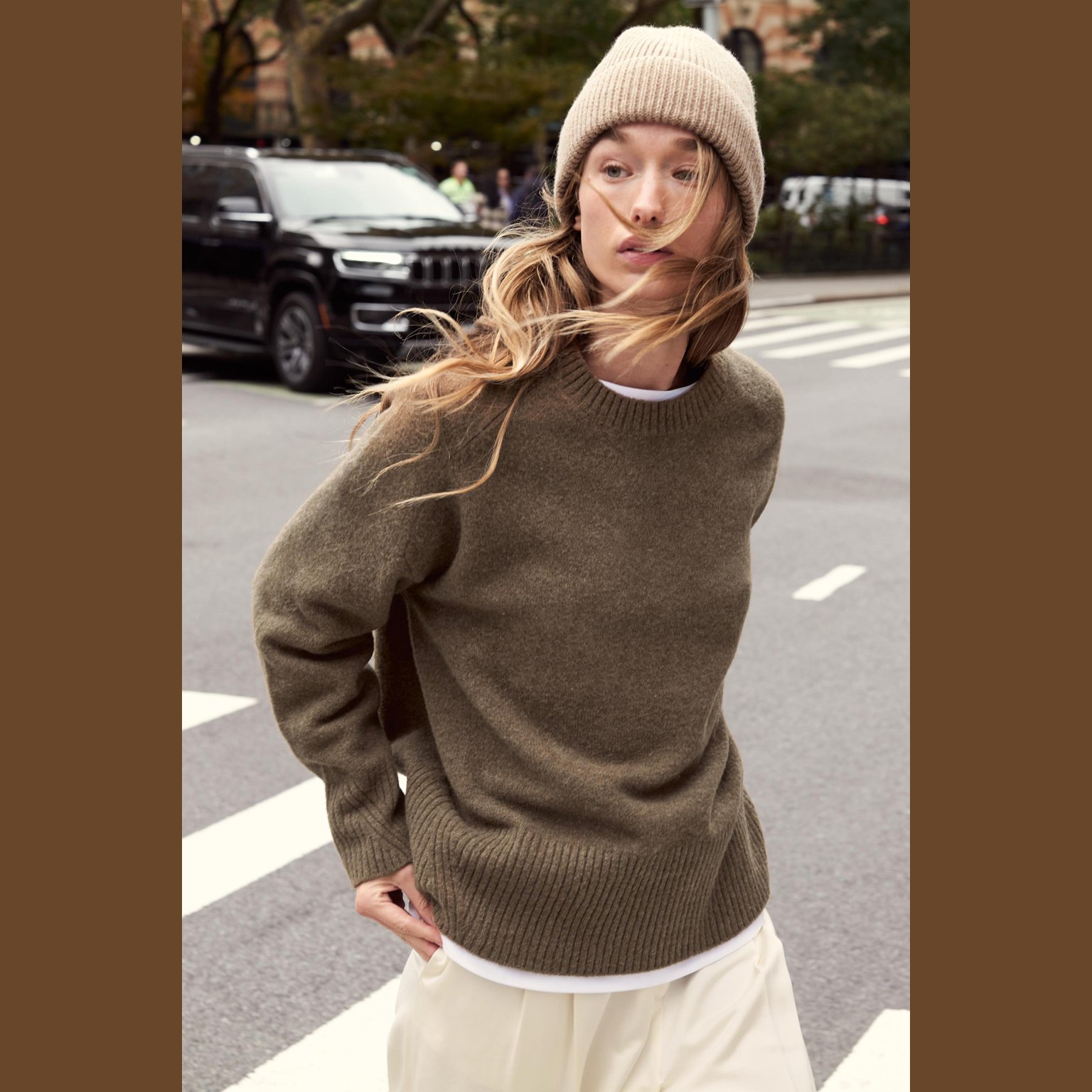 سويتر محبوك بخامة ناعمة – لون طبيعي (بني منك) – Mink Brown (Soft-Touch Knit Jumper) سويتر أنيق بلون بني منك طبيعي، مصنوع من خامة محبوكة ناعمة تمنح راحة ودفئًا، مع تصميم كلاسيكي بياقة مستديرة وأكمام طويلة وحواف مضلعة أنيقة. قطعة مثالية للتنسيقات اليومية الكاجوال الأنيقة أو كطبقة أساسية في المواسم الانتقالية.