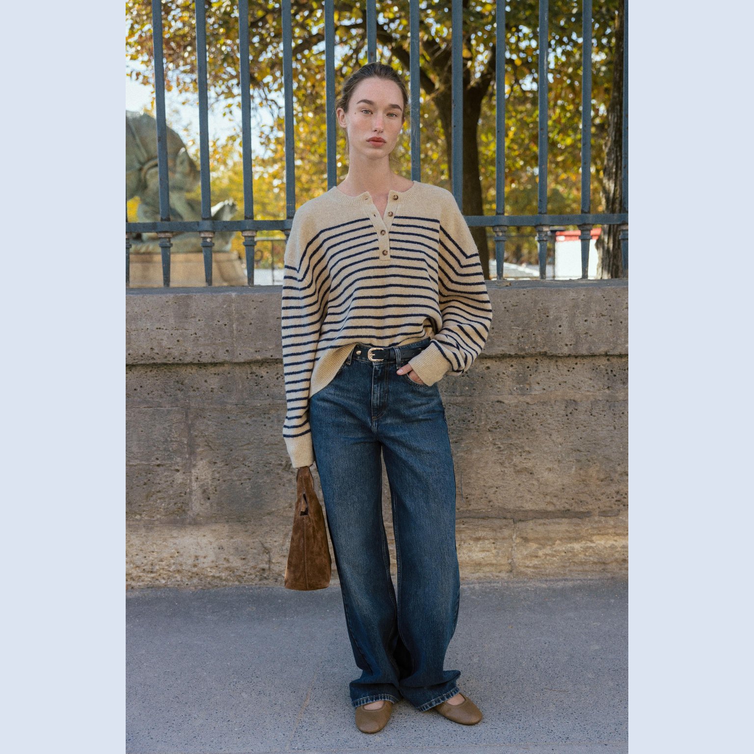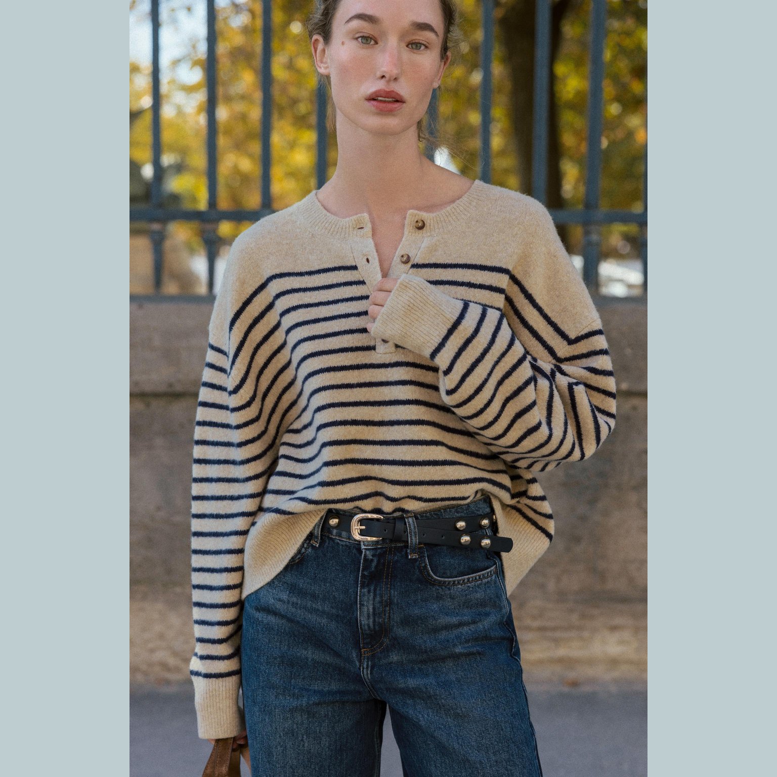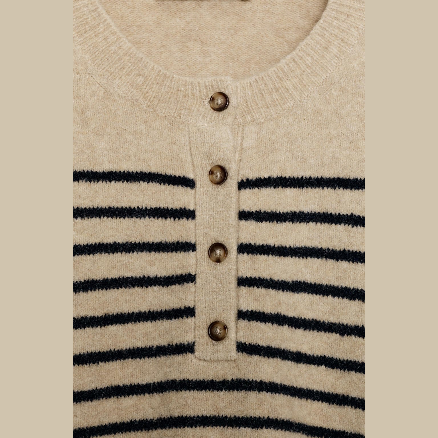 سويتر محبوك مخطط – لون طبيعي (بيج–كحلي) – Beige/Navy (Striped Knit Jumper) سويتر أنيق بلون بيج–كحلي طبيعي، مصنوع من خامة محبوكة ناعمة تمنح راحة ودفئًا، مع تصميم كلاسيكي مخطط يضفي لمسة عصرية مميزة. يتميز بياقة مستديرة، أكمام طويلة، وأزرار أمامية تضيف لمسة عملية أنيقة. قطعة مثالية للتنسيقات اليومية الكاجوال الأنيقة أو كطبقة أساسية في المواسم الانتقالية.