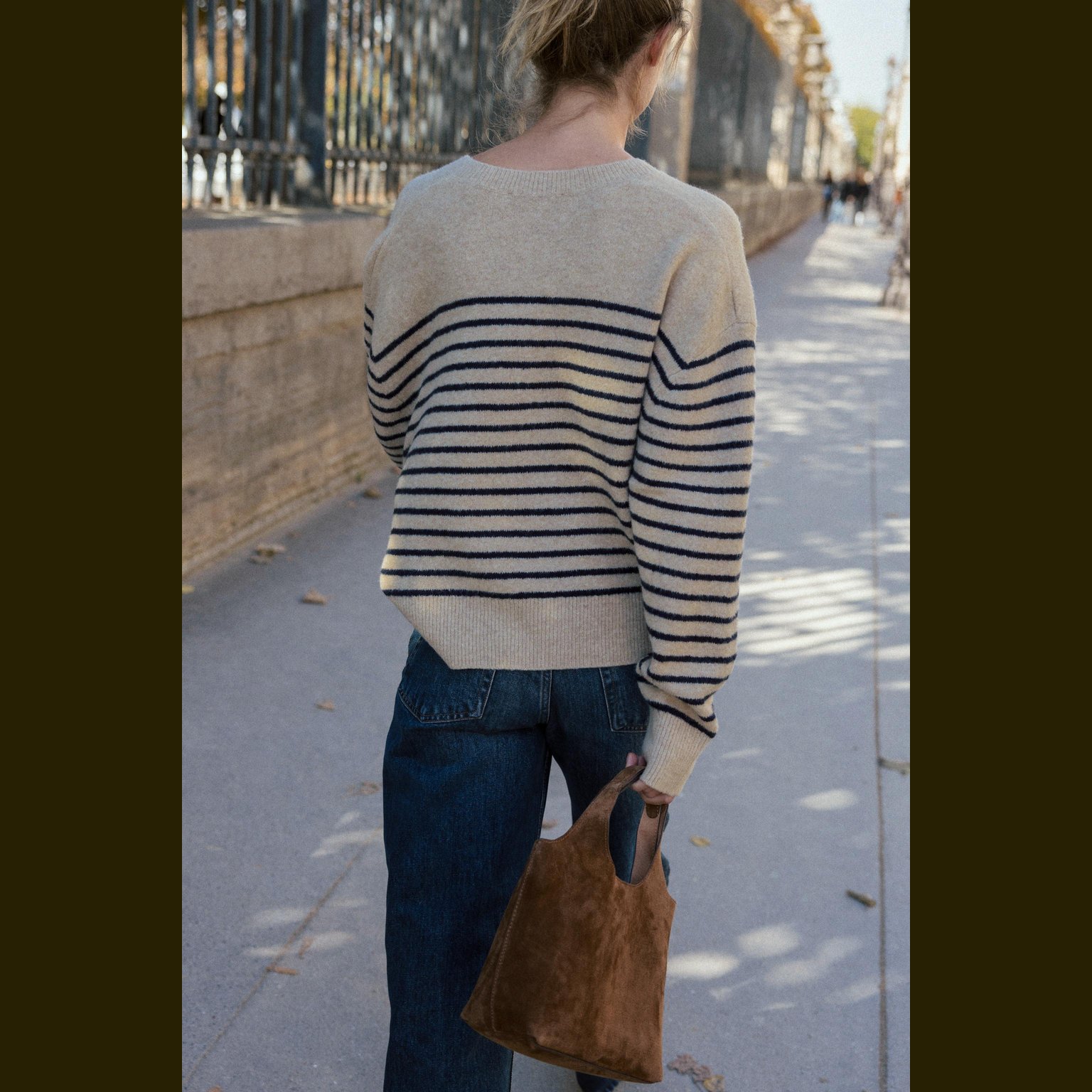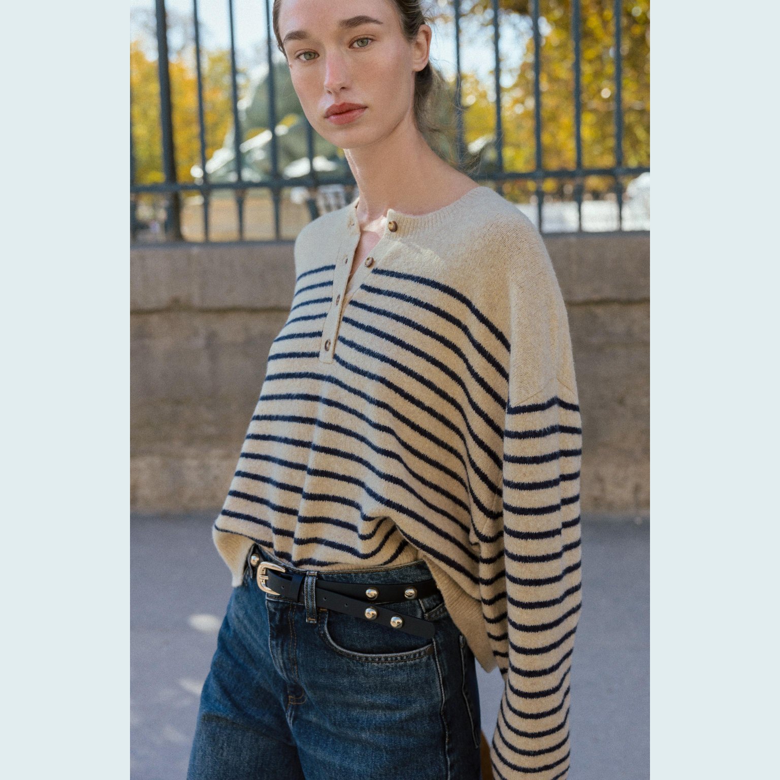 - التصميم: سويتر محبوك مخطط (Striped Knit Jumper)