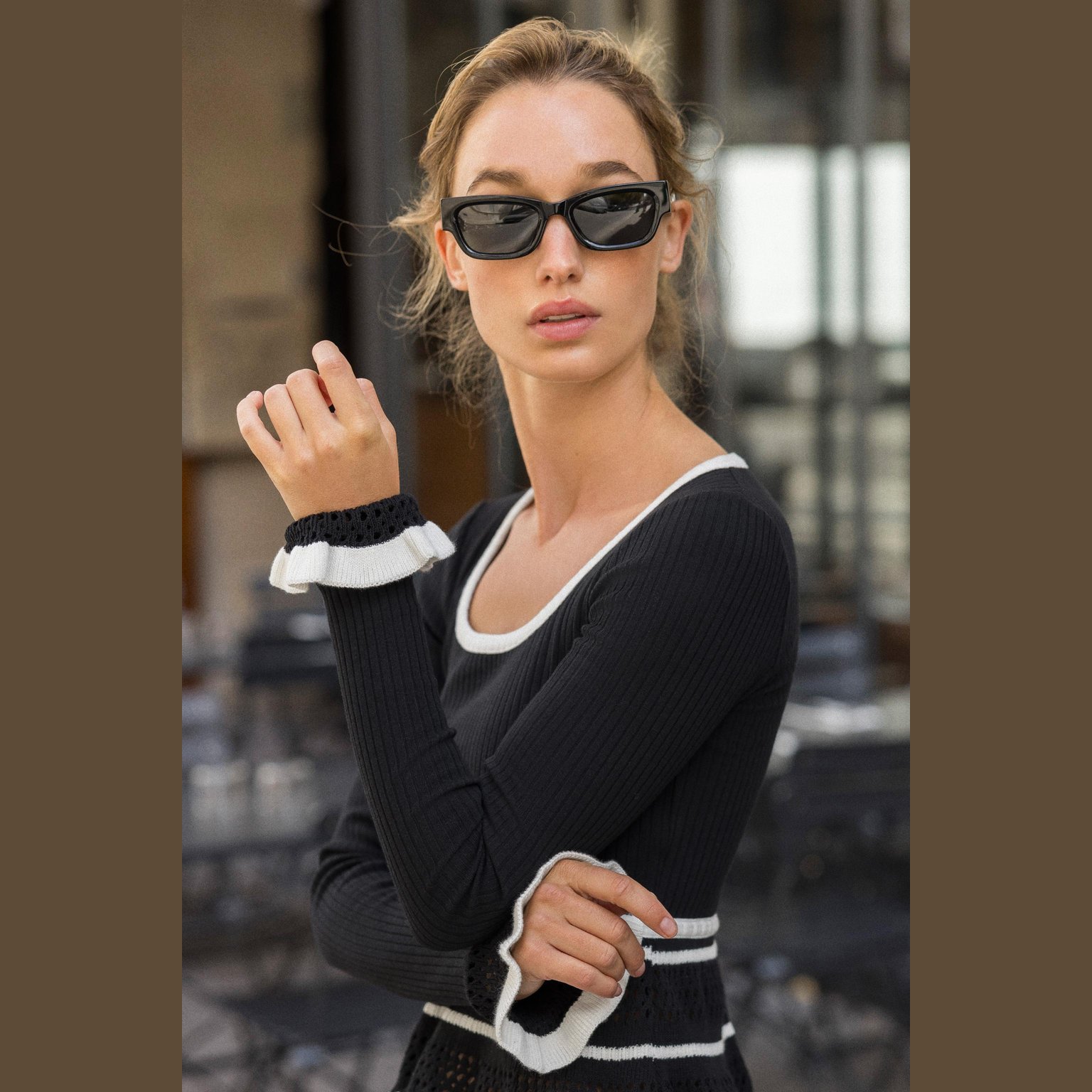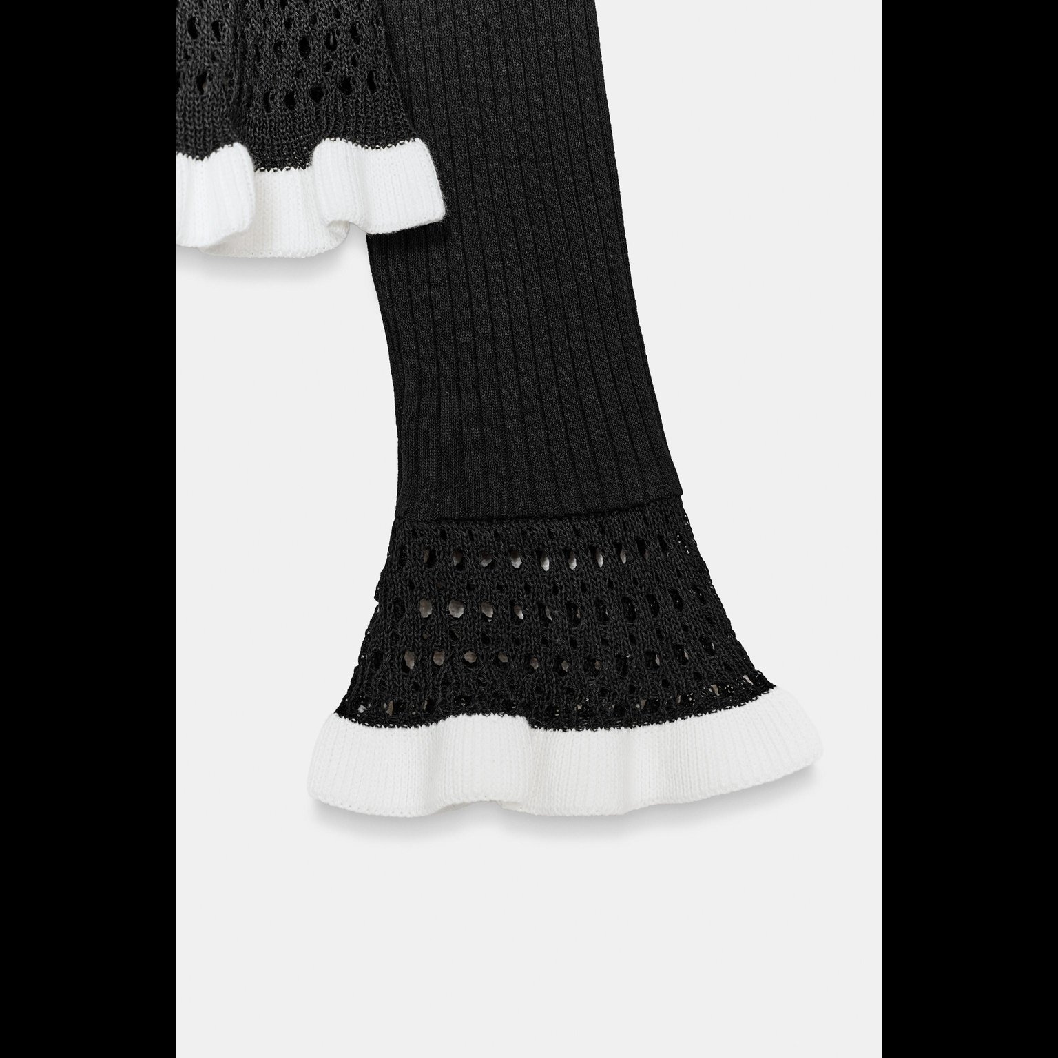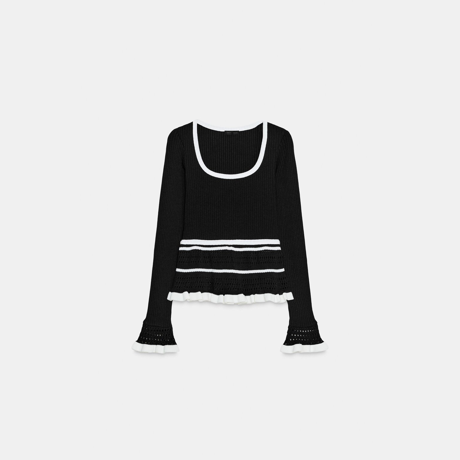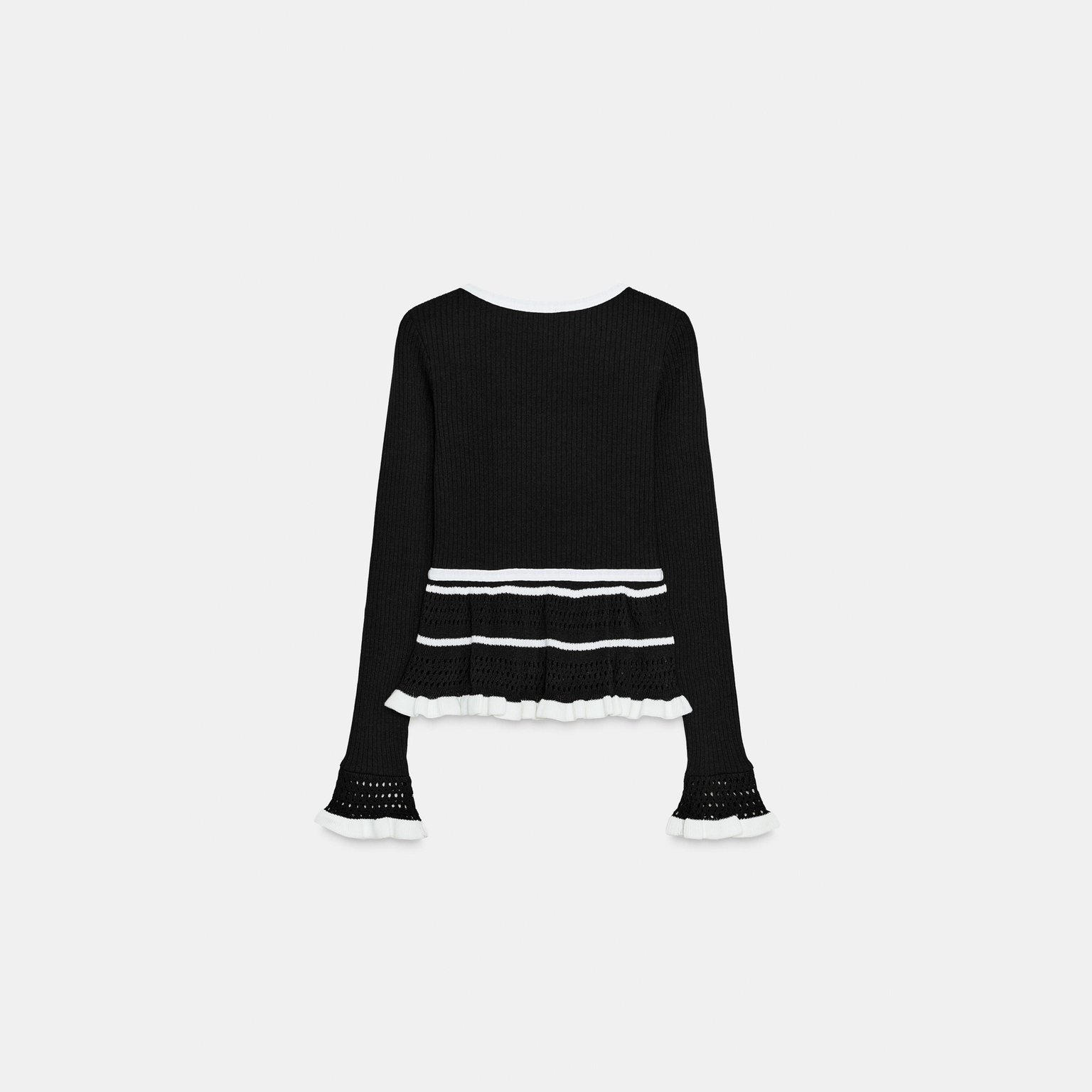 سويتر محبوك مضلع بتصميم مدمج – لون طبيعي (أسود–أبيض) – Black/White (Combined Ribbed Jumper) سويتر أنيق بلون أسود–أبيض طبيعي، مصنوع من خامة محبوكة عملية تمنح راحة ودفئًا، مع تصميم كلاسيكي مزود بحواف مضلعة متباينة تضيف لمسة عصرية مميزة. يتميز بياقة مستديرة، أكمام طويلة، وحاشية مزينة بكشكش أنيق. قطعة مثالية للتنسيقات اليومية الكاجوال الأنيقة أو كطبقة أساسية في المواسم الانتقالية.