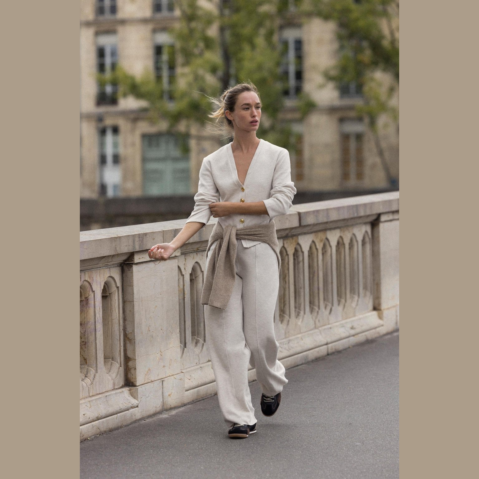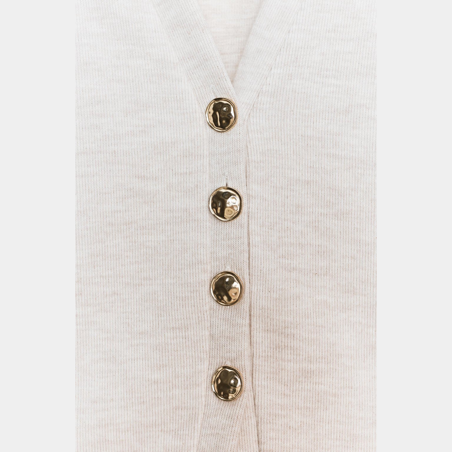 كارديغان محبوك بأزرار معدنية – لون طبيعي (بيج مموج) – Beige Marl (Soft Button Cardigan) كارديغان أنيق بلون بيج مموج طبيعي، مصنوع من خامة محبوكة عملية تمنح راحة وملمسًا ناعمًا، مع تصميم كلاسيكي مزود بياقة V وأكمام طويلة. يتميز بأزرار أمامية معدنية تضيف لمسة عصرية أنيقة. قطعة مثالية للتنسيقات اليومية الكاجوال الأنيقة أو كطبقة إضافية في المواسم الانتقالية.