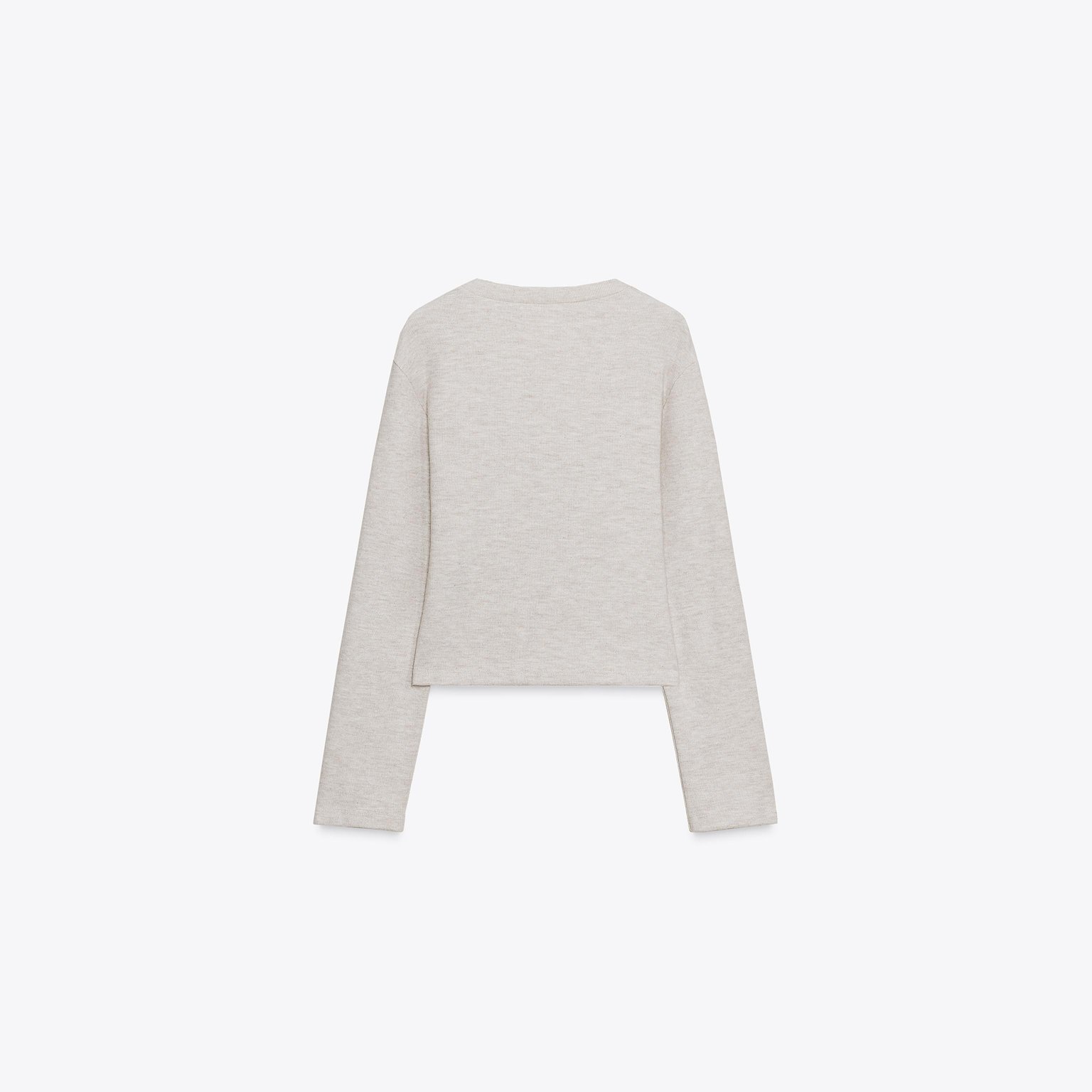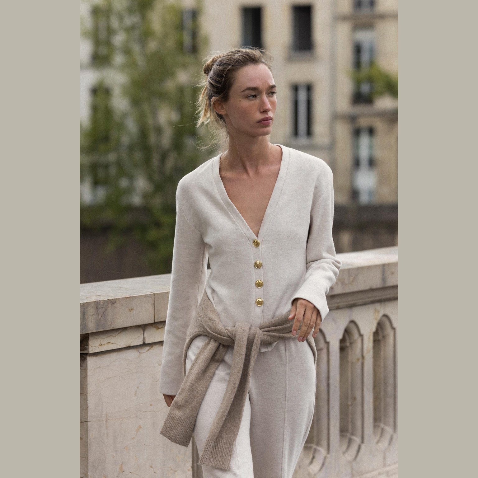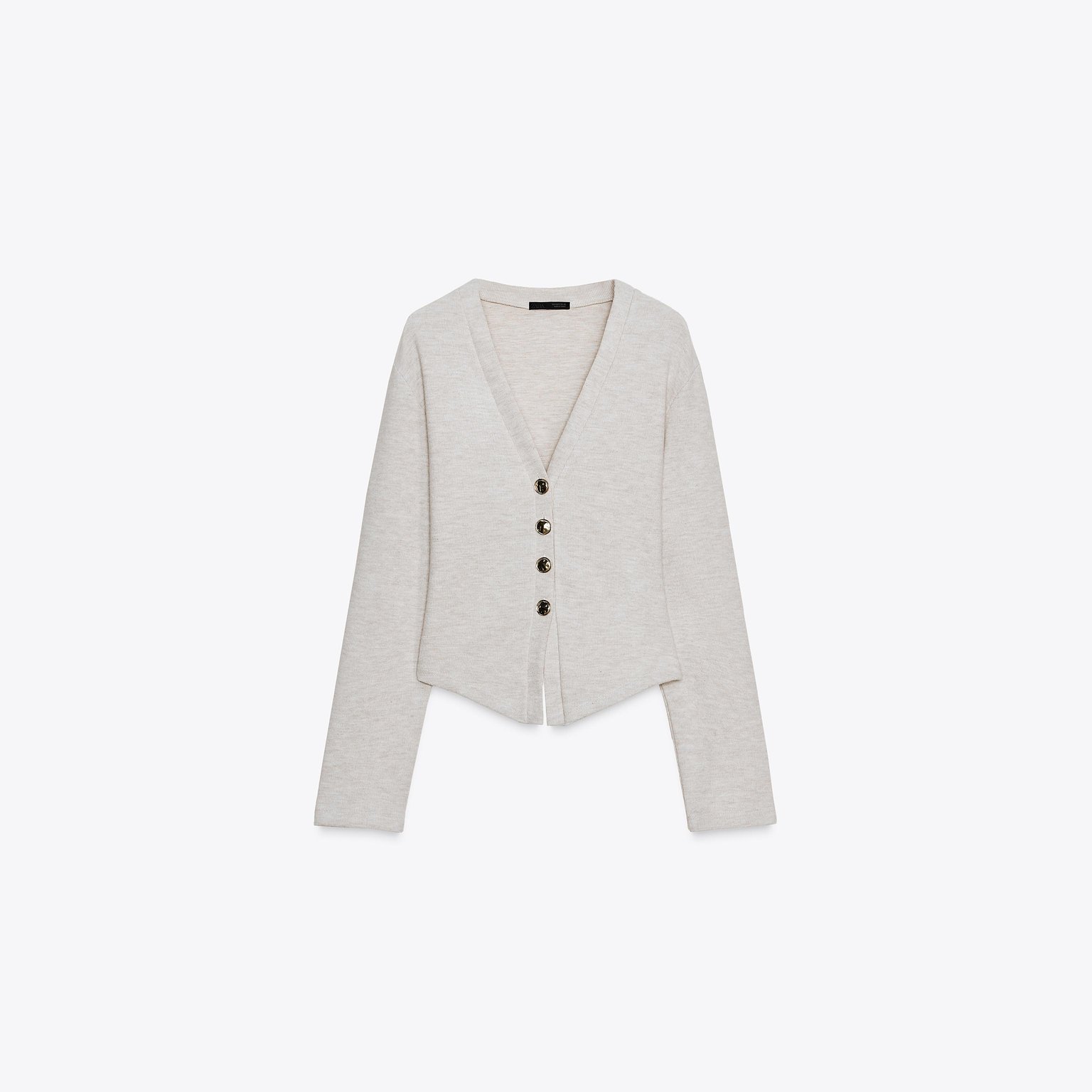 - التصميم: كارديغان محبوك بأزرار معدنية (Soft Button Cardigan)