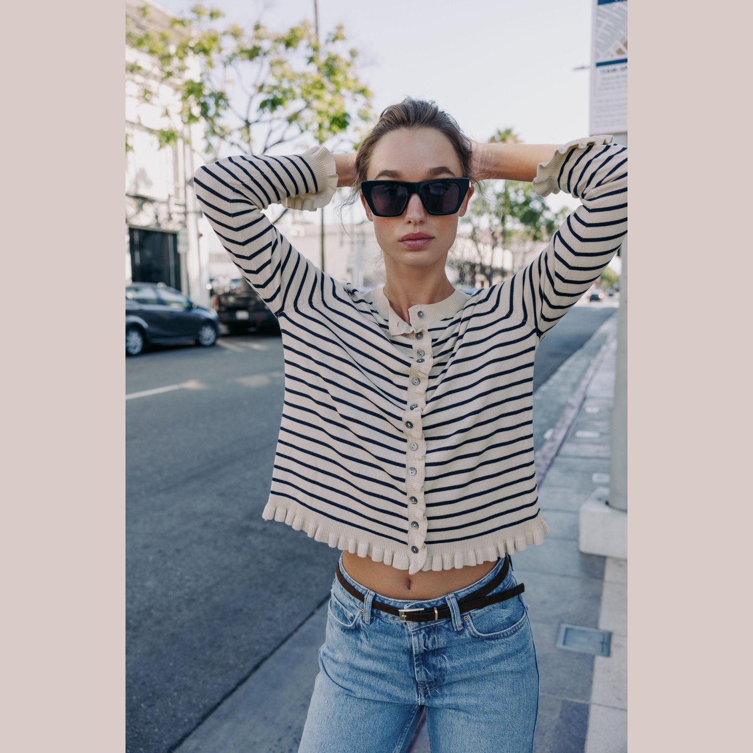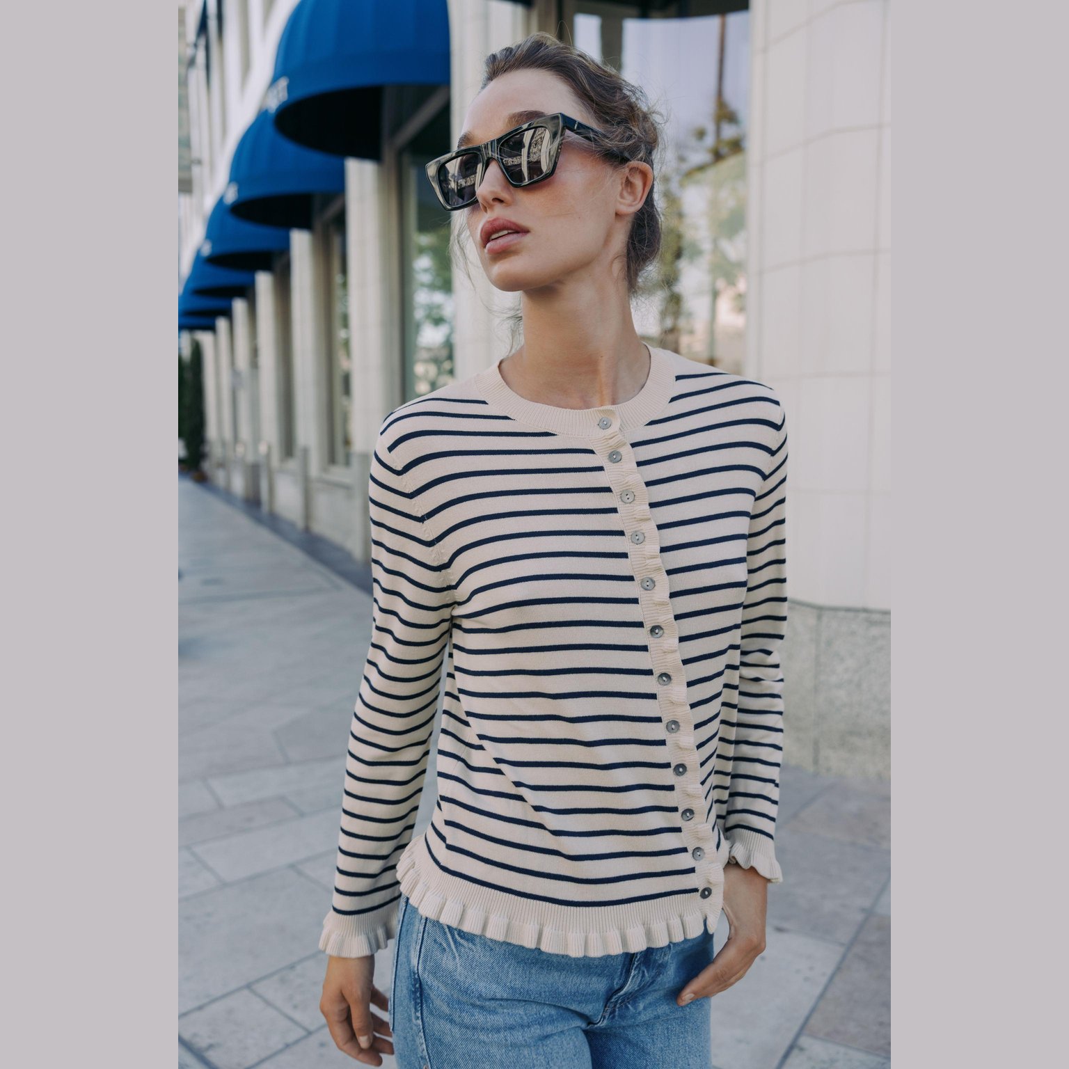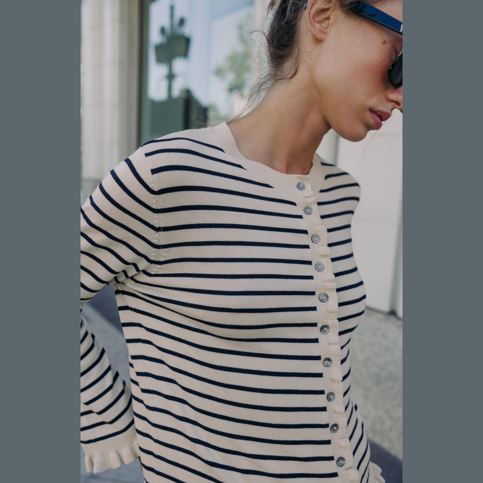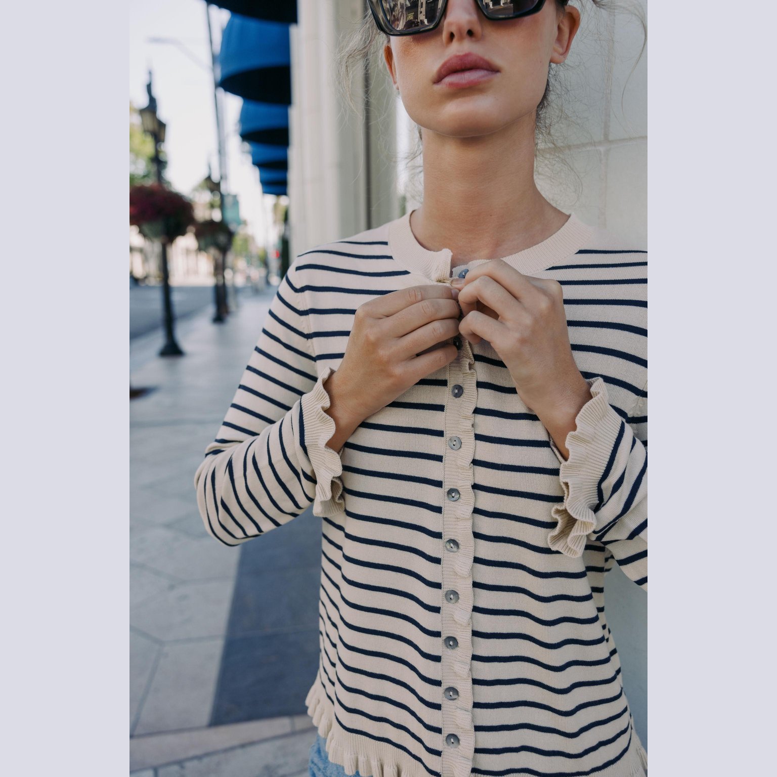 كارديغان محبوك مزين بكشكش – لون طبيعي (كحلي مخطط) – Navy Blue Striped (Ruffle Trim Cardigan) كارديغان أنيق بلون كحلي مخطط طبيعي، مصنوع من خامة محبوكة عملية تمنح راحة وملمسًا ناعمًا، مع تصميم كلاسيكي مزود بكشكش أنثوي أنيق على الحواف. يتميز بياقة مستديرة، أكمام طويلة، وأزرار أمامية للإغلاق. قطعة مثالية للتنسيقات اليومية الكاجوال الأنيقة أو كطبقة إضافية في المواسم الانتقالية.