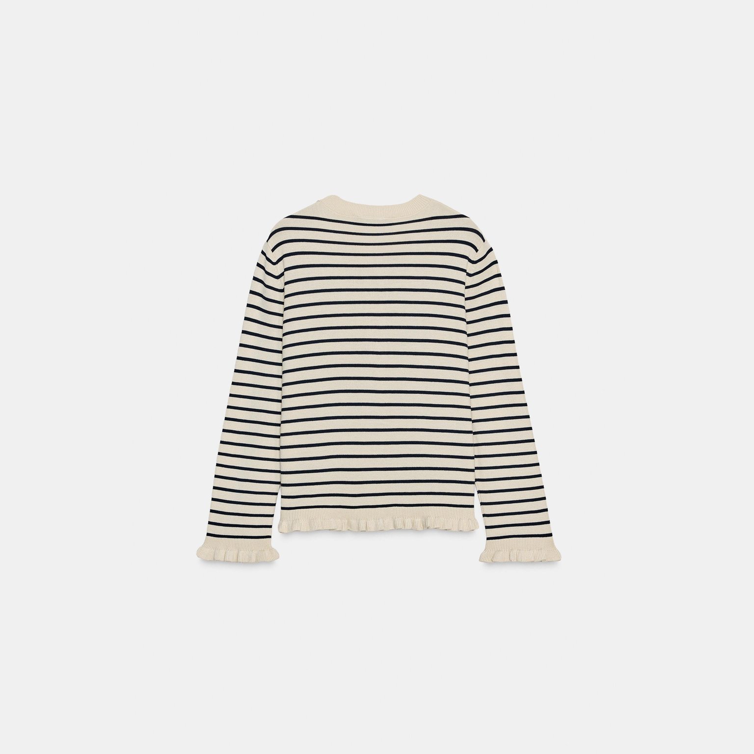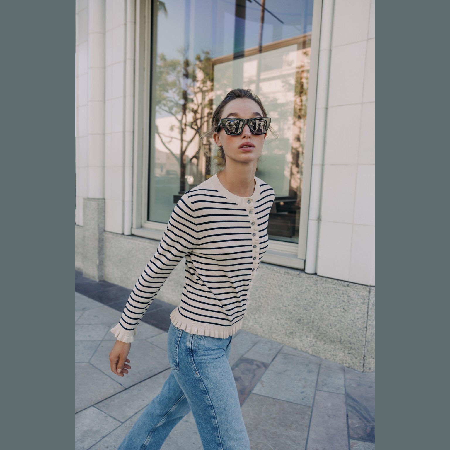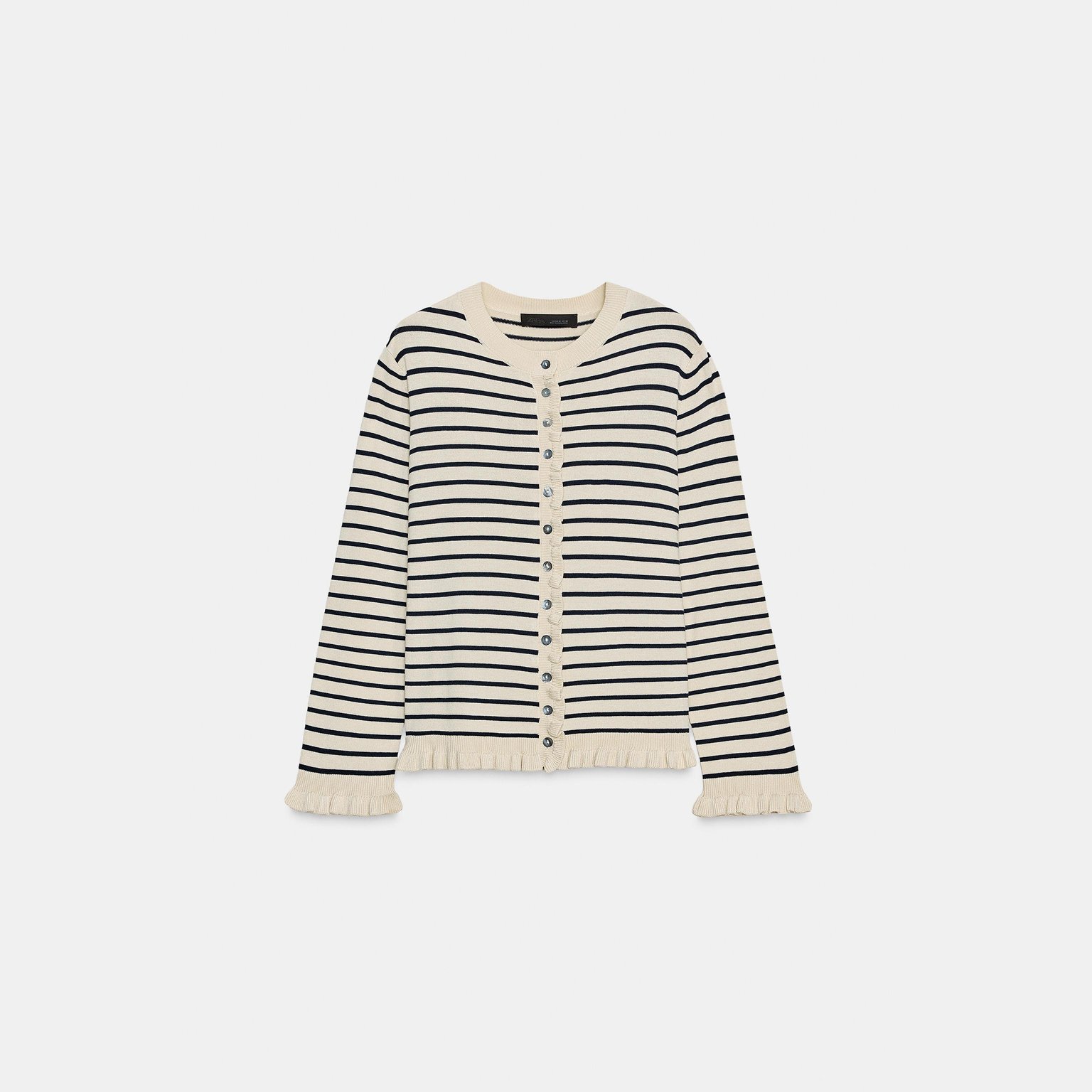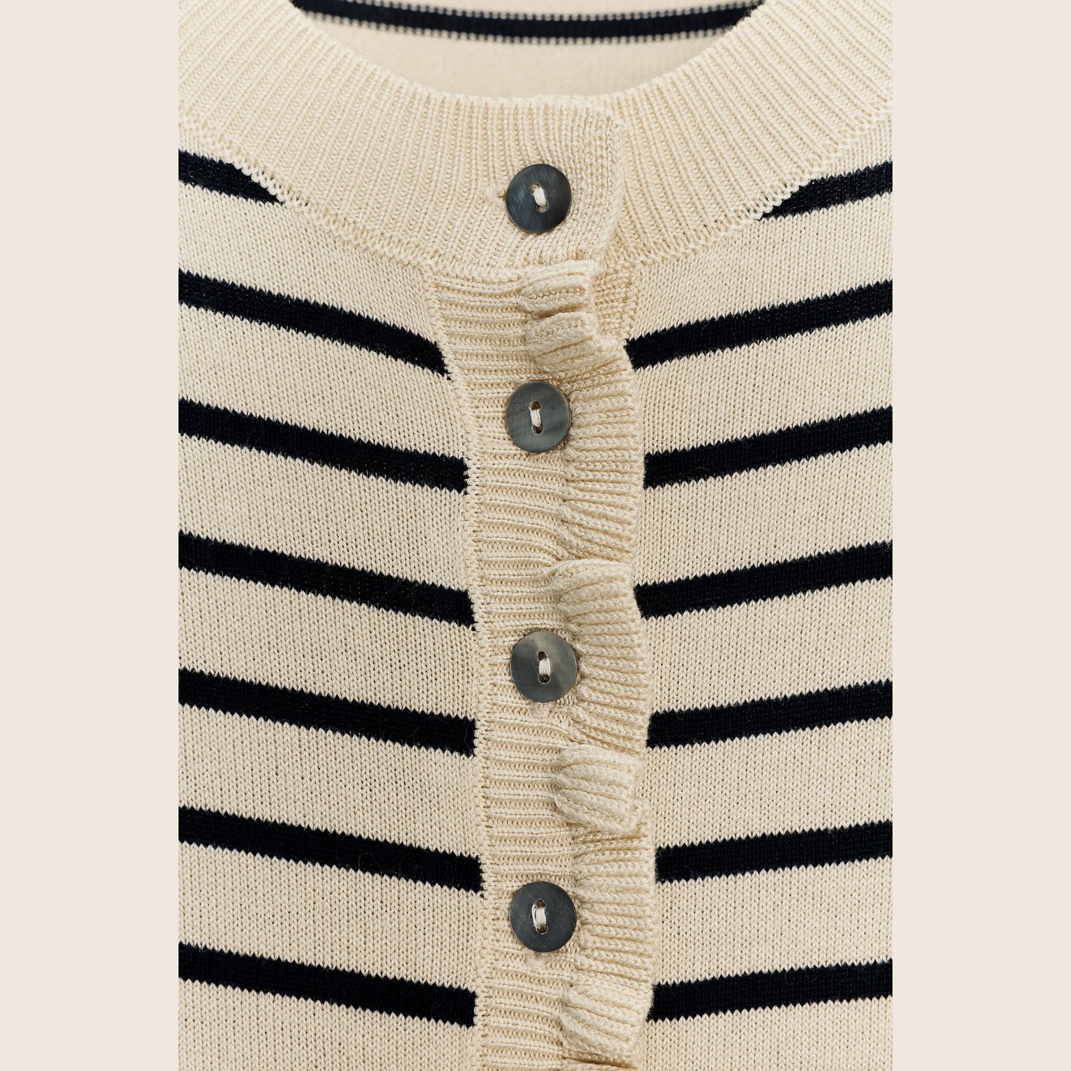كارديغان محبوك مزين بكشكش – لون طبيعي (كحلي مخطط) – Navy Blue Striped (Ruffle Trim Cardigan) كارديغان أنيق بلون كحلي مخطط طبيعي، مصنوع من خامة محبوكة عملية تمنح راحة وملمسًا ناعمًا، مع تصميم كلاسيكي مزود بكشكش أنثوي أنيق على الحواف. يتميز بياقة مستديرة، أكمام طويلة، وأزرار أمامية للإغلاق. قطعة مثالية للتنسيقات اليومية الكاجوال الأنيقة أو كطبقة إضافية في المواسم الانتقالية.