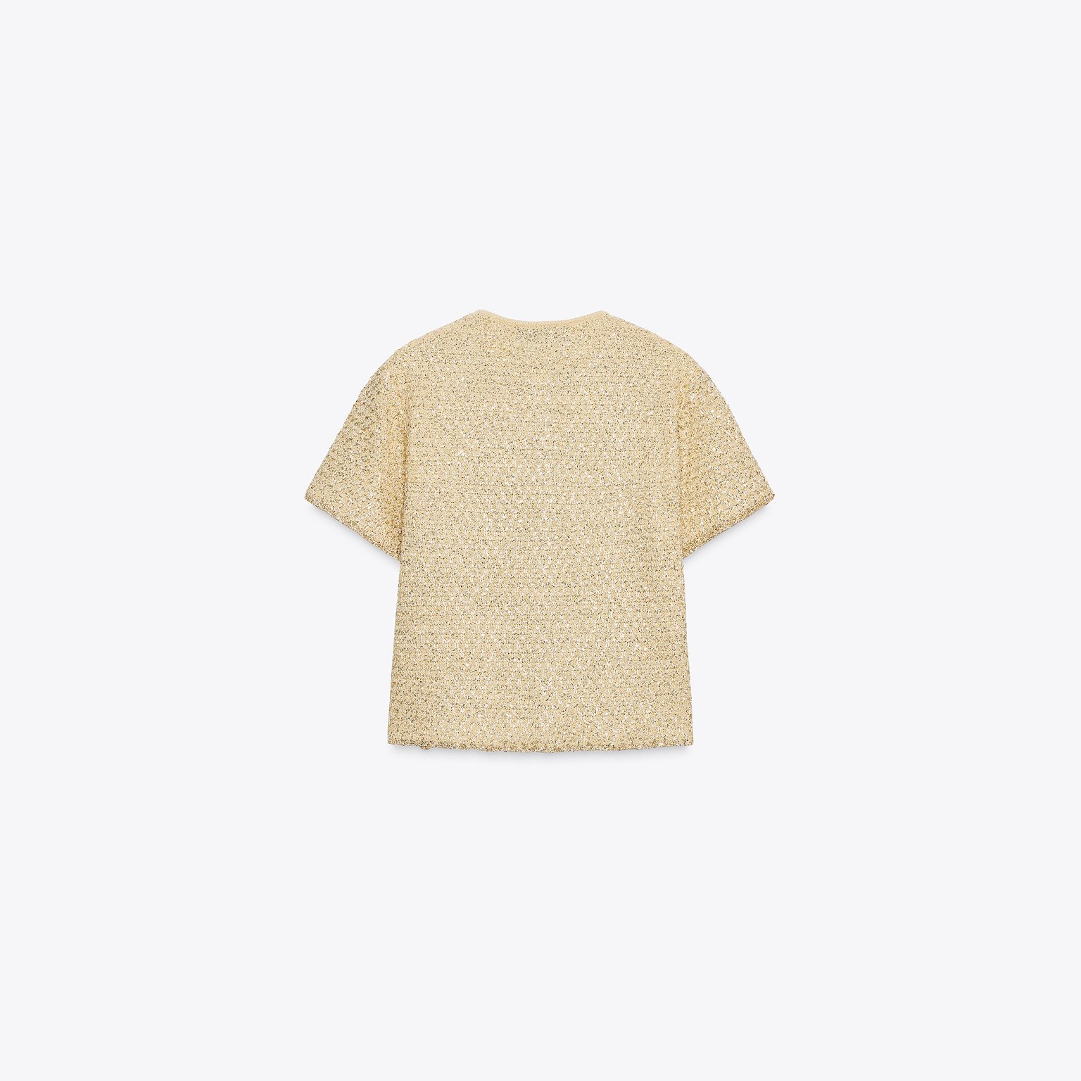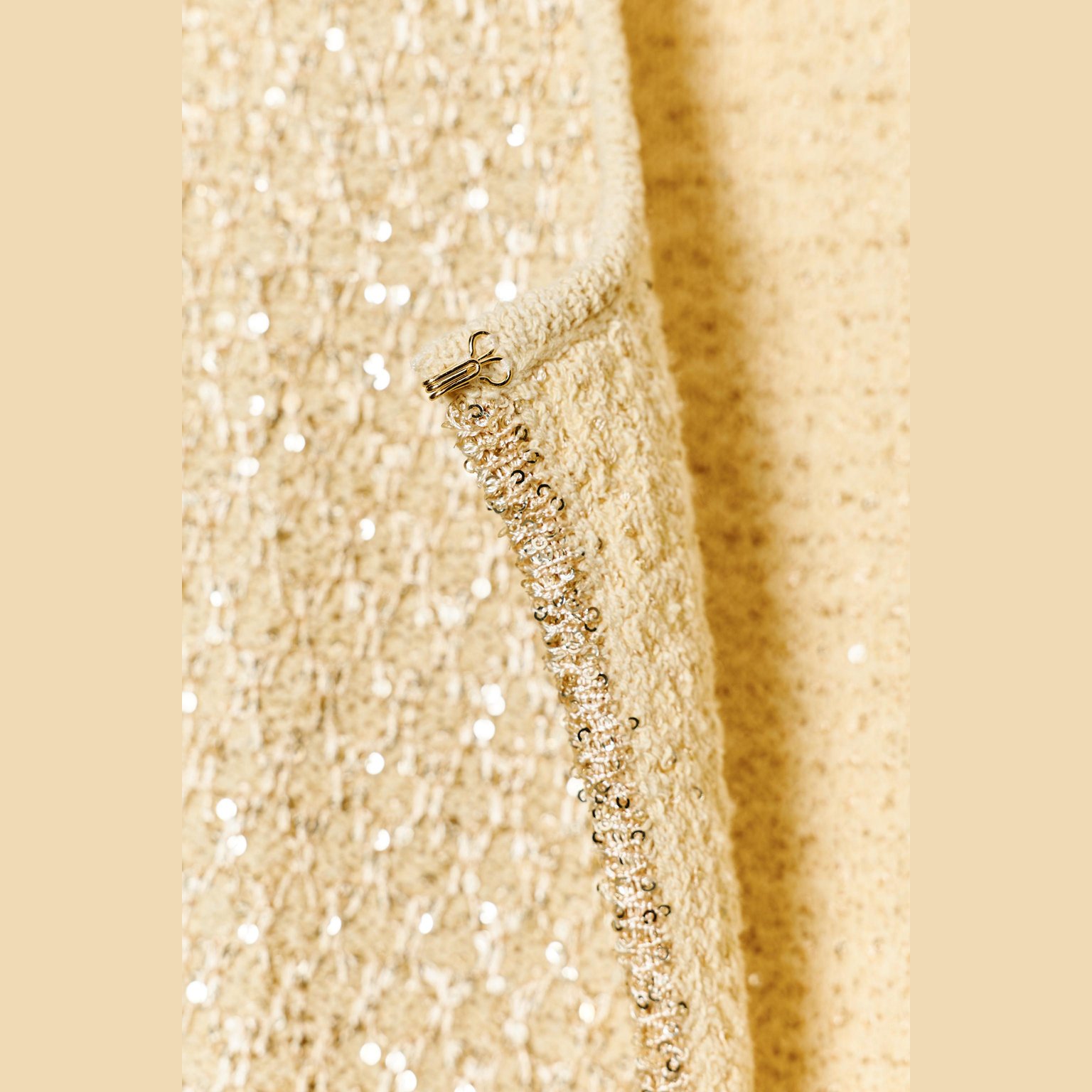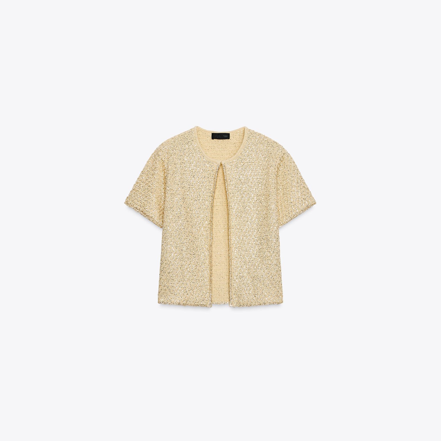 كارديغان محبوك مزين بالترتر – لون طبيعي (أصفر زبدة) – Butter (Sequin Cardigan) كارديغان أنيق بلون أصفر زبدة طبيعي، مصنوع من خامة محبوكة بخيوط معدنية تمنح لمسة براقة، مع تصميم قصير الأكمام مزود بياقة مستديرة. يتميز بتفاصيل ترتر أنيقة وإغلاق أمامي بخطافات مخفية. قطعة مثالية للتنسيقات اليومية الكاجوال الأنيقة أو لإطلالة مسائية مميزة.
