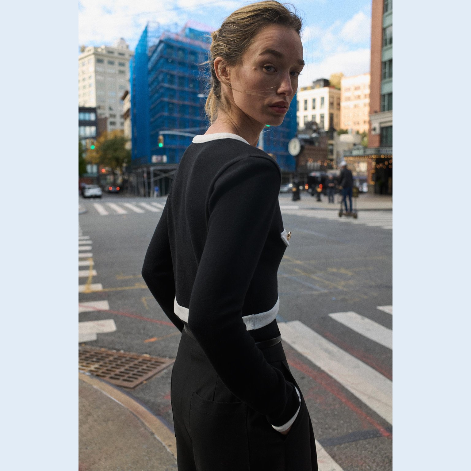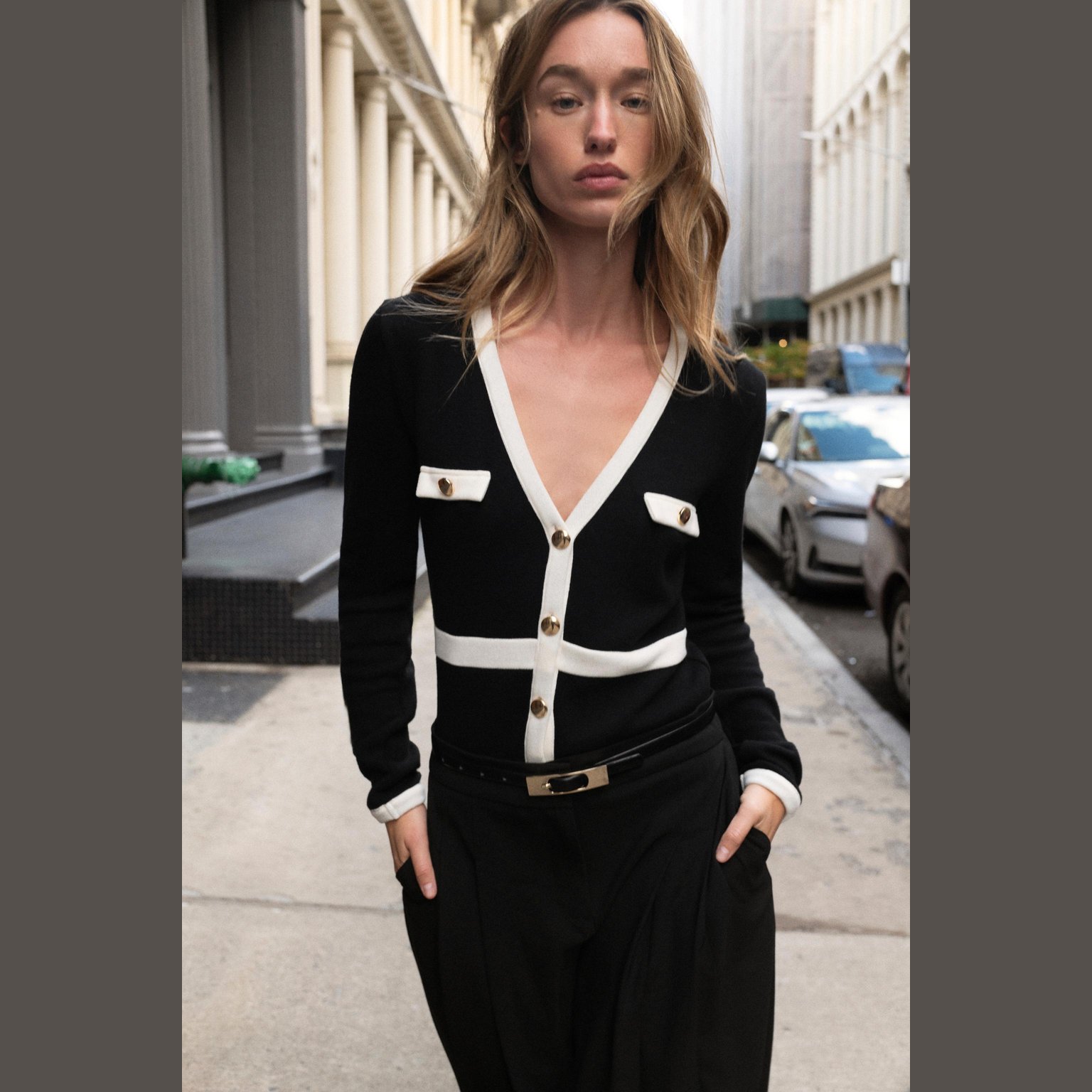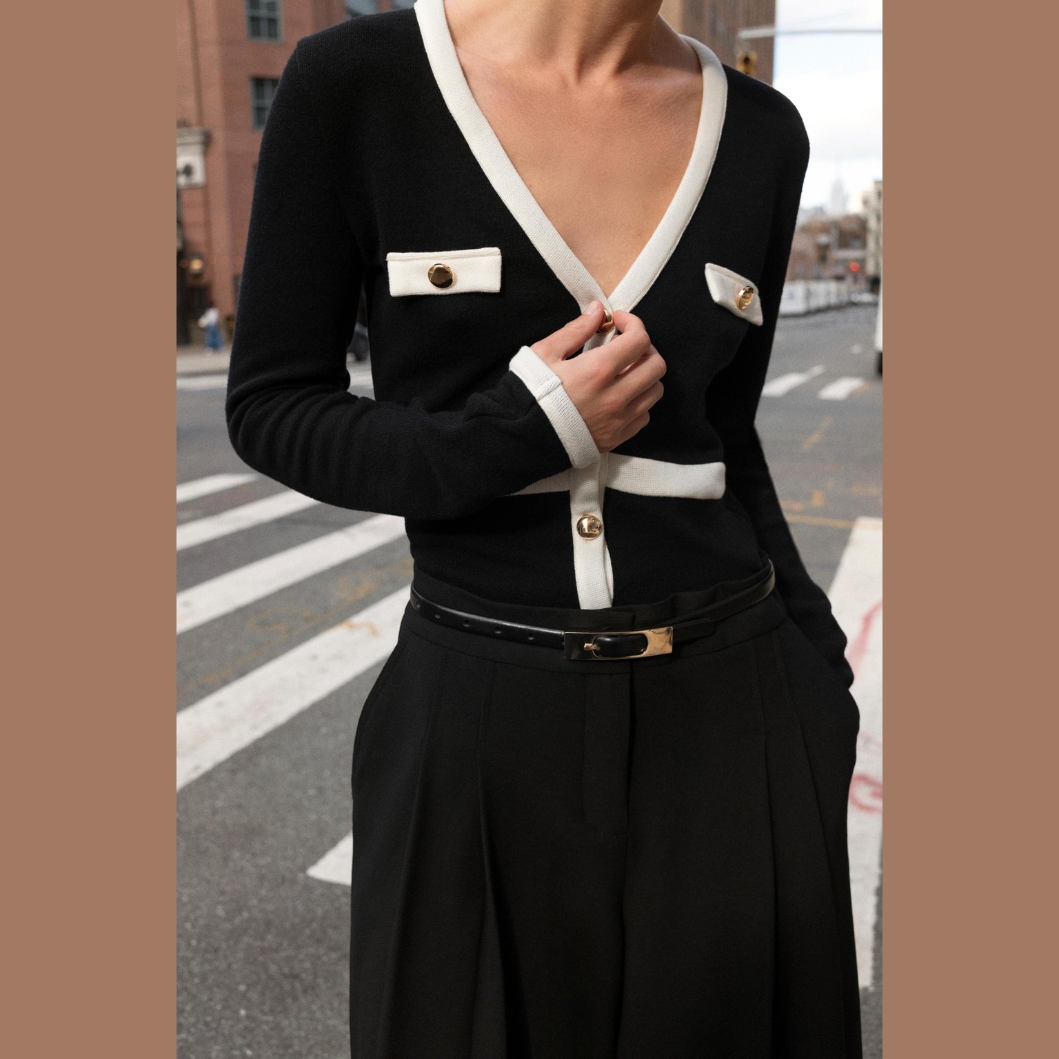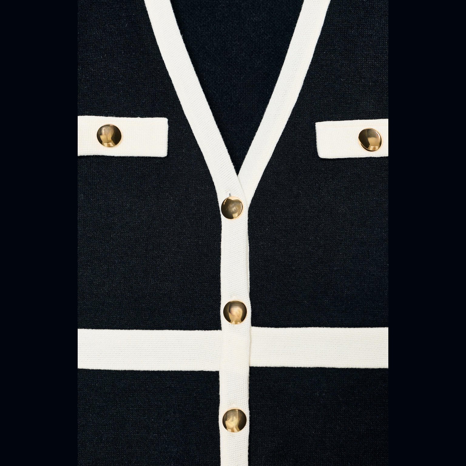 كارديغان محبوك بتفاصيل متباينة – لون طبيعي (أسود–أبيض) – Black/White (Soft Contrast Cardigan) كارديغان أنيق بلون أسود–أبيض طبيعي، مصنوع من خامة محبوكة عملية تمنح راحة وملمسًا ناعمًا، مع تصميم كلاسيكي مزود بياقة V وأكمام طويلة. يتميز بتفاصيل متباينة على الحواف وجيوب أمامية وهمية، مع أزرار معدنية للإغلاق تضيف لمسة عصرية أنيقة. قطعة مثالية للتنسيقات اليومية الكاجوال الأنيقة أو كطبقة إضافية في المواسم الانتقالية.