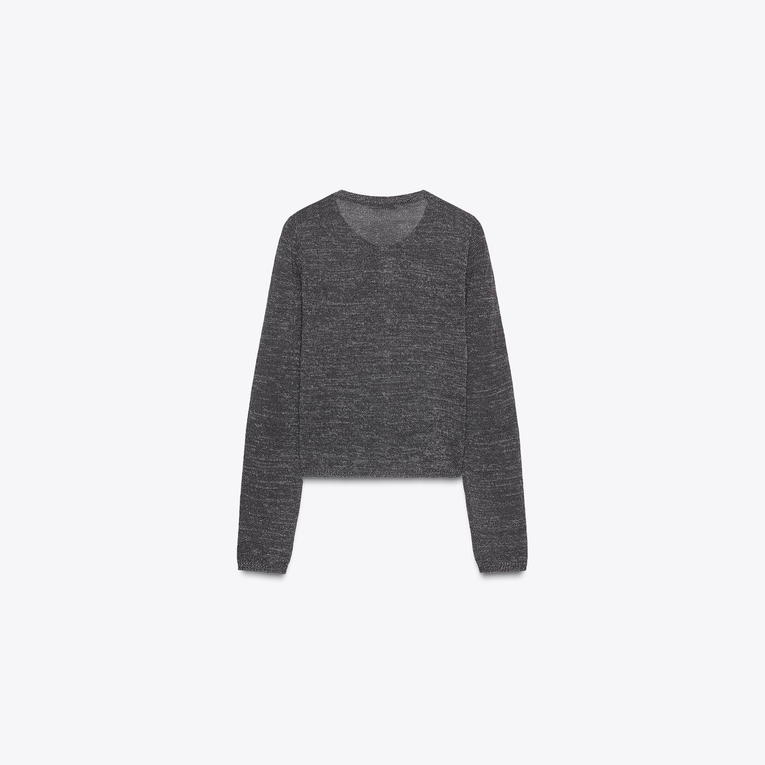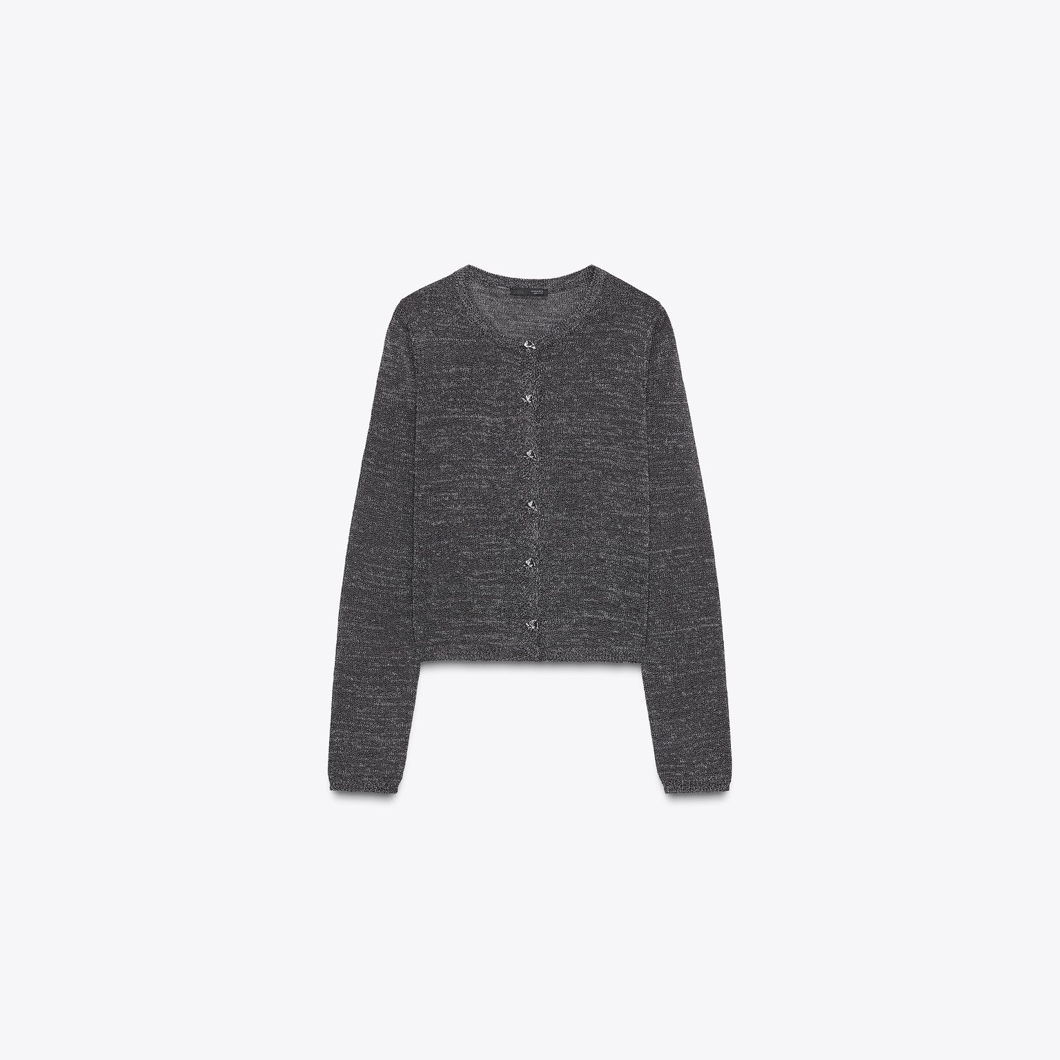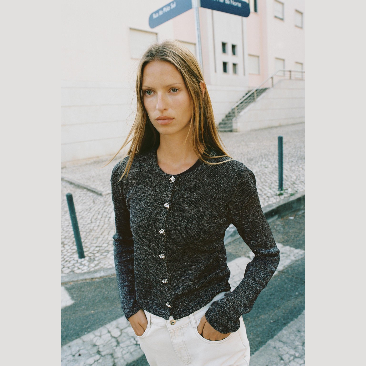 - التصميم: كارديغان محبوك بخيوط معدنية وأزرار (Metallic Thread Button Cardigan)